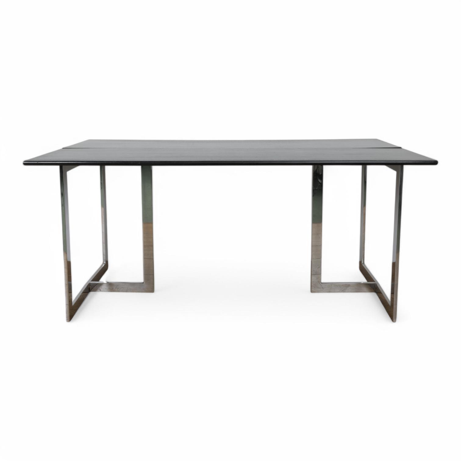 met opklapbaar zwart houten blad (scharnieren def). Op twee opklapbare verchroomd stalen onderstellen