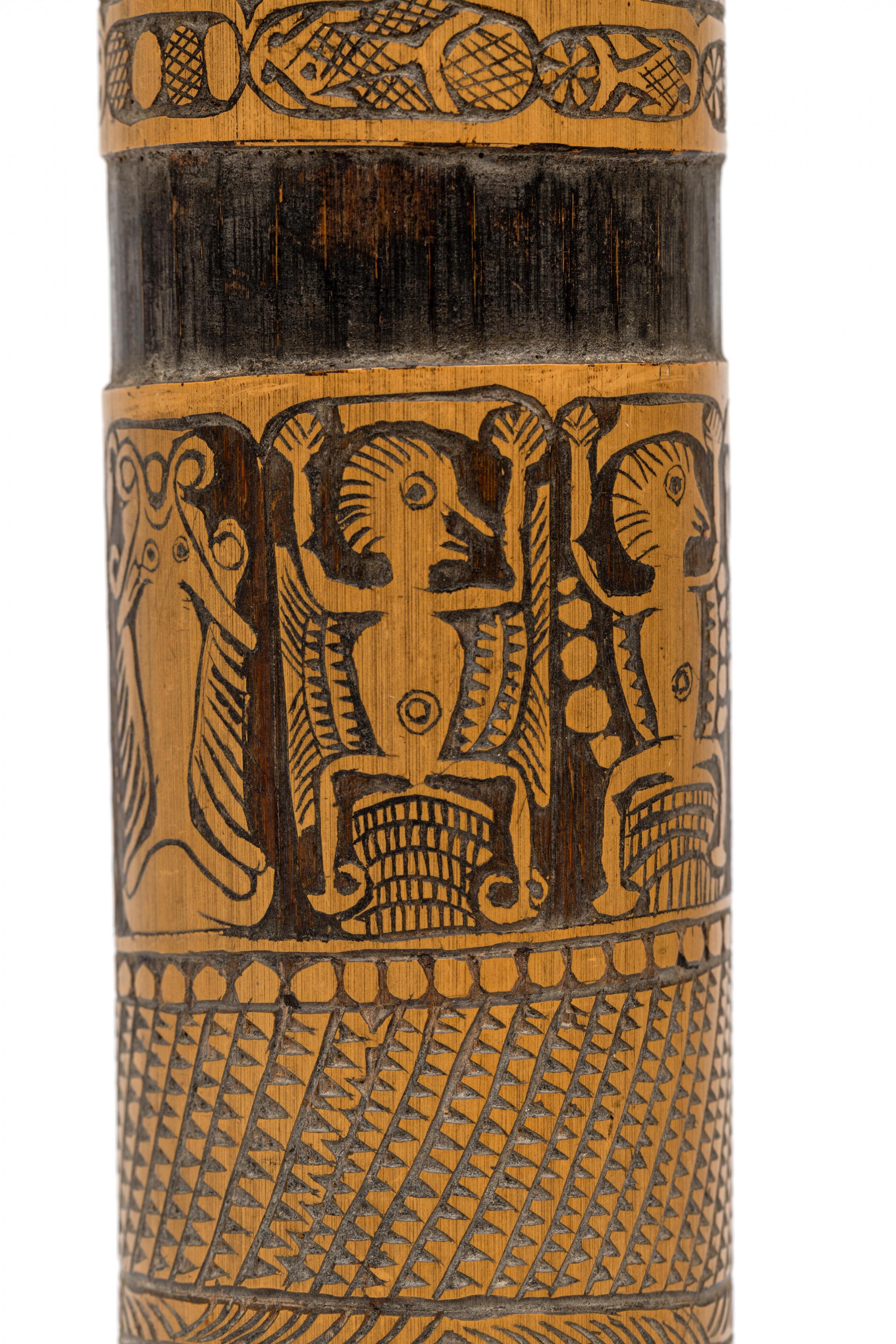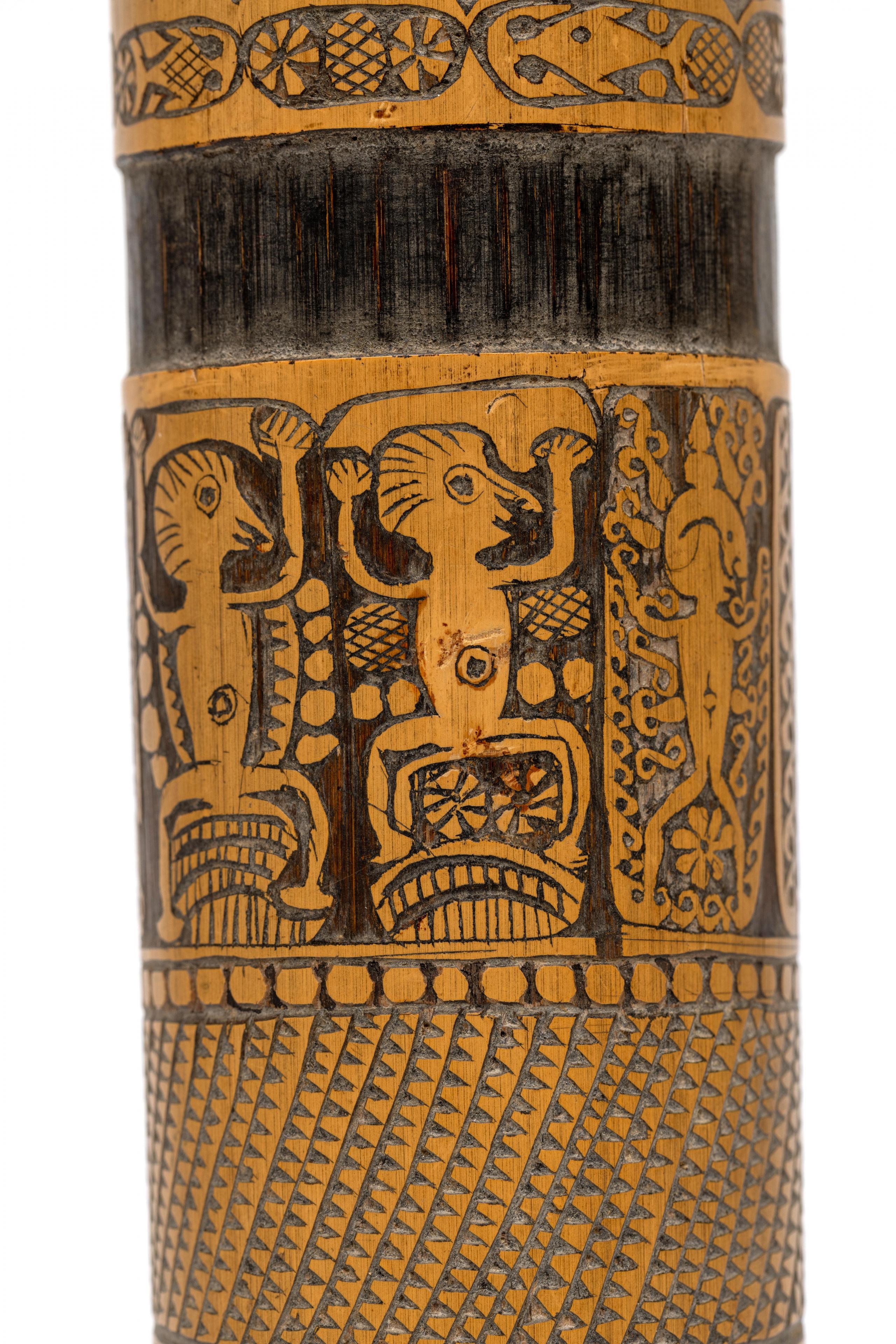 elaborately carved with a geometric pattern, one band showing various dancing anthropomorphic figures.