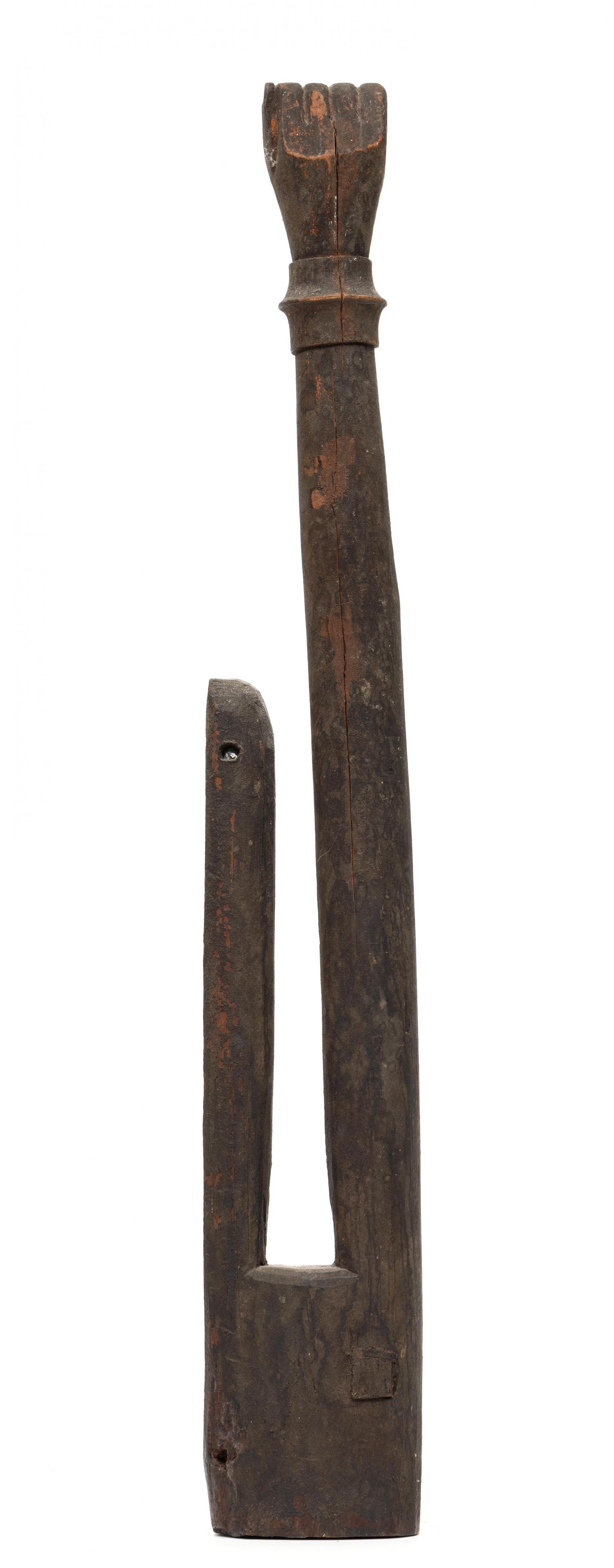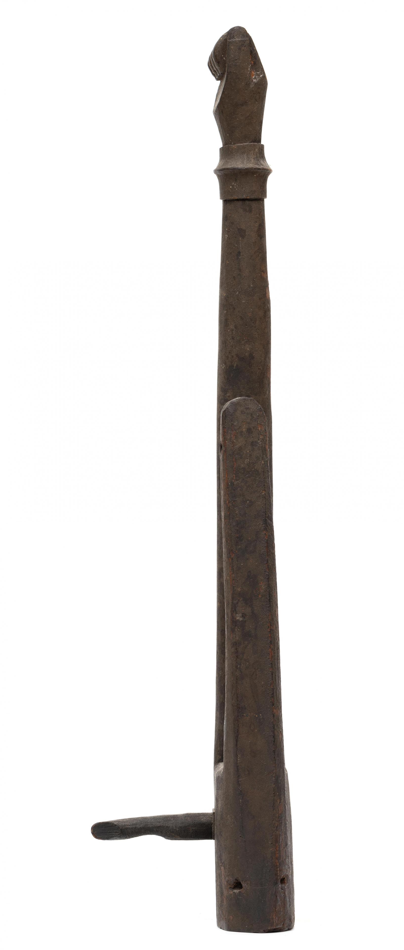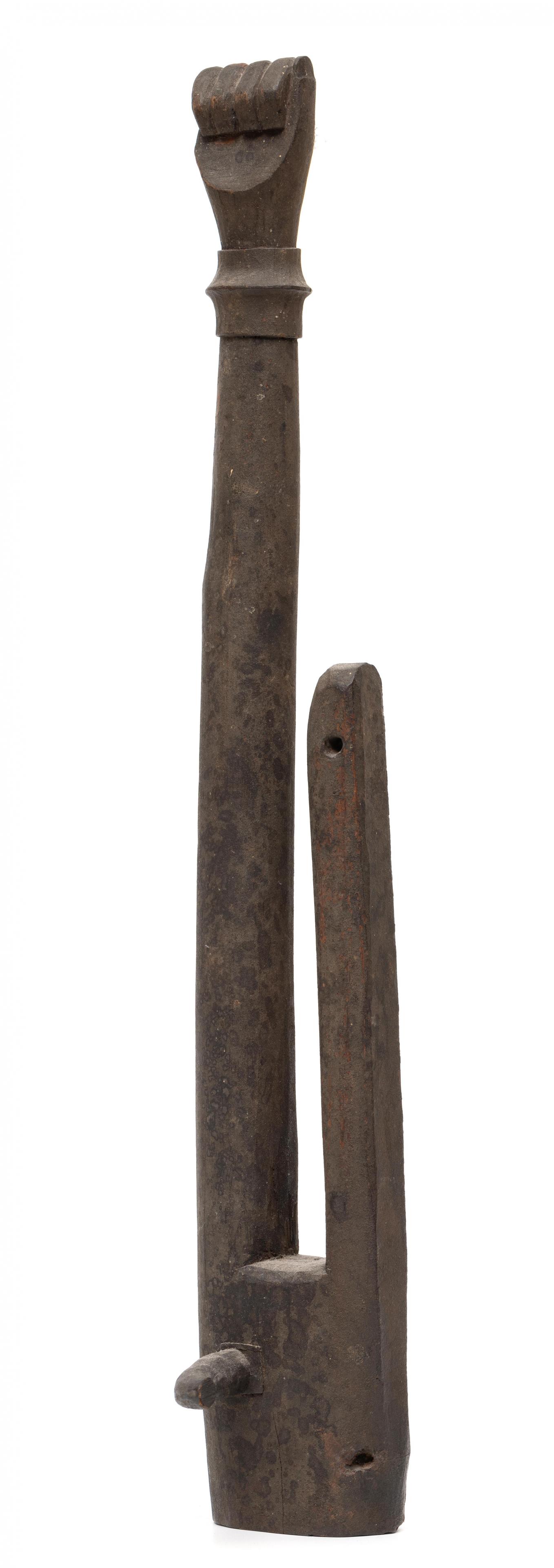 showing a raised arm with armband and a paralel projection with two holes, encrusted black patina.