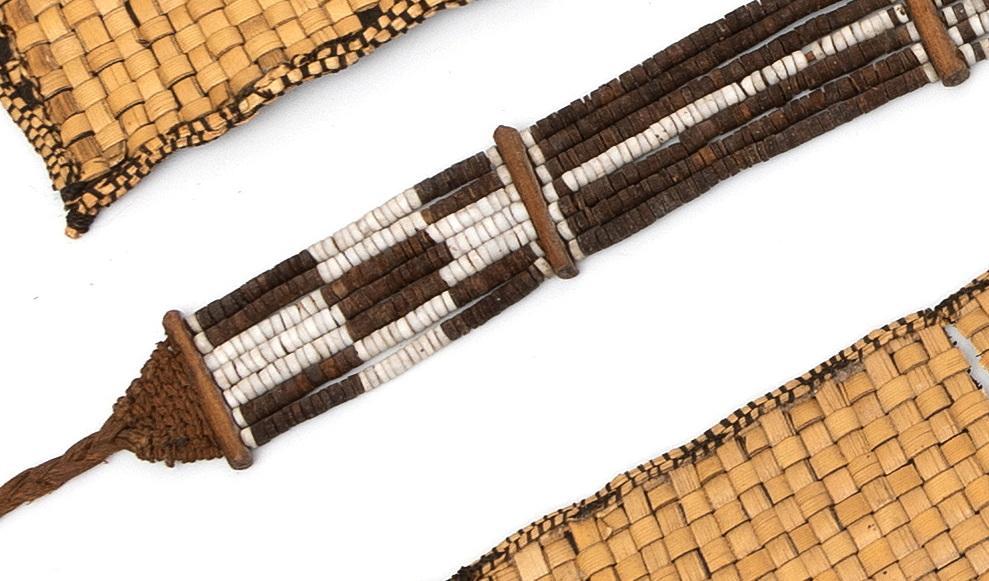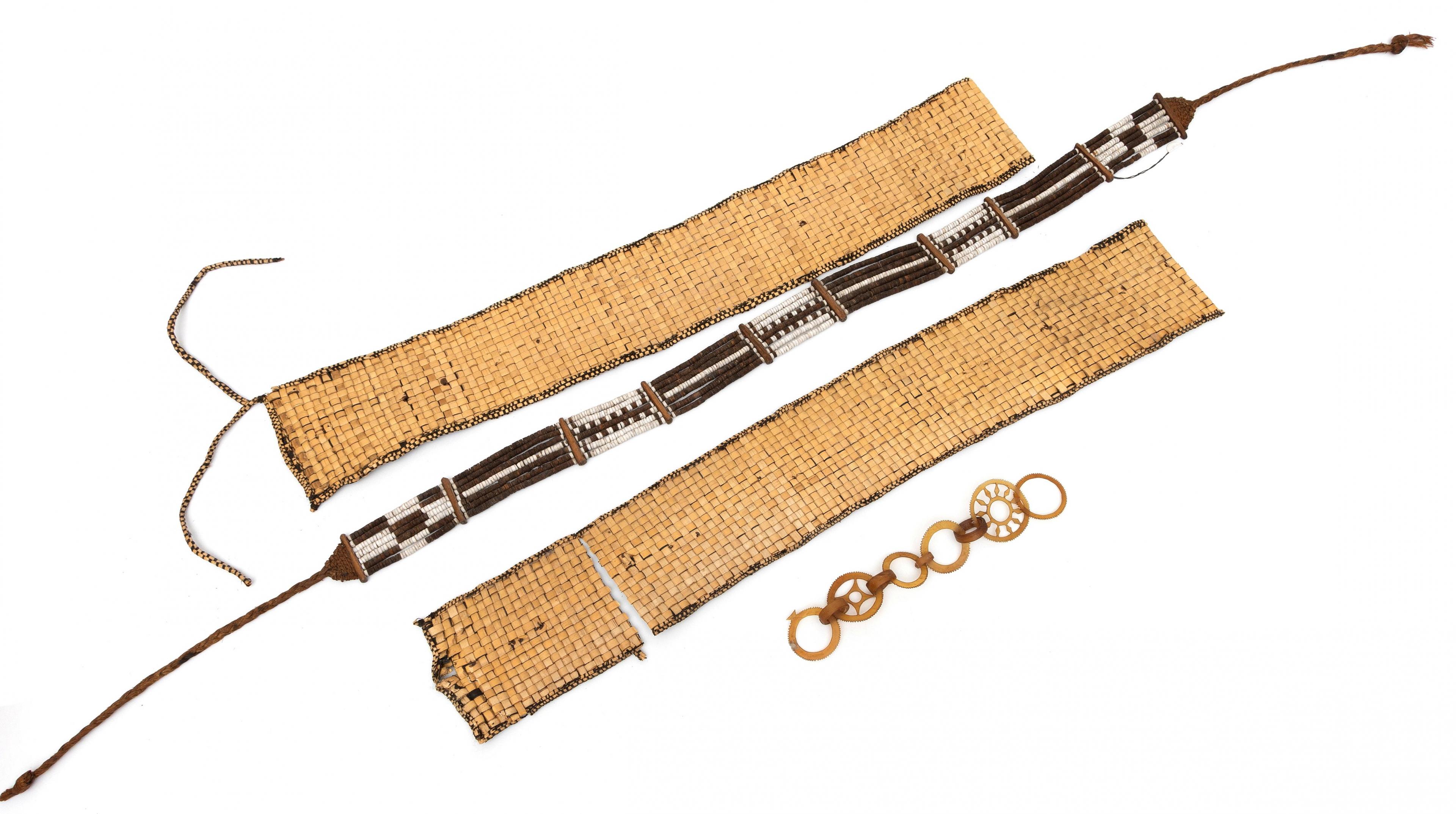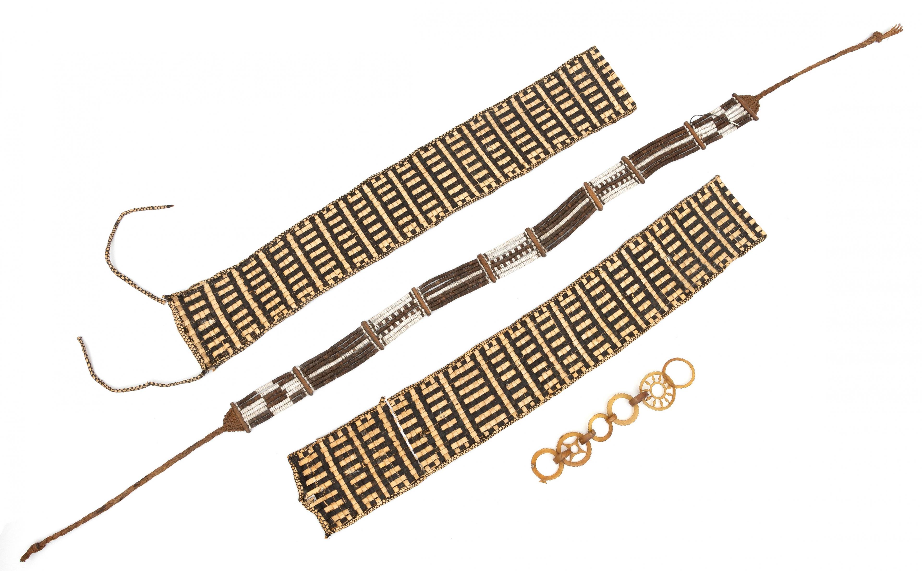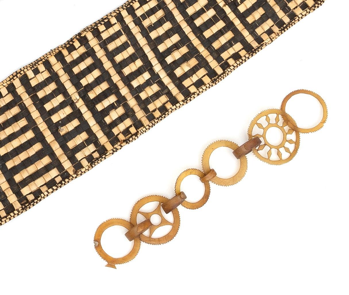 consisting a very fine horn ear pendant of ten interlocking serrated circles. A girdle consting of seven strings and wooden spacers and two plaited plantfiber ornaments of blackened pandan leaves. (in three parts)