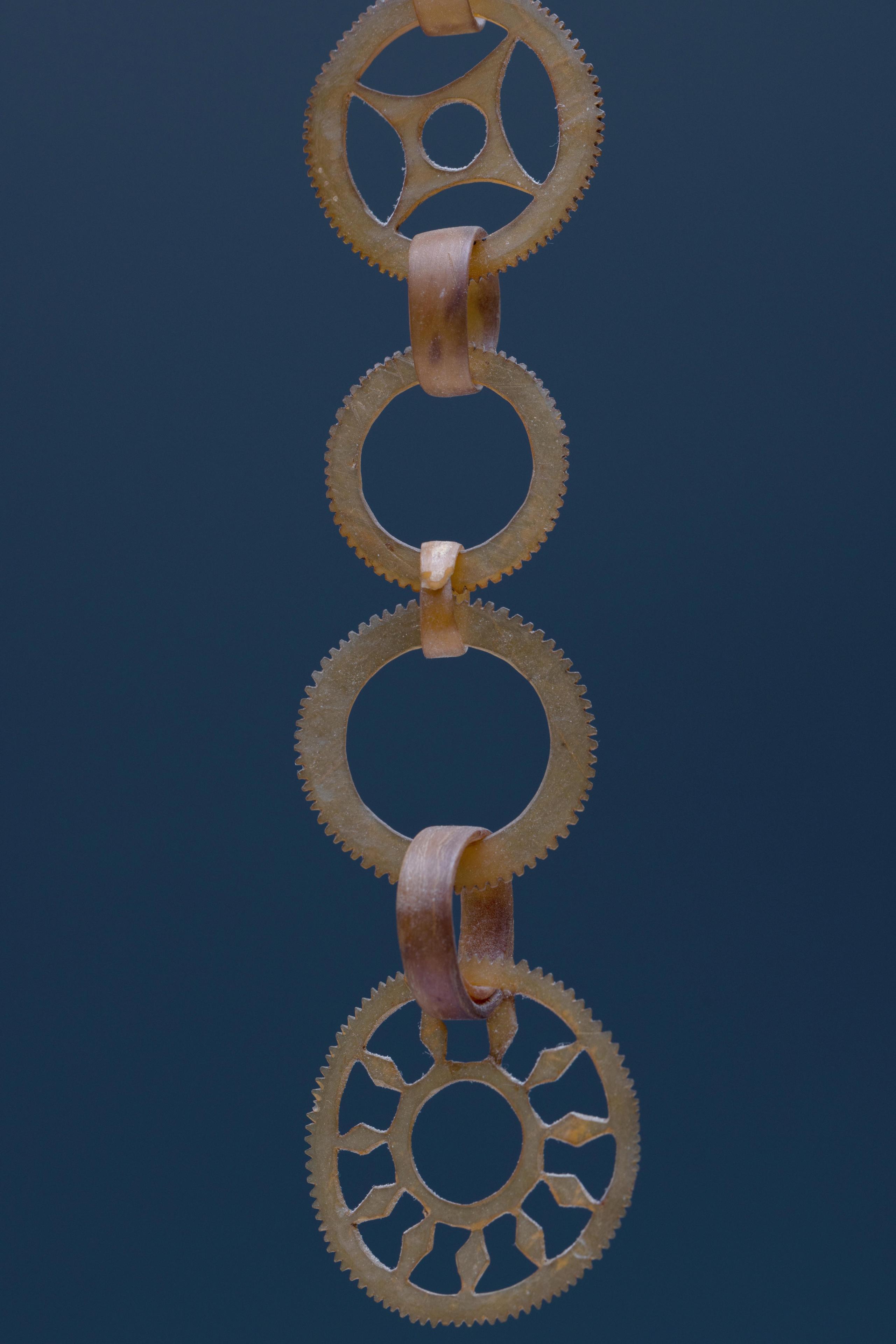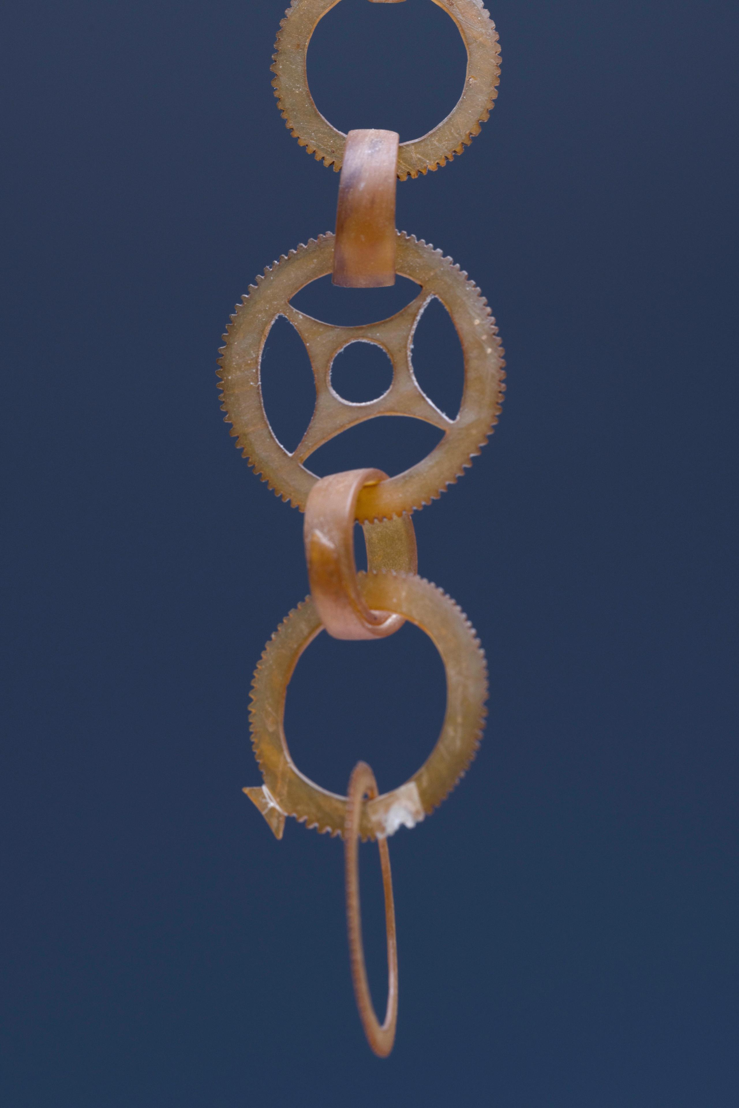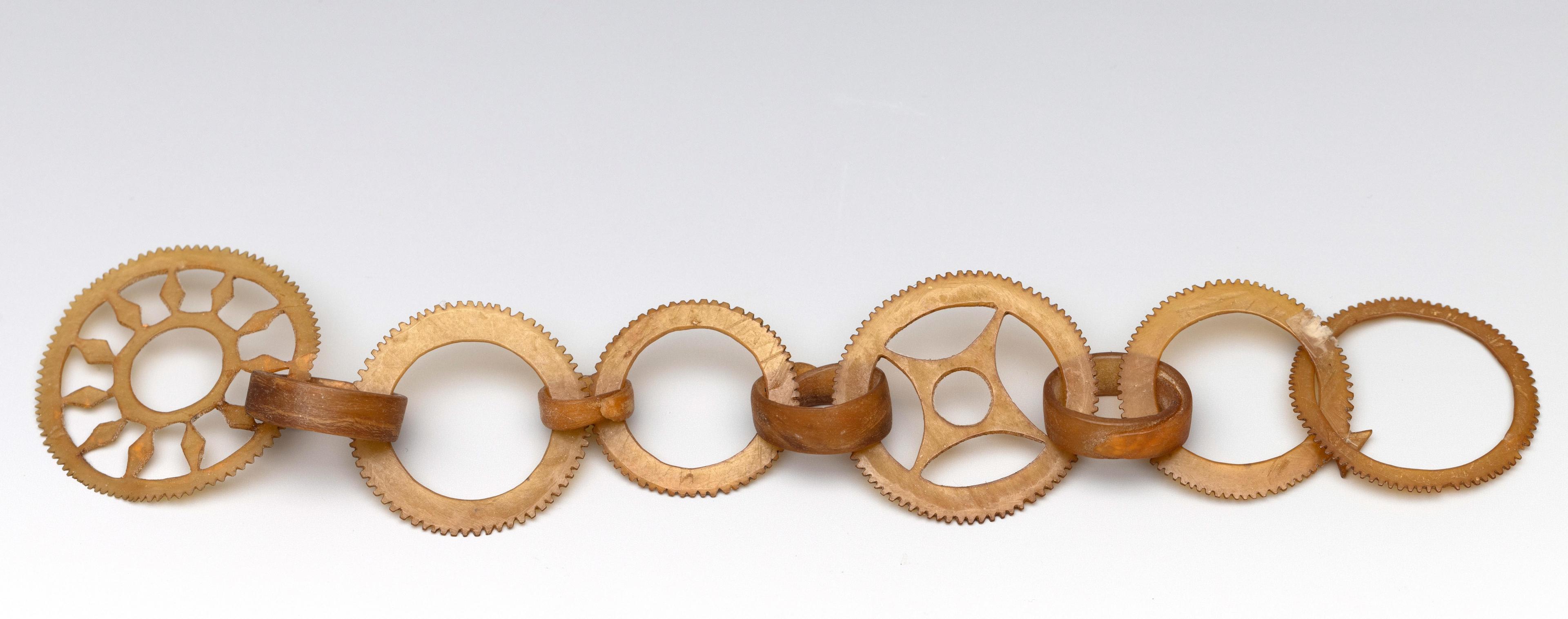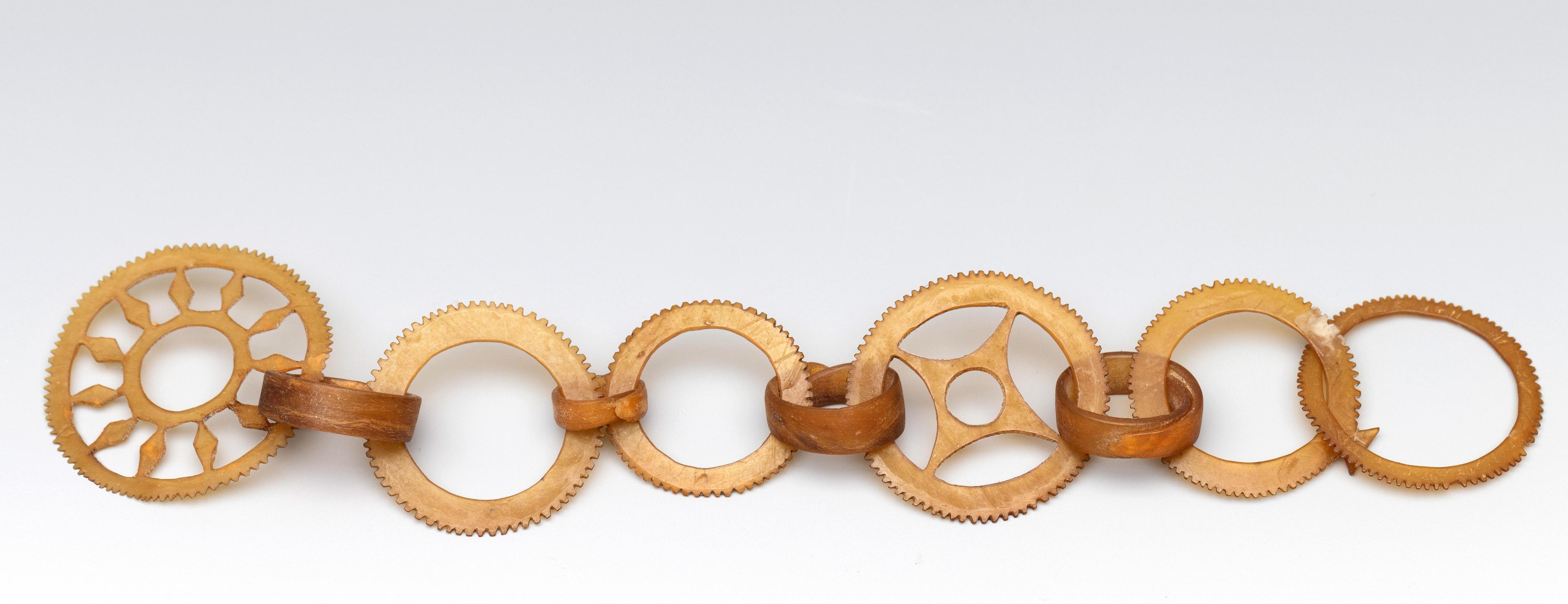 consisting a very fine horn ear pendant of ten interlocking serrated circles. A girdle consting of seven strings and wooden spacers and two plaited plantfiber ornaments of blackened pandan leaves. (in three parts)
