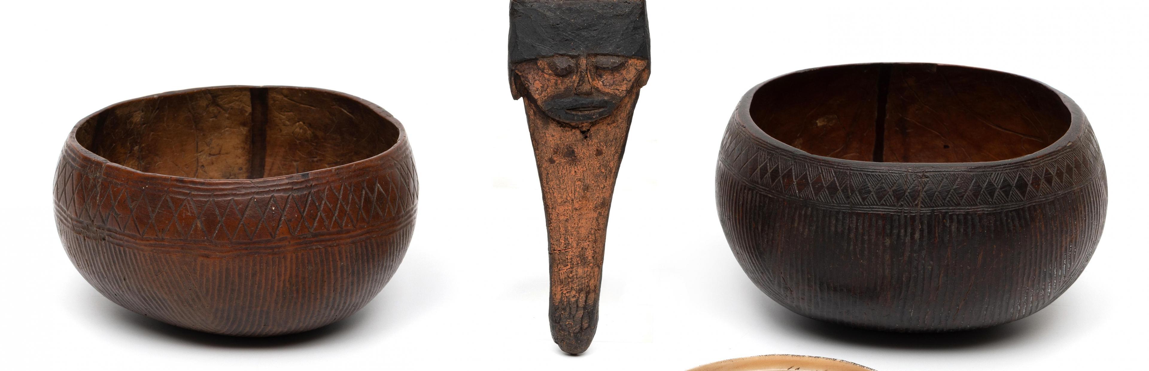 Herewith, Philippines, Kalinga, two coconut shell bowls with a fine grooved pattern.