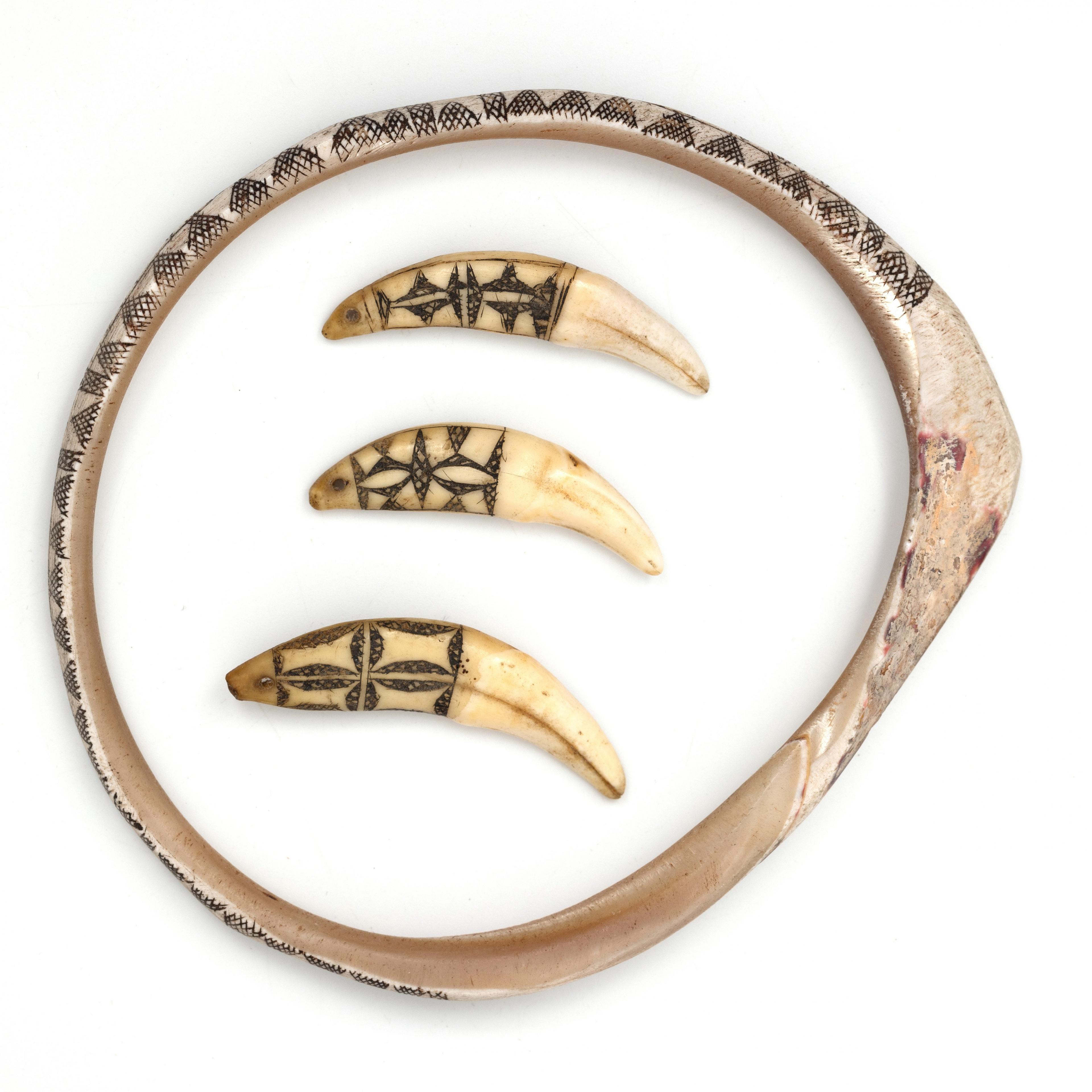 Solomon Islands, Santa Cruz, three engraved dog teeth pendants, an engraved trochus shell armband and a comb.