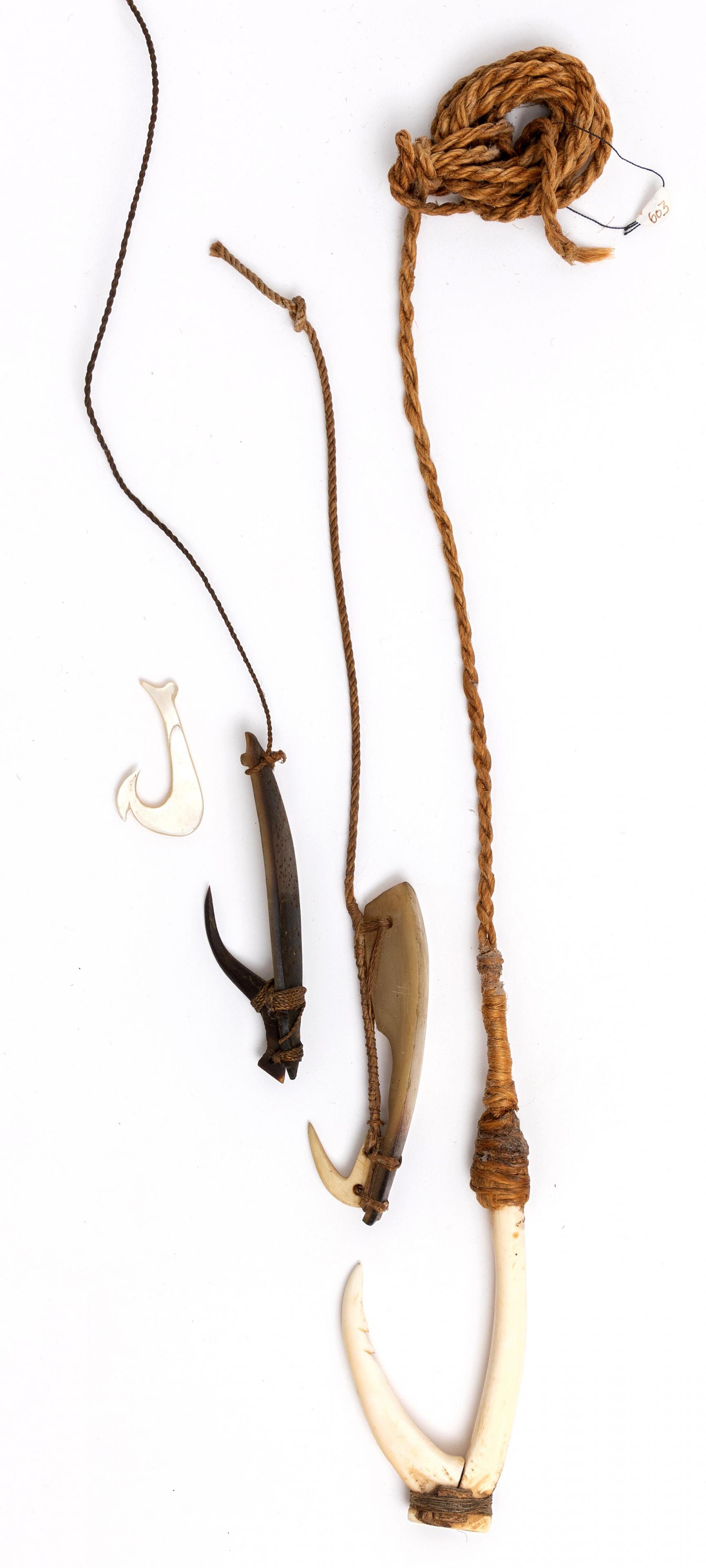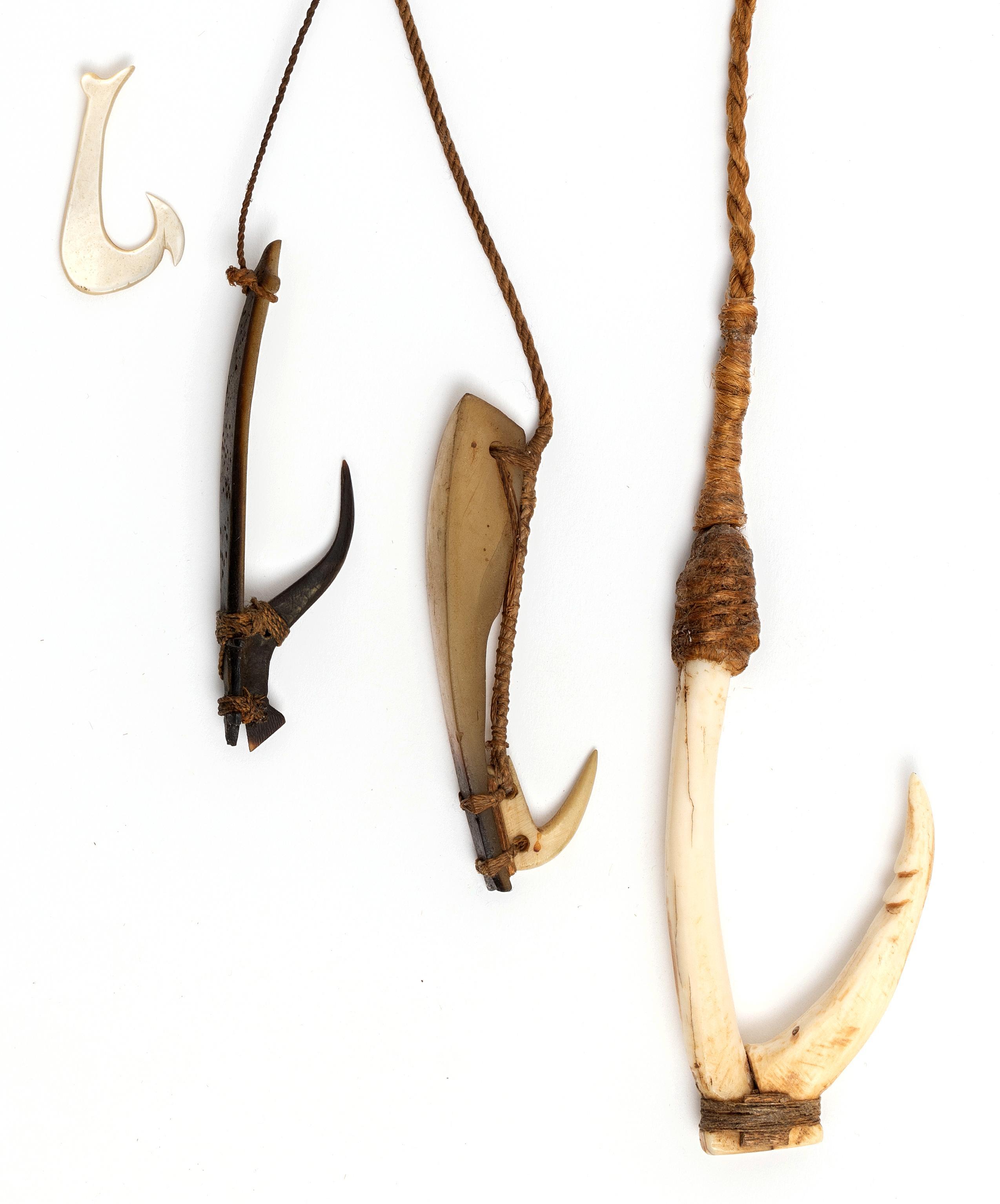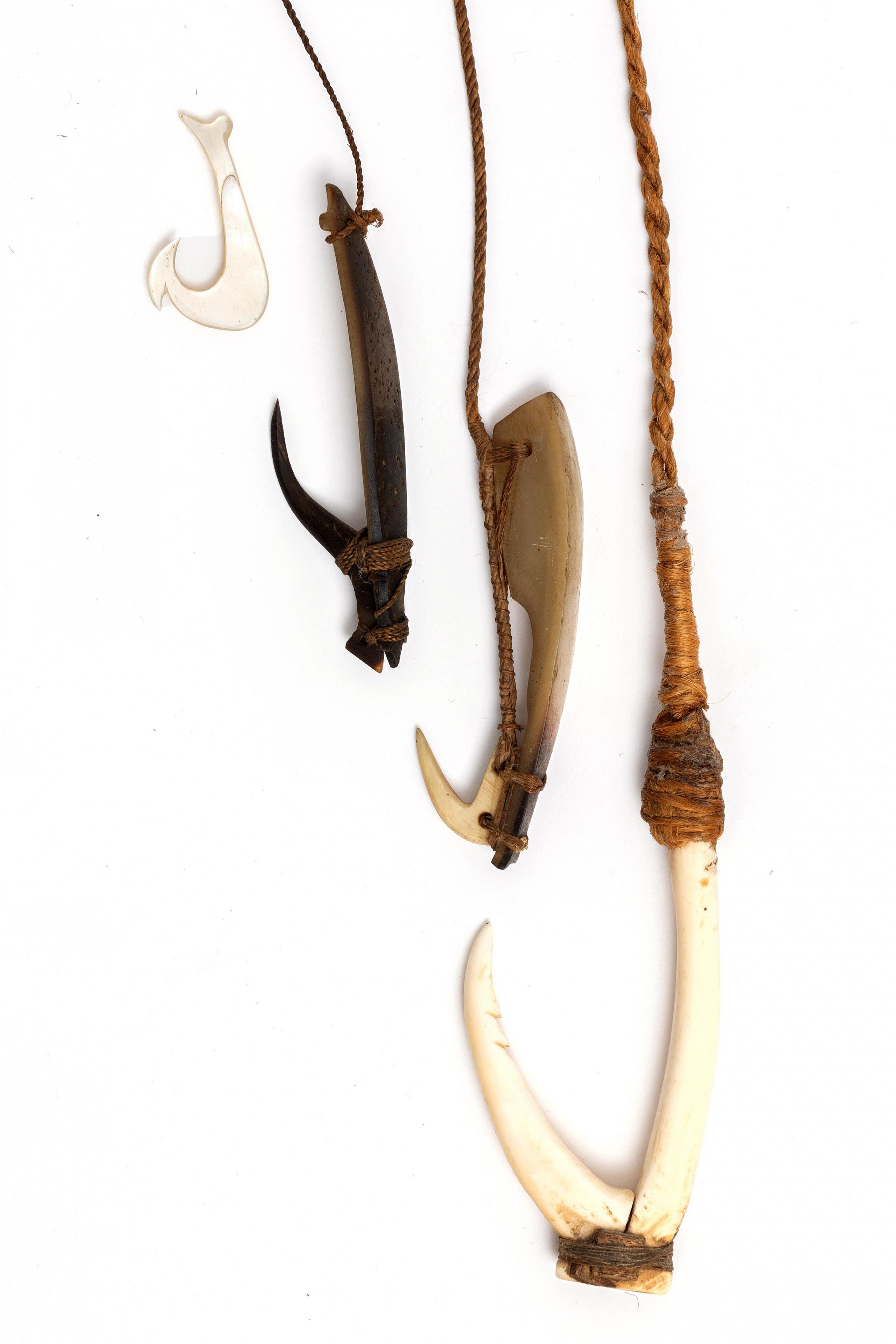 marine ivory, mother of pearl, turtle shell and plant fiber.