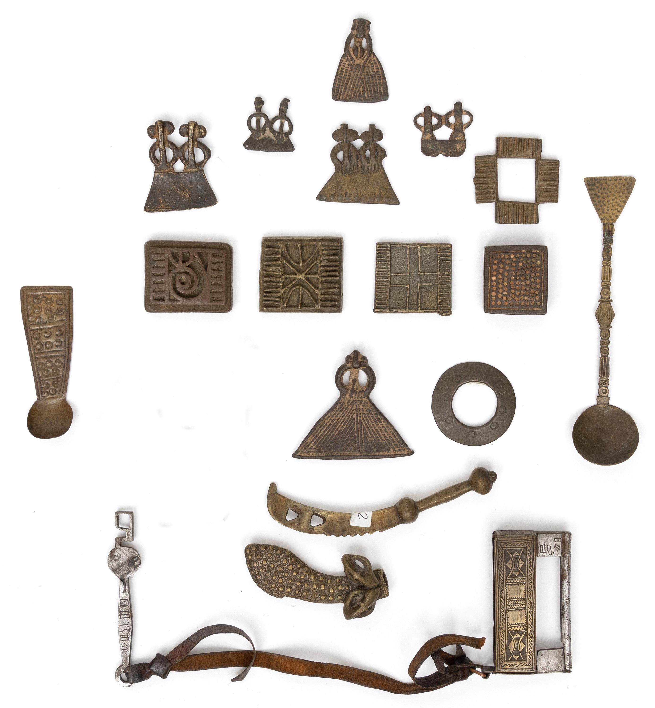 consisting of four anthropomorphic groups, five zoomorphic, ten others; herewith Ivory Coast eight brass amulets, mainly couples