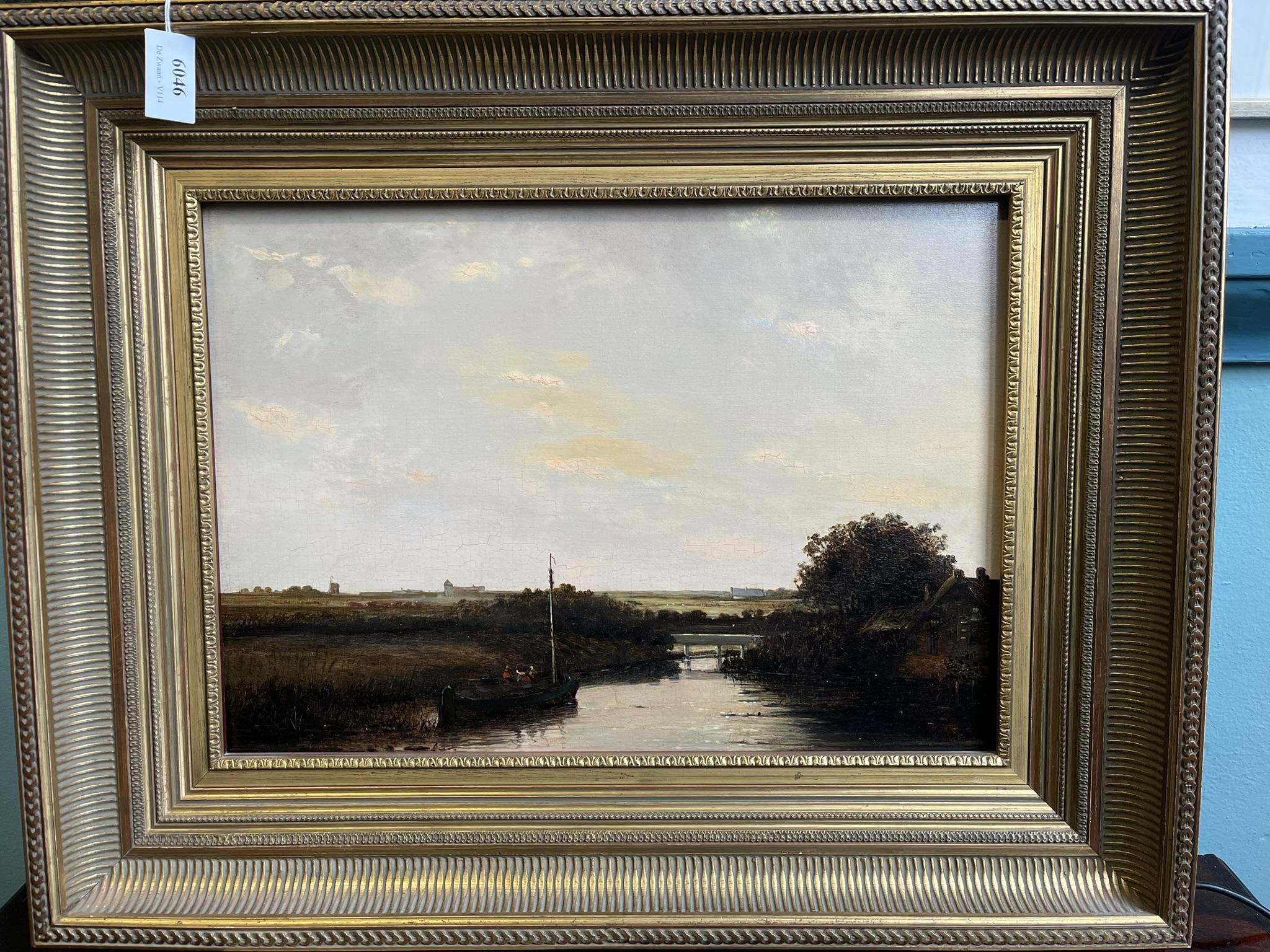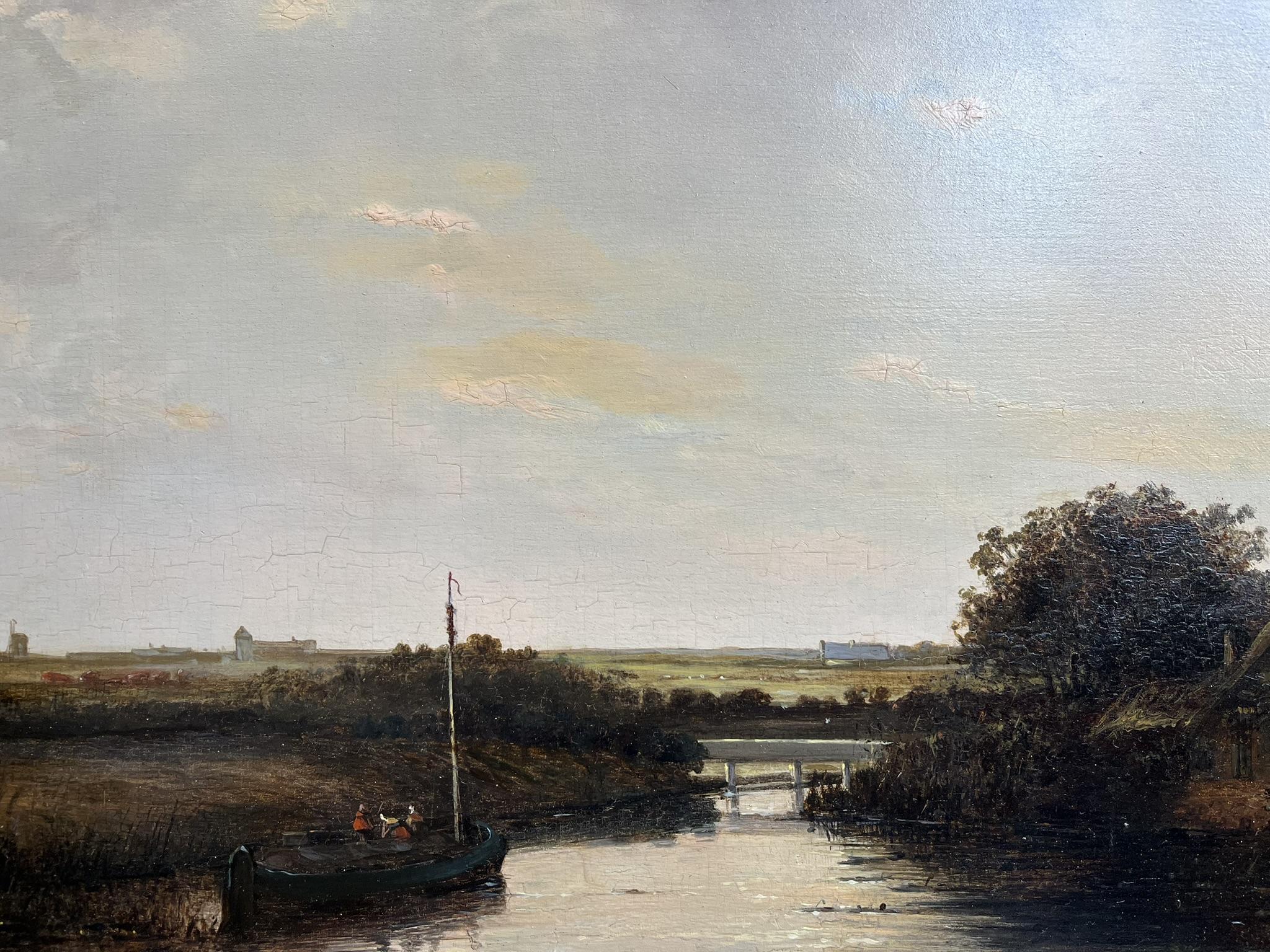 Uitgestrekt landschap met figuren in een boot bij een witte brug