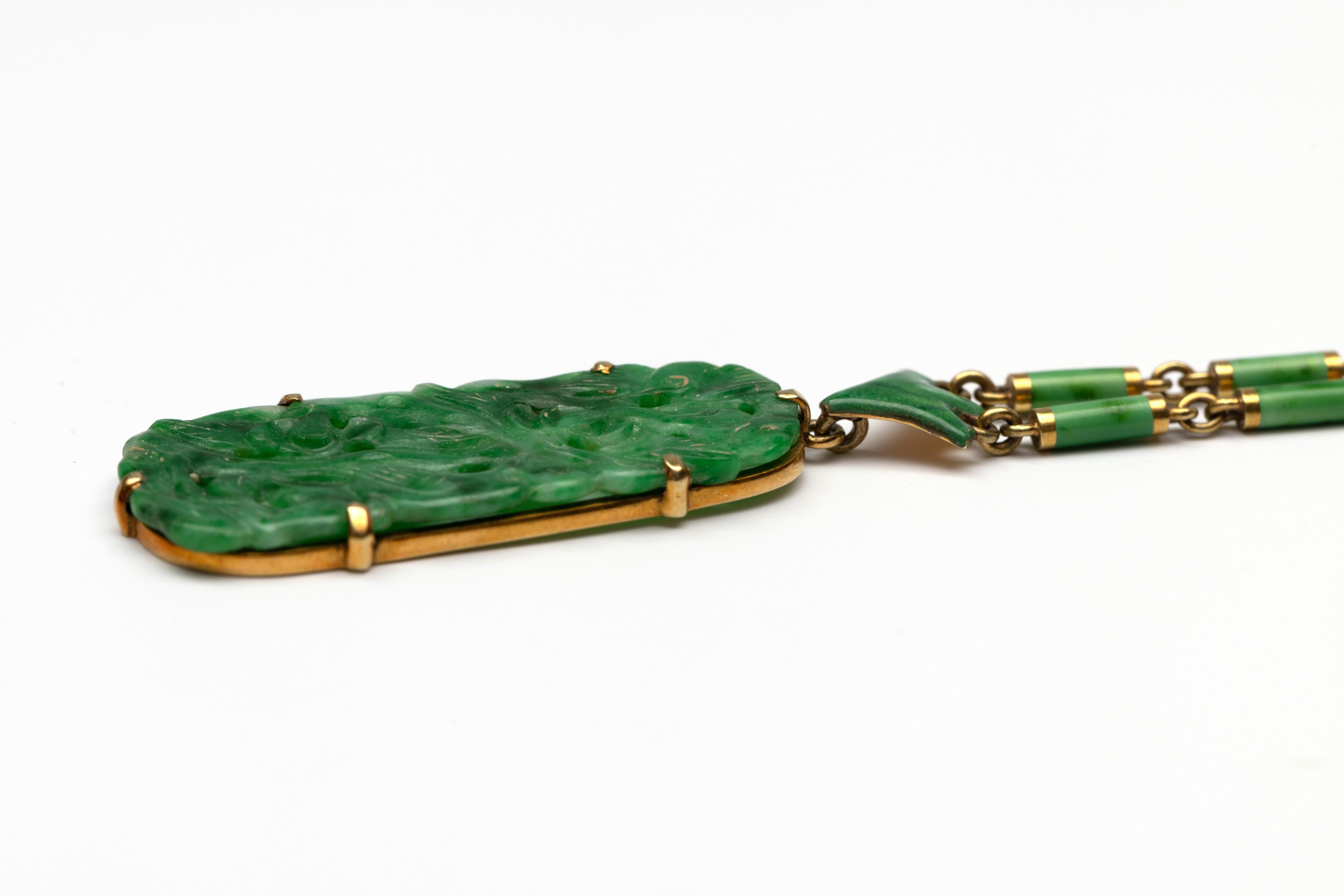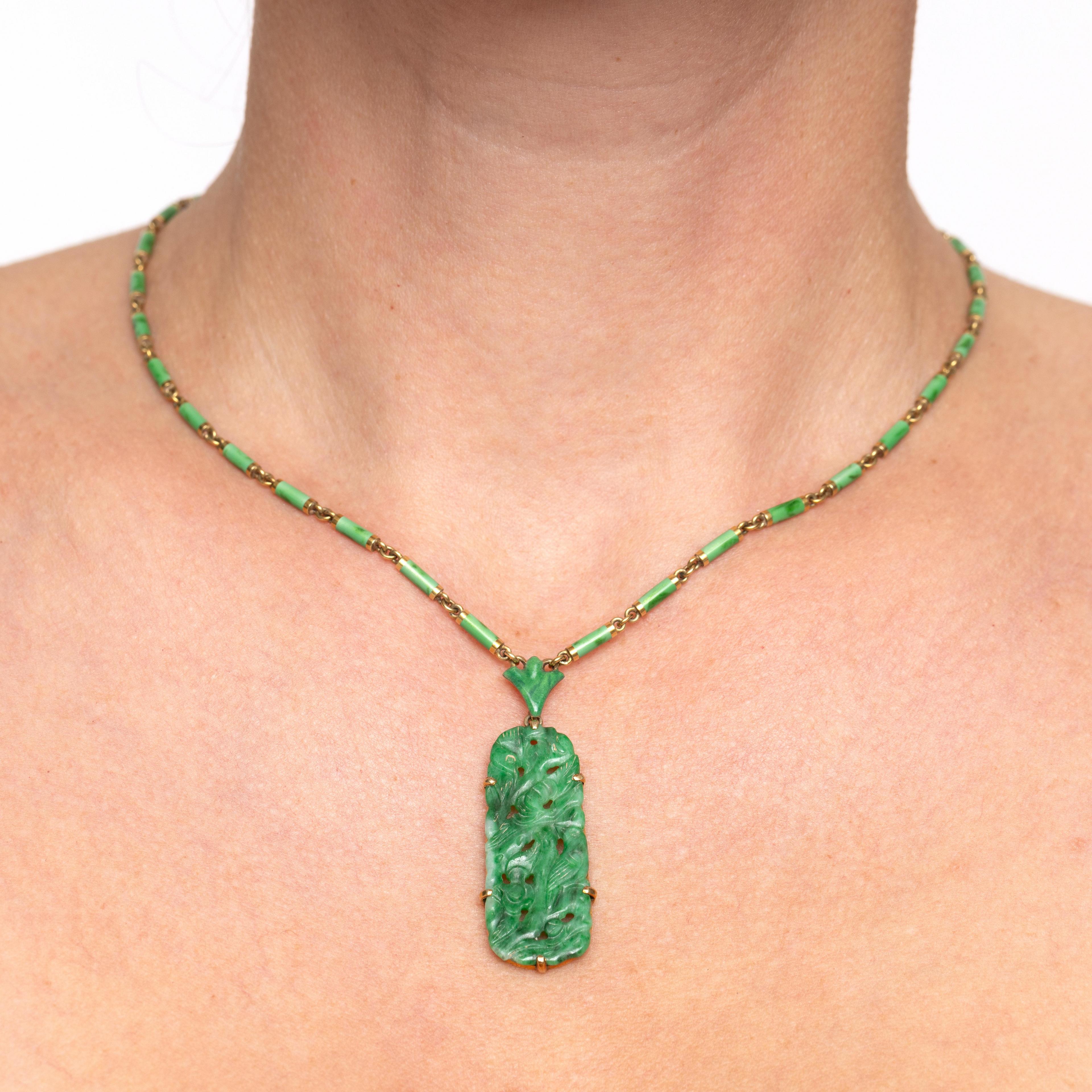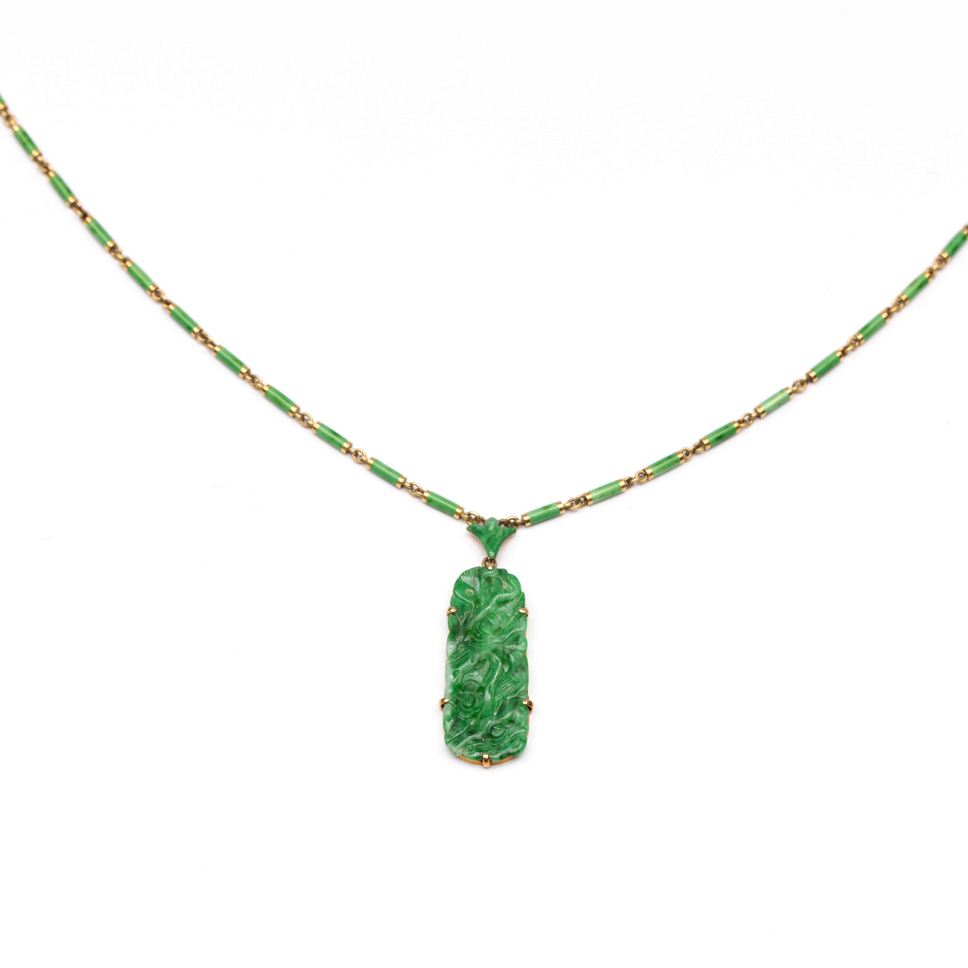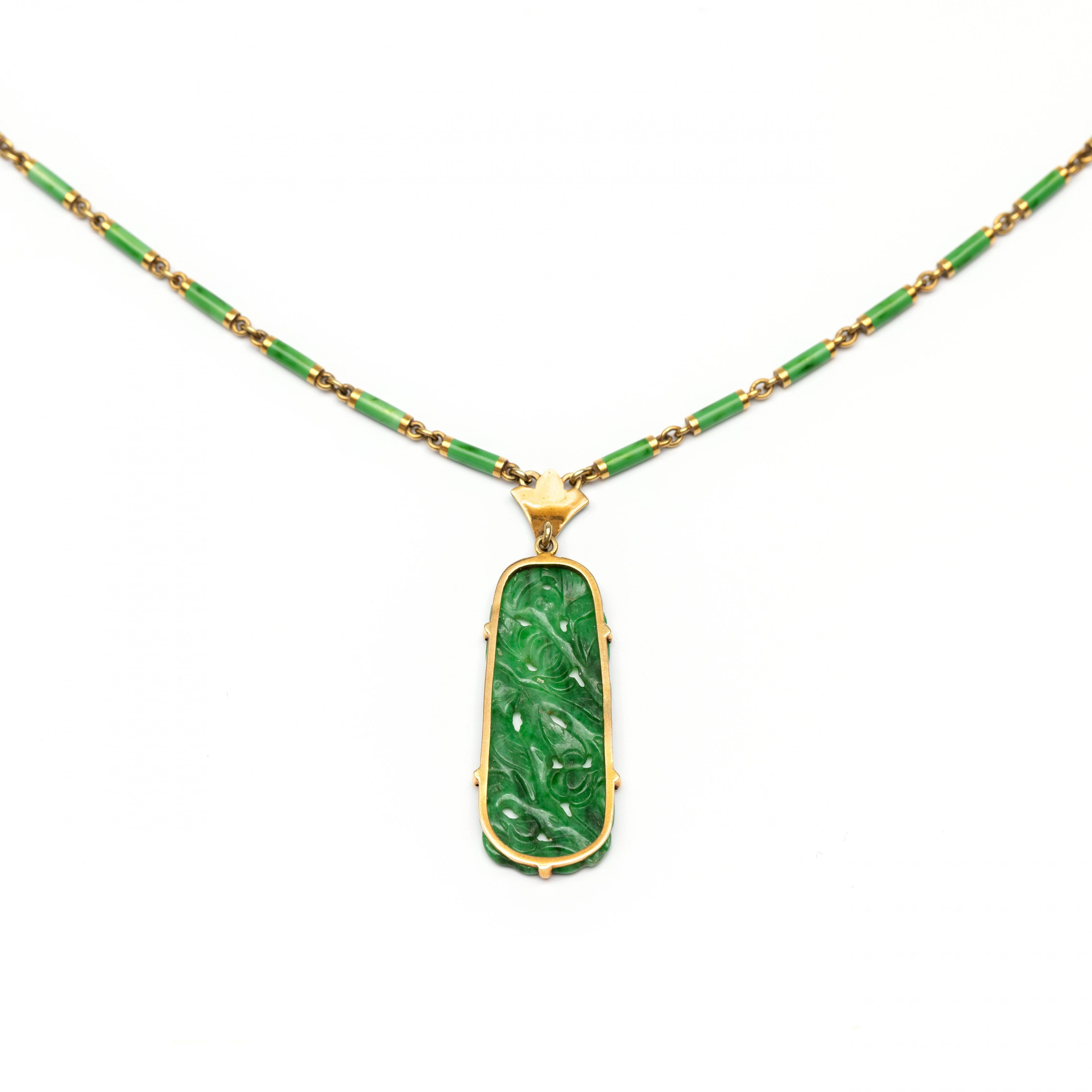 14 k. Gold necklace with a carved jade pendant, depicting flowers and leaves. The necklace consists of cylindrical links with green enamel.