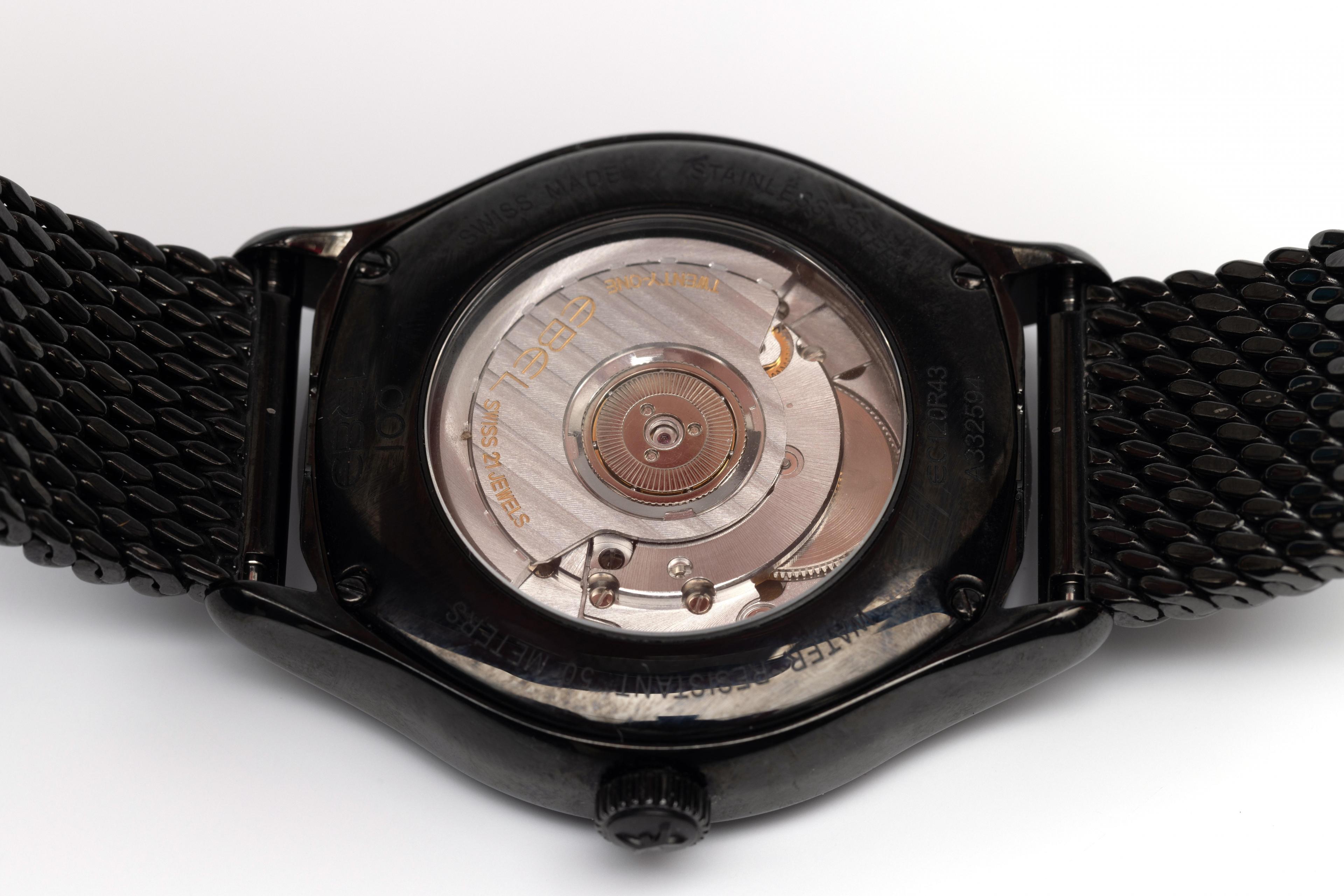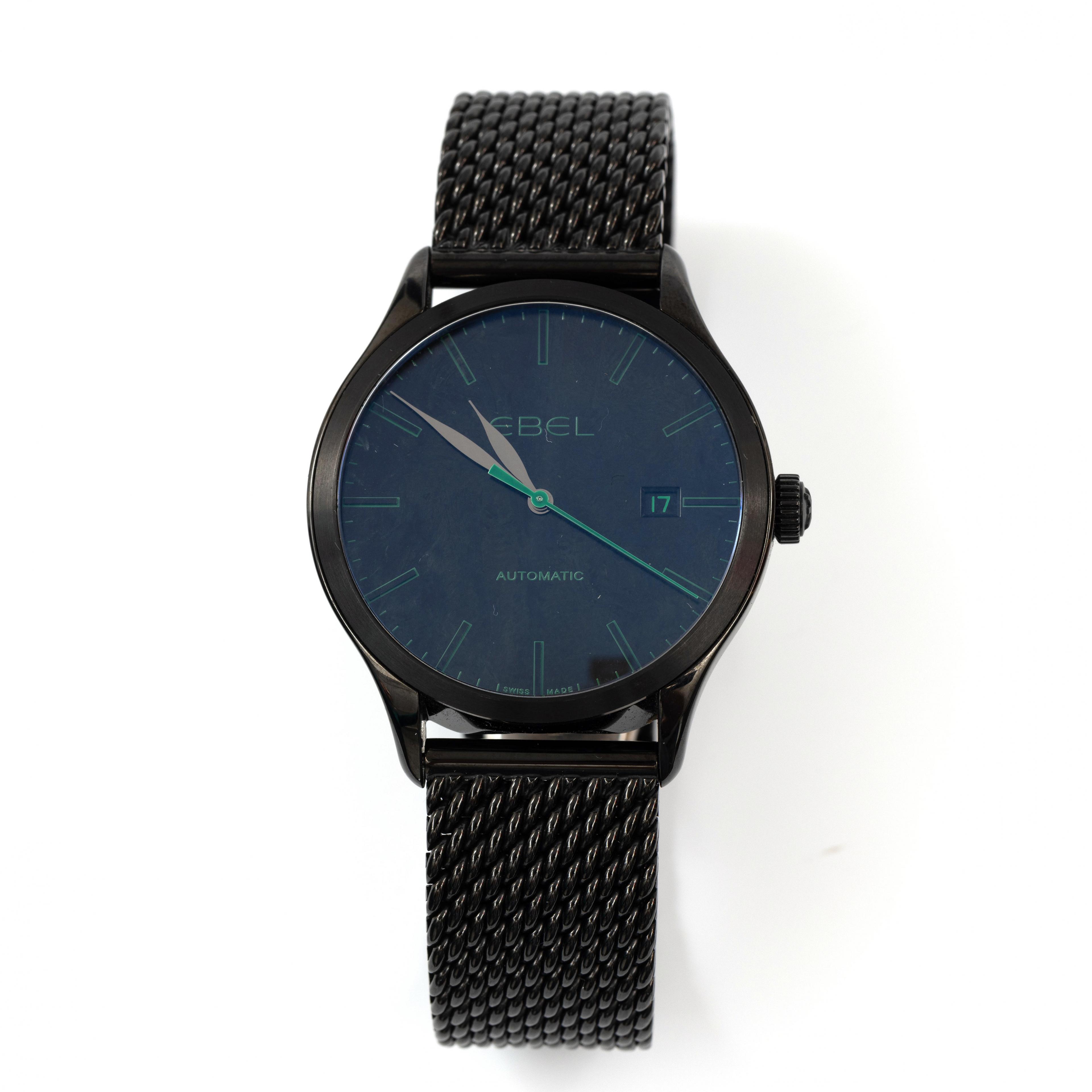Ebel, blackened steel wristwatch. Automatic, with black dial with batons on the hours and date display on the three. The back is transparent. On a black Milanese strap