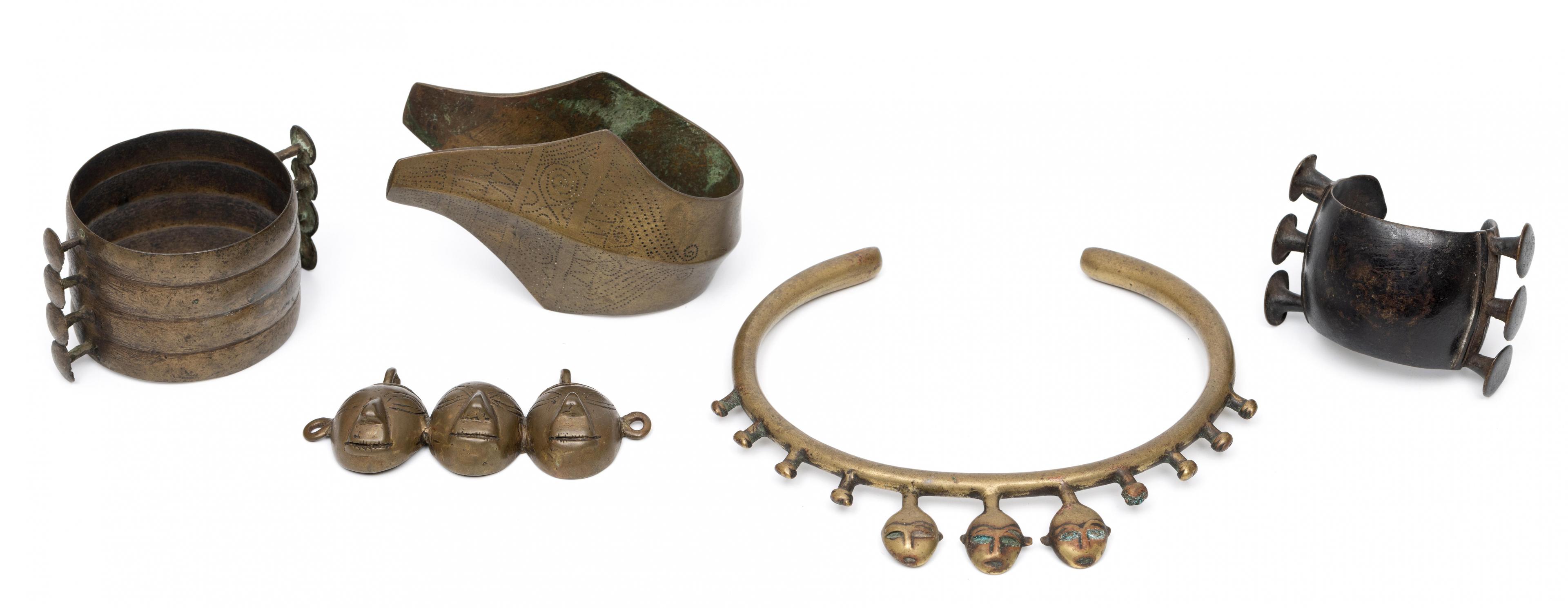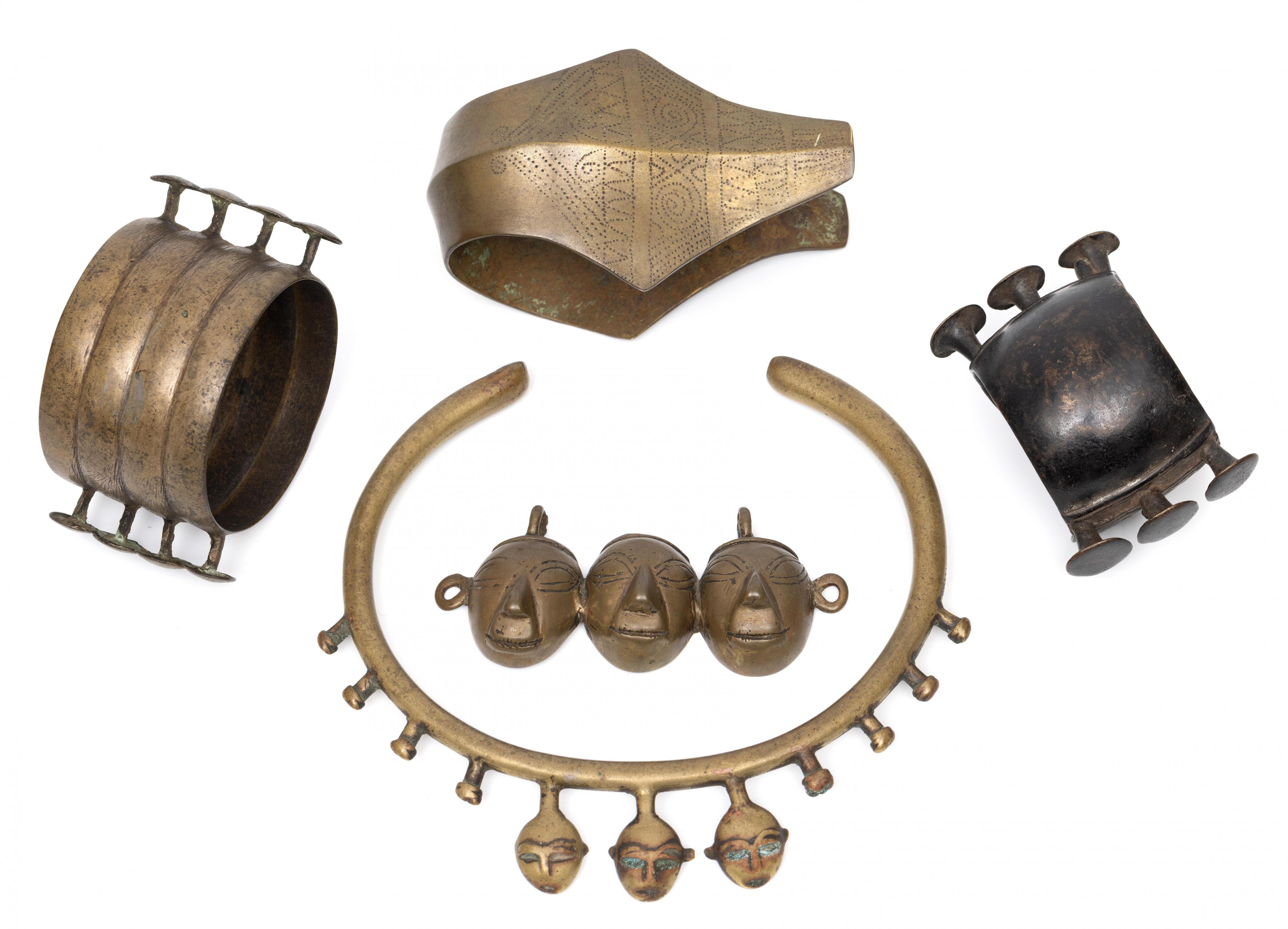Tangkhul, a brass ornament with a dotted pattern on both sides, two heirloom copper armbands, a brass pendant of three heads and a necklace showing three heads.