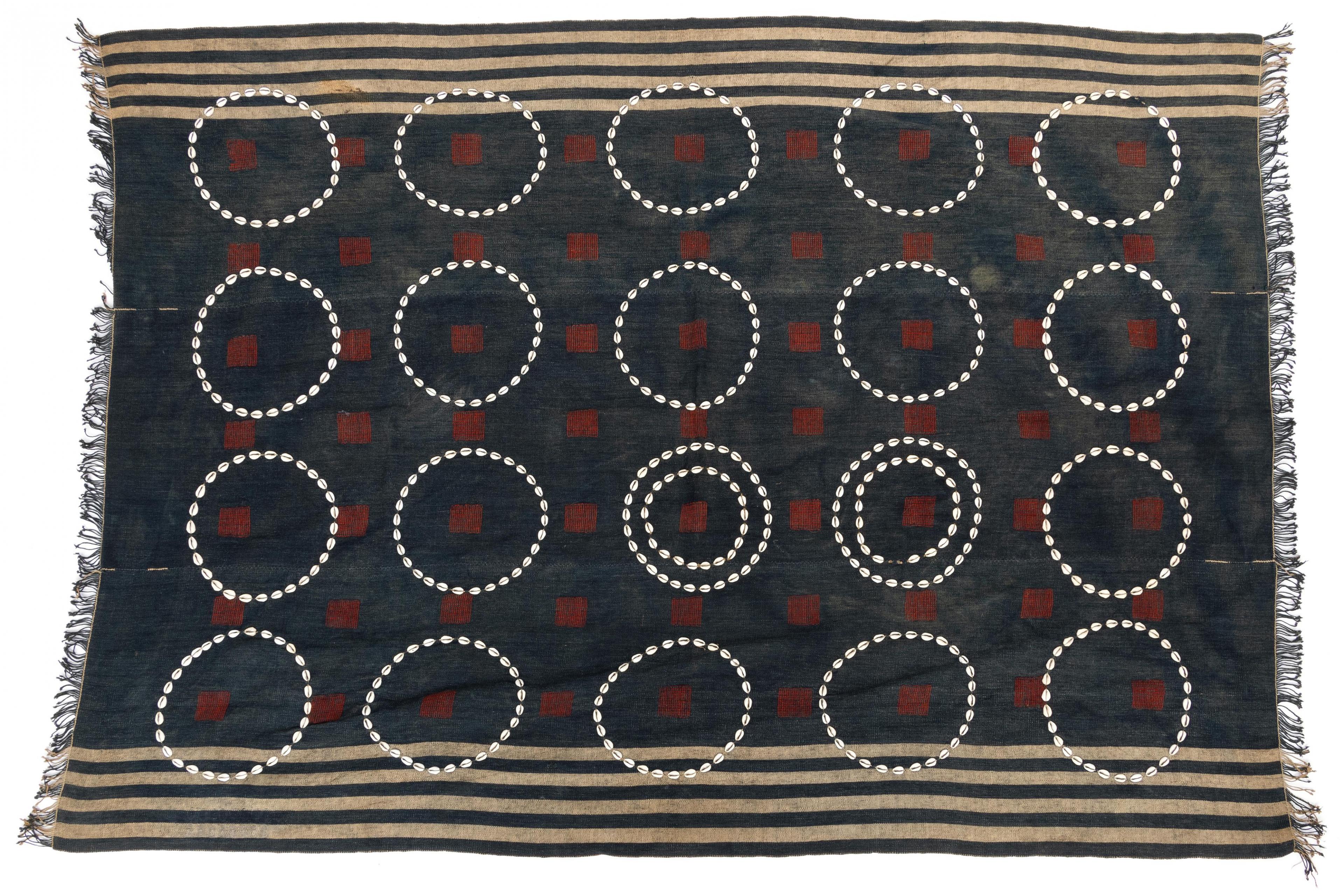 in traditional colors, decorated with square supplementary weft in red and stitched cowry shell circles.