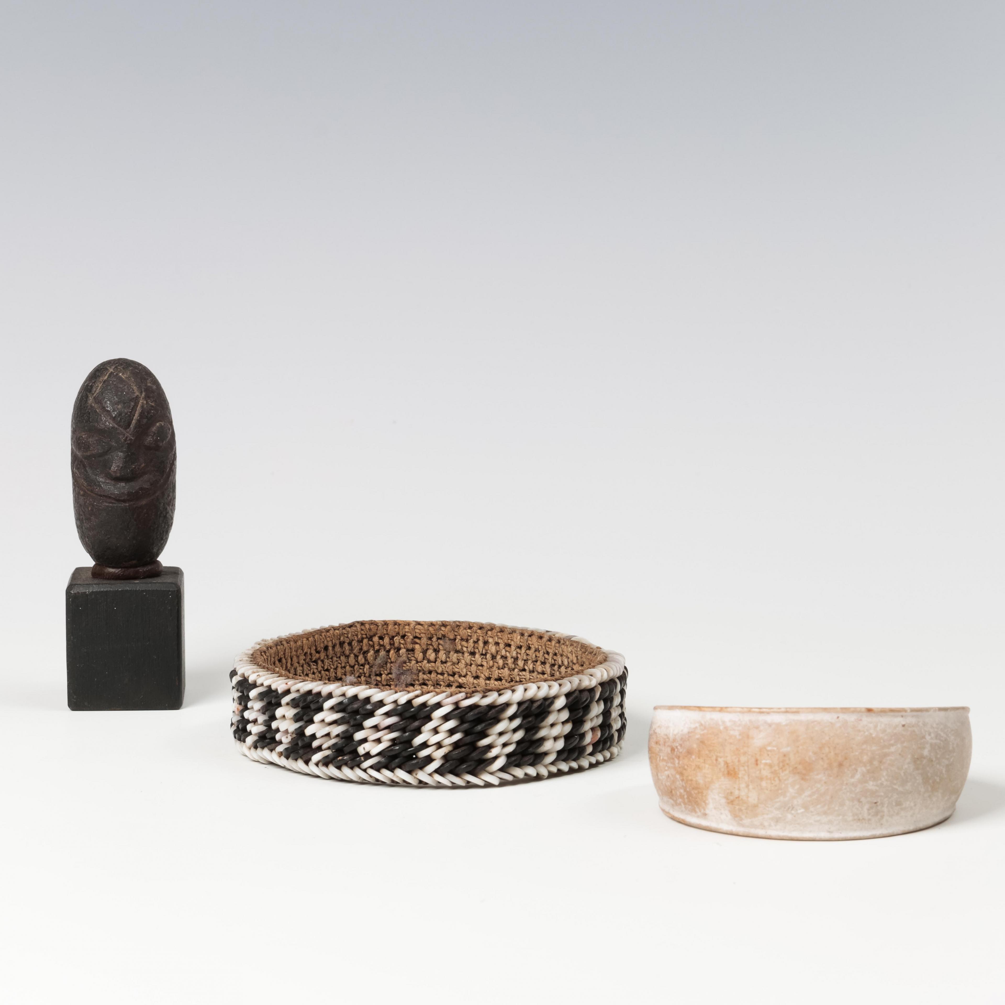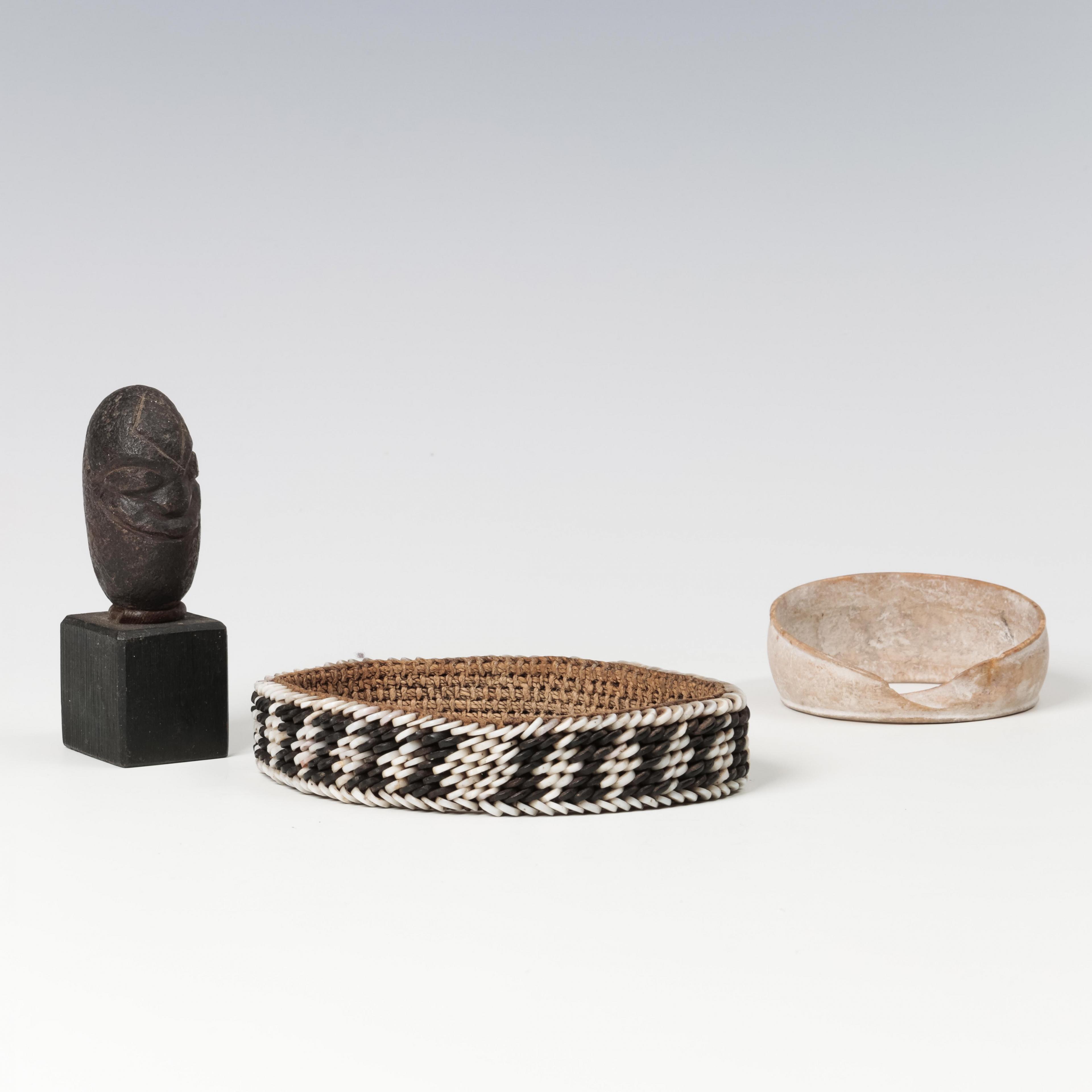 constisting of three necklaces with shell- and coconut beads; a bone spatula; two wooden ornaments; shell armlet and a black stone anthropomorphic head, possibly Vanuatu.