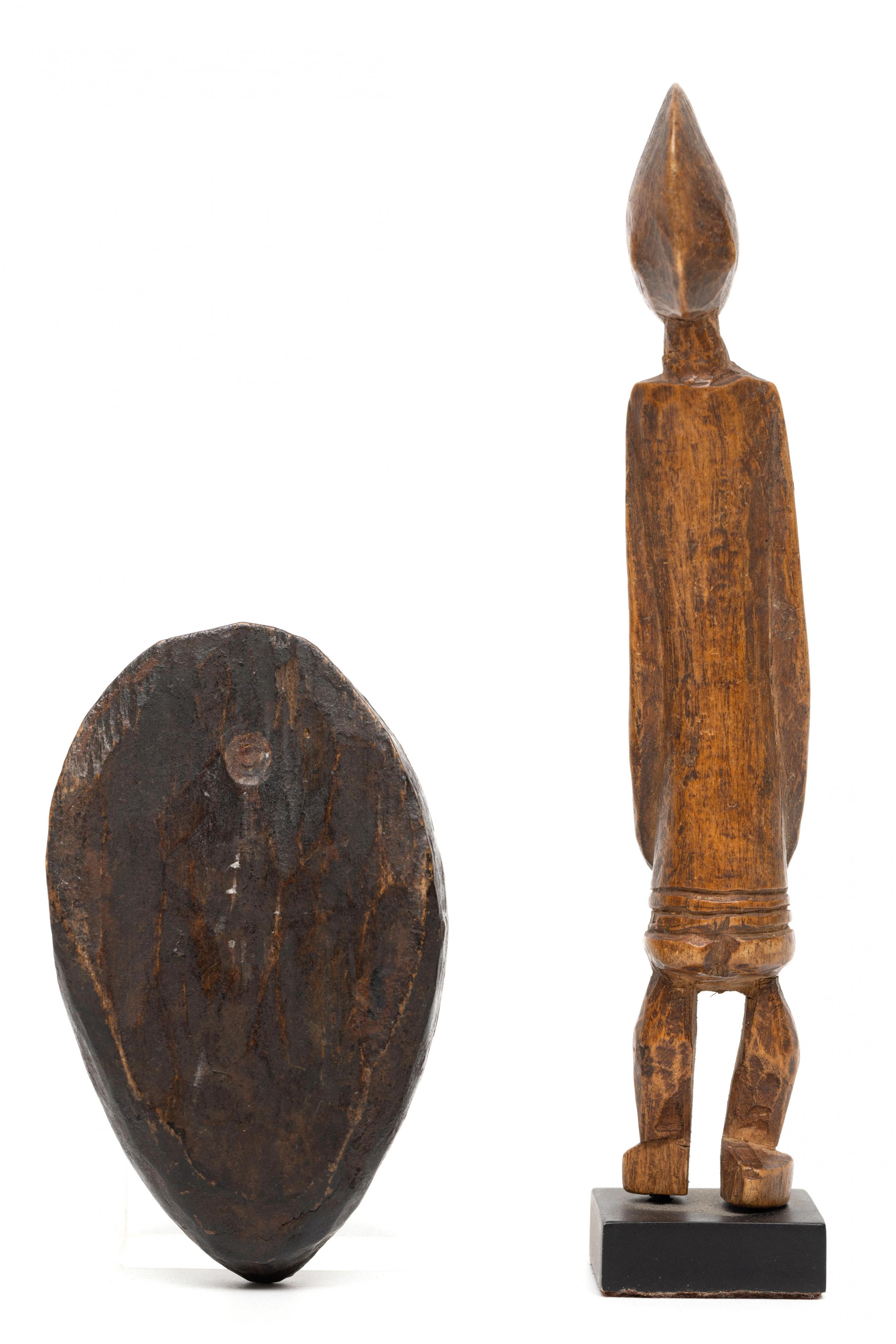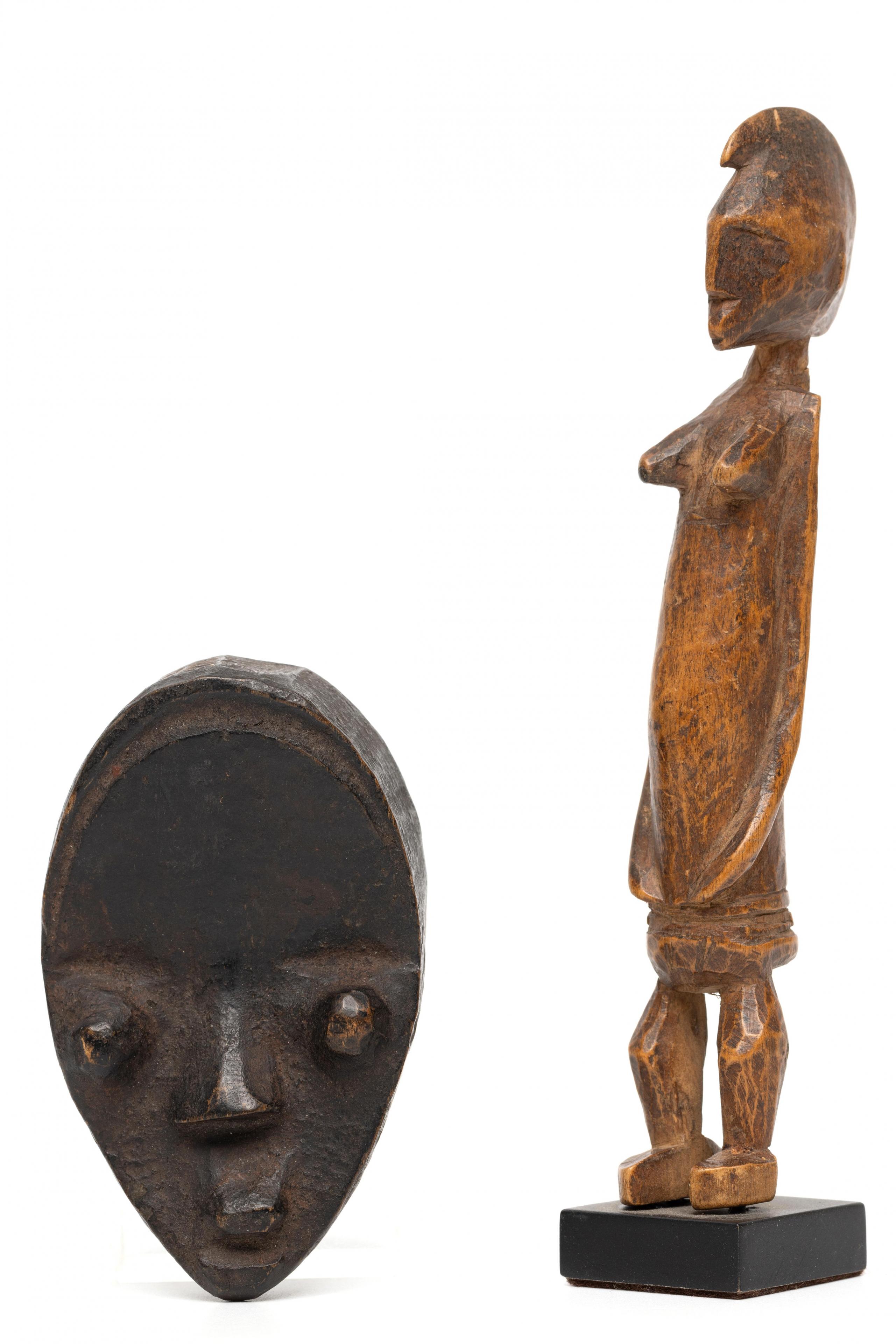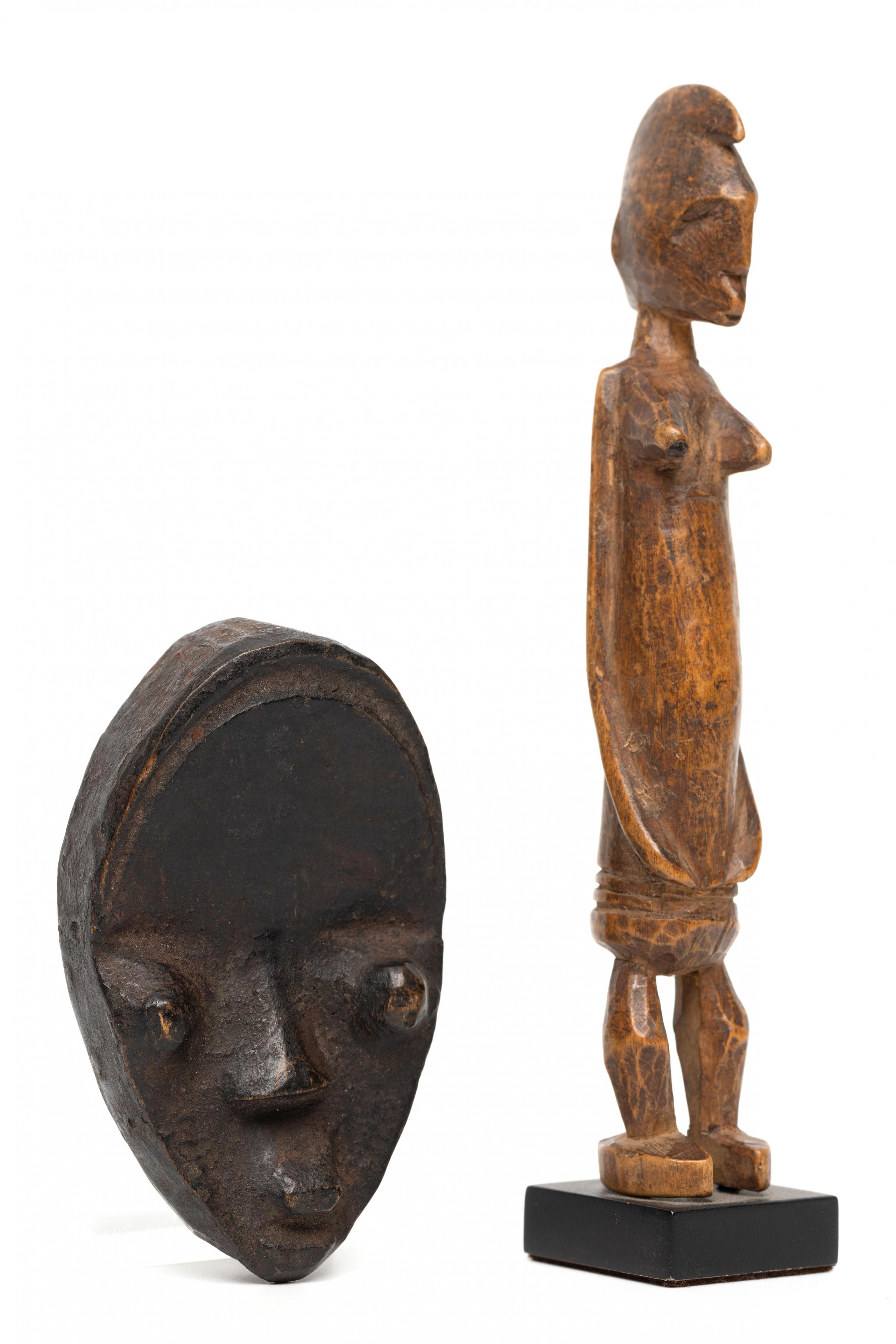 Ivory Coast, Senufo, a standing female figure and a Dan wooden miniature mask.