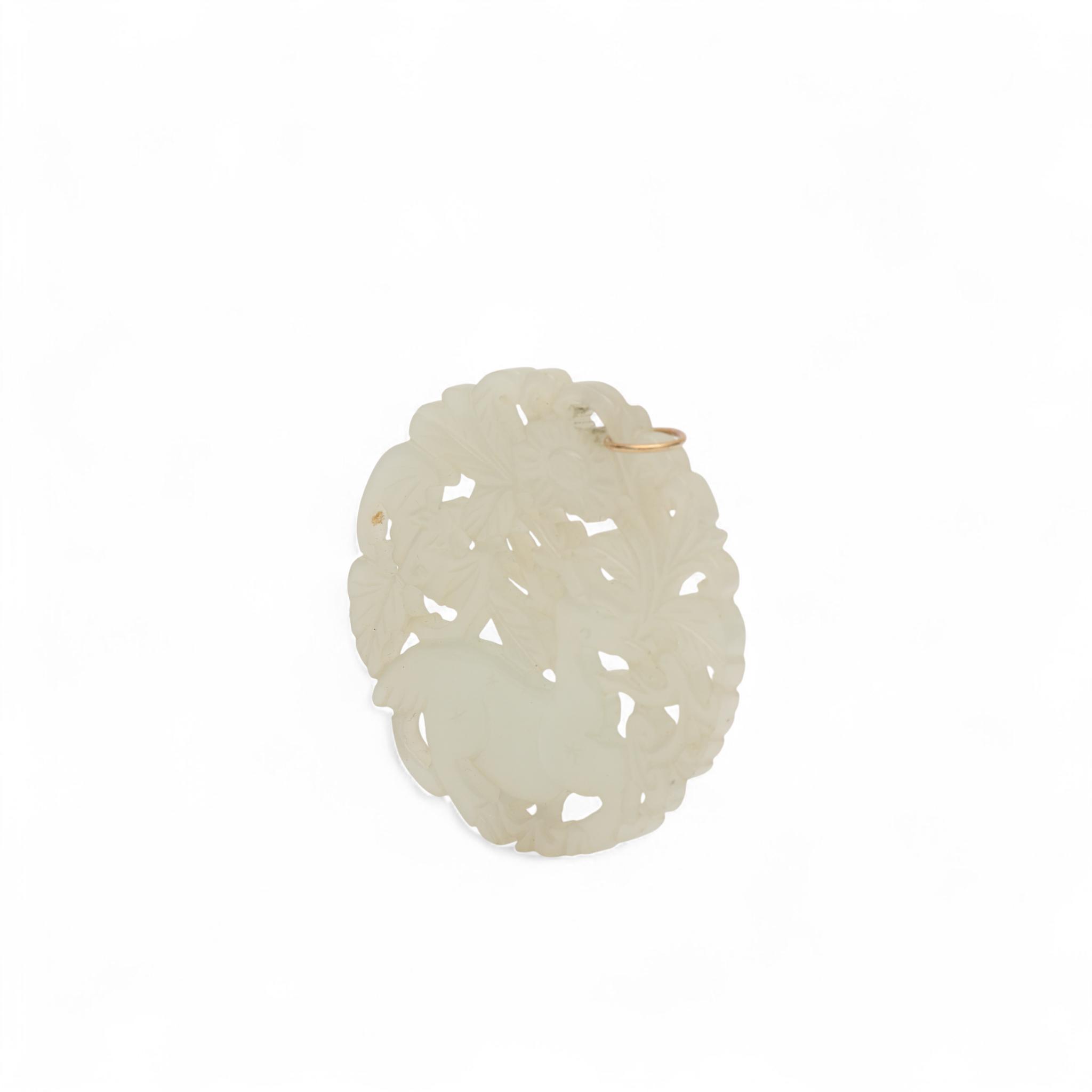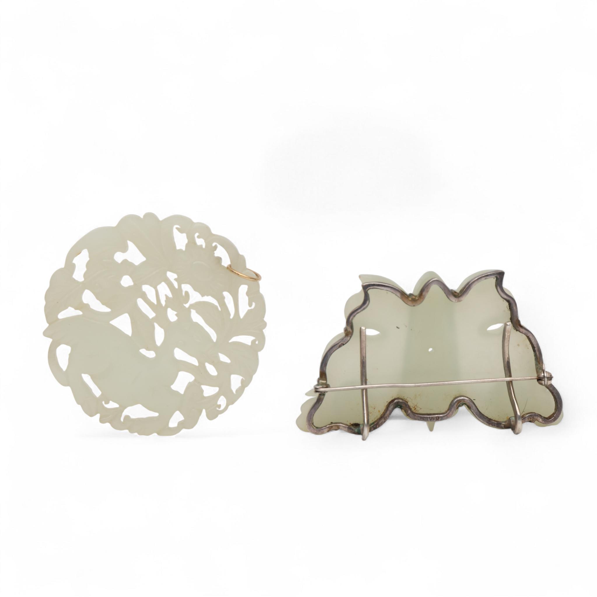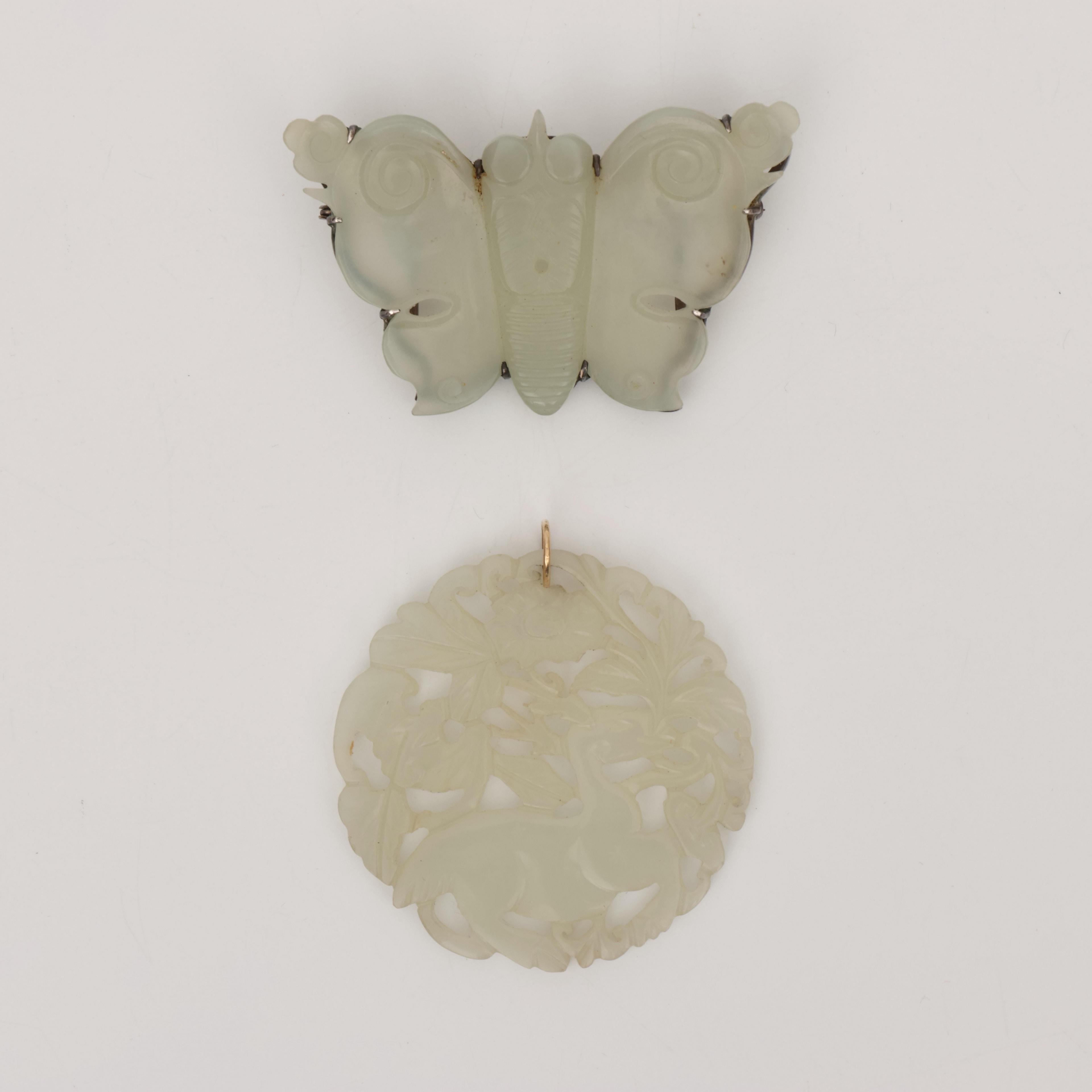 one carved as a butterfly and mounted as a broche, the other a circular pendant openworked with a deer among flowers, the stone of a pale celadon tone (very minute nicks)