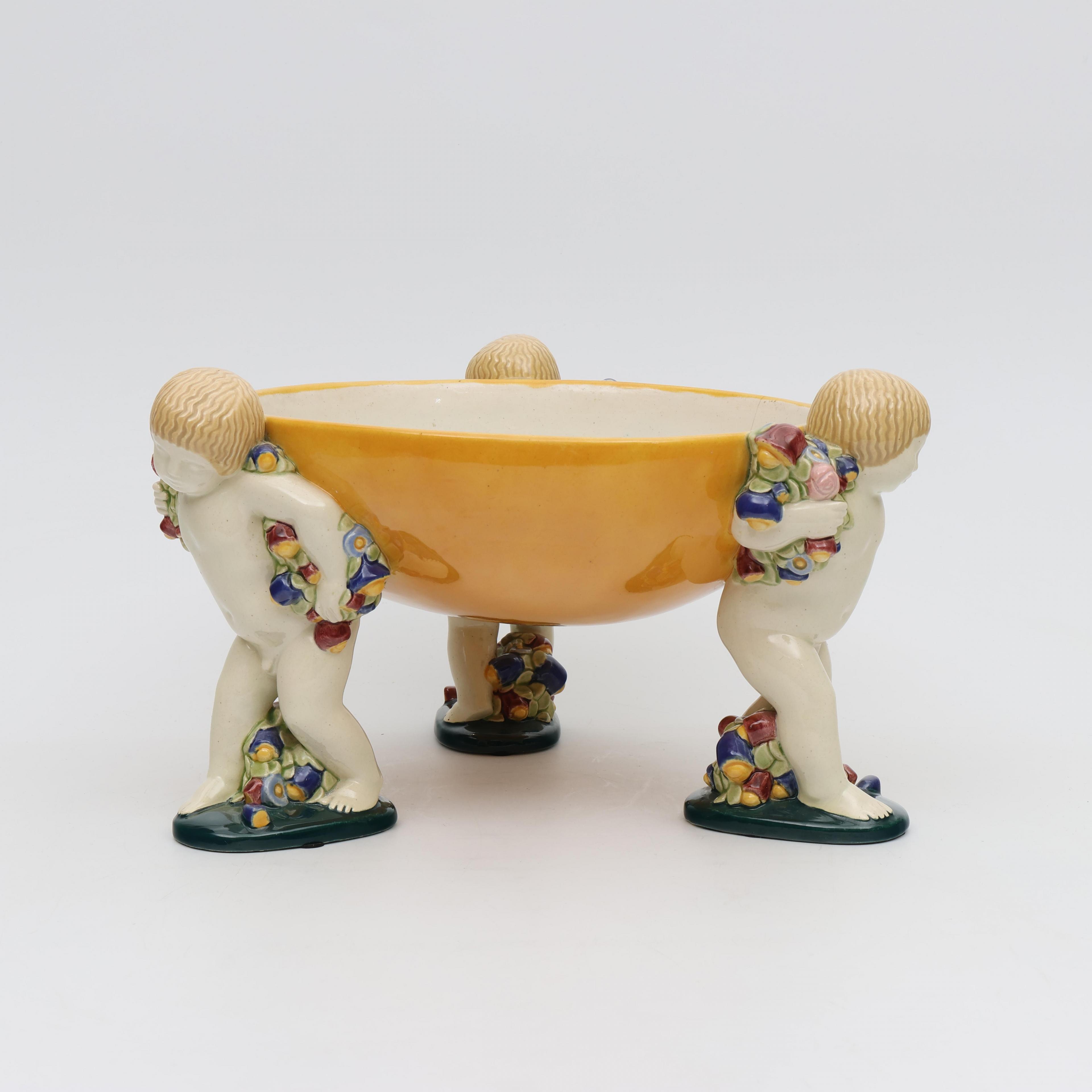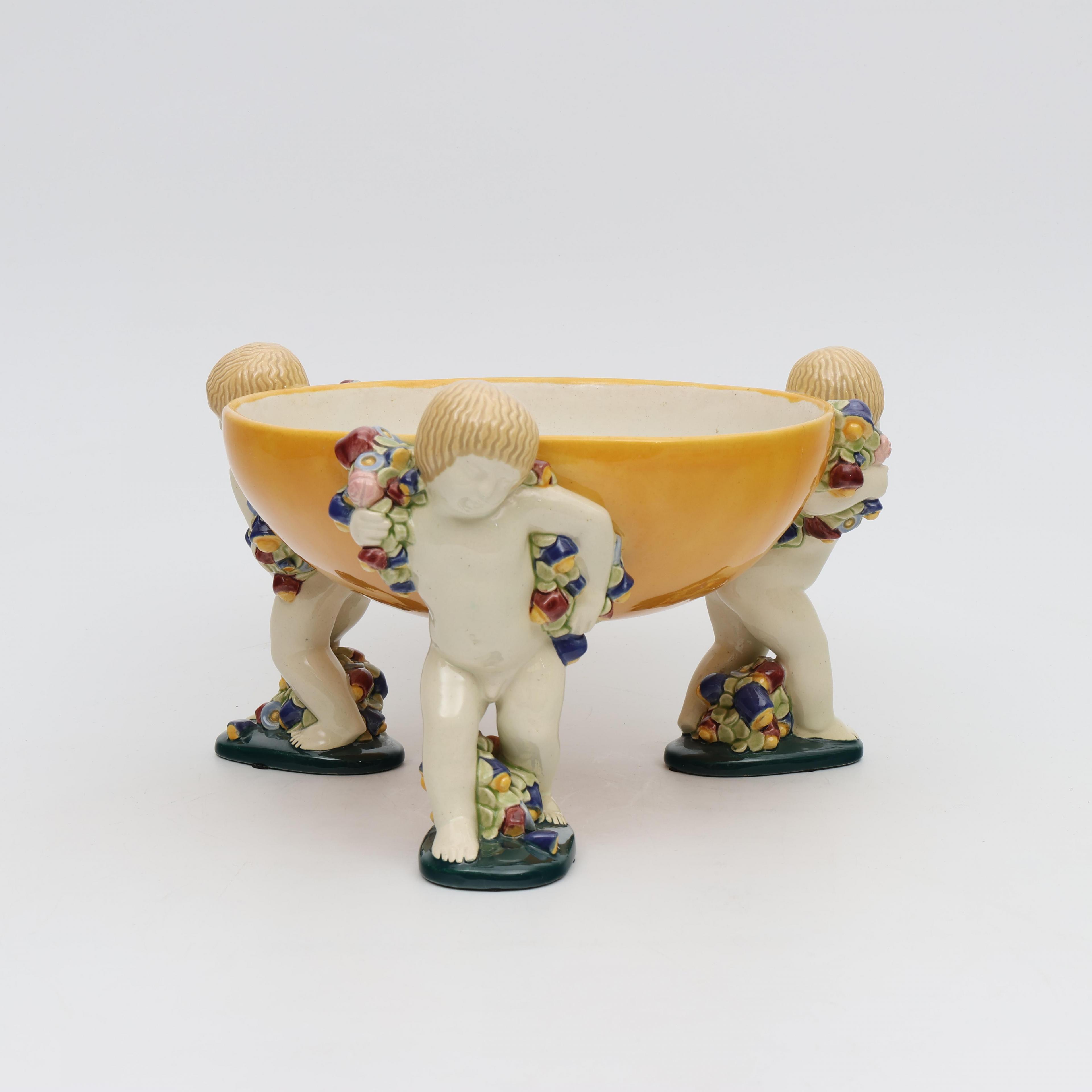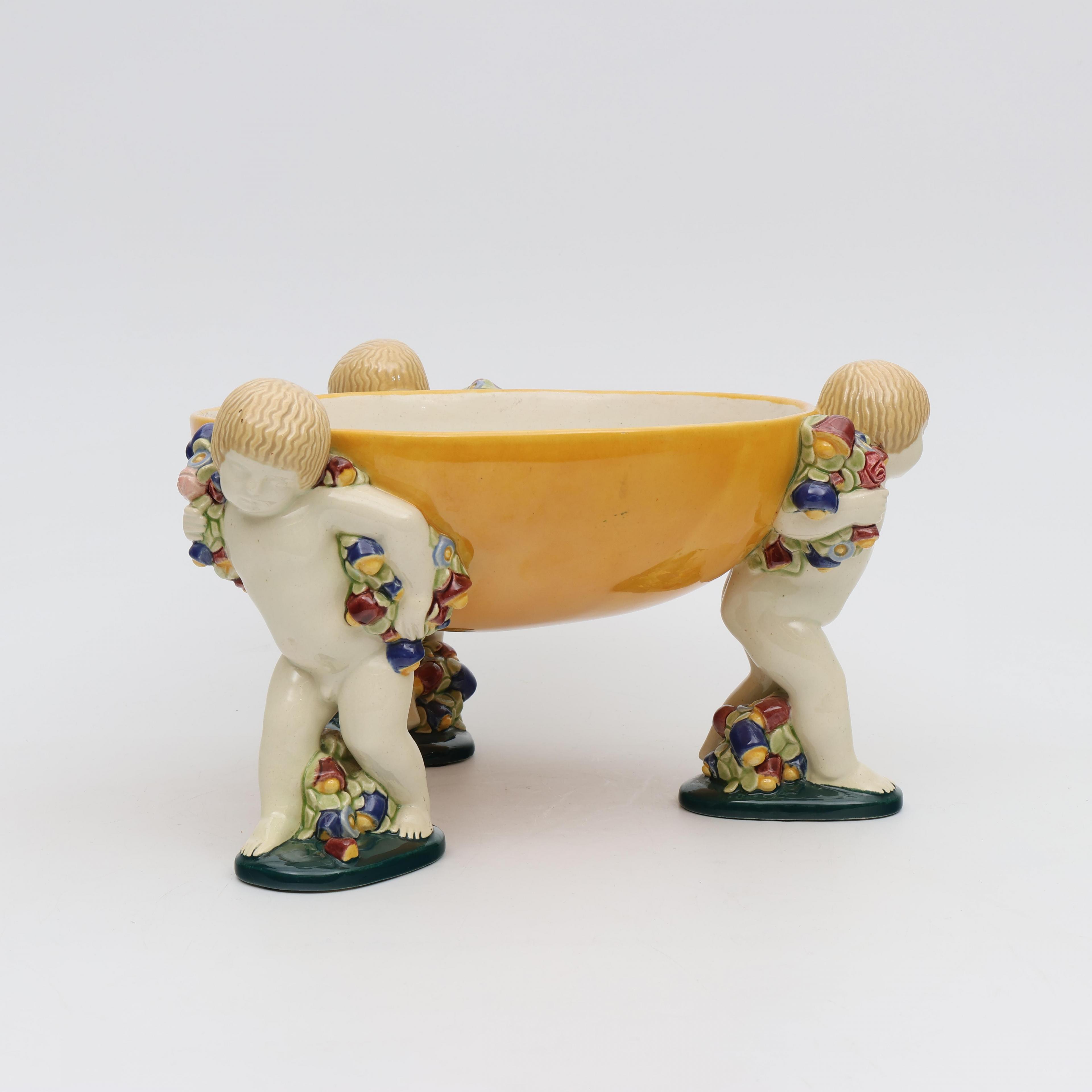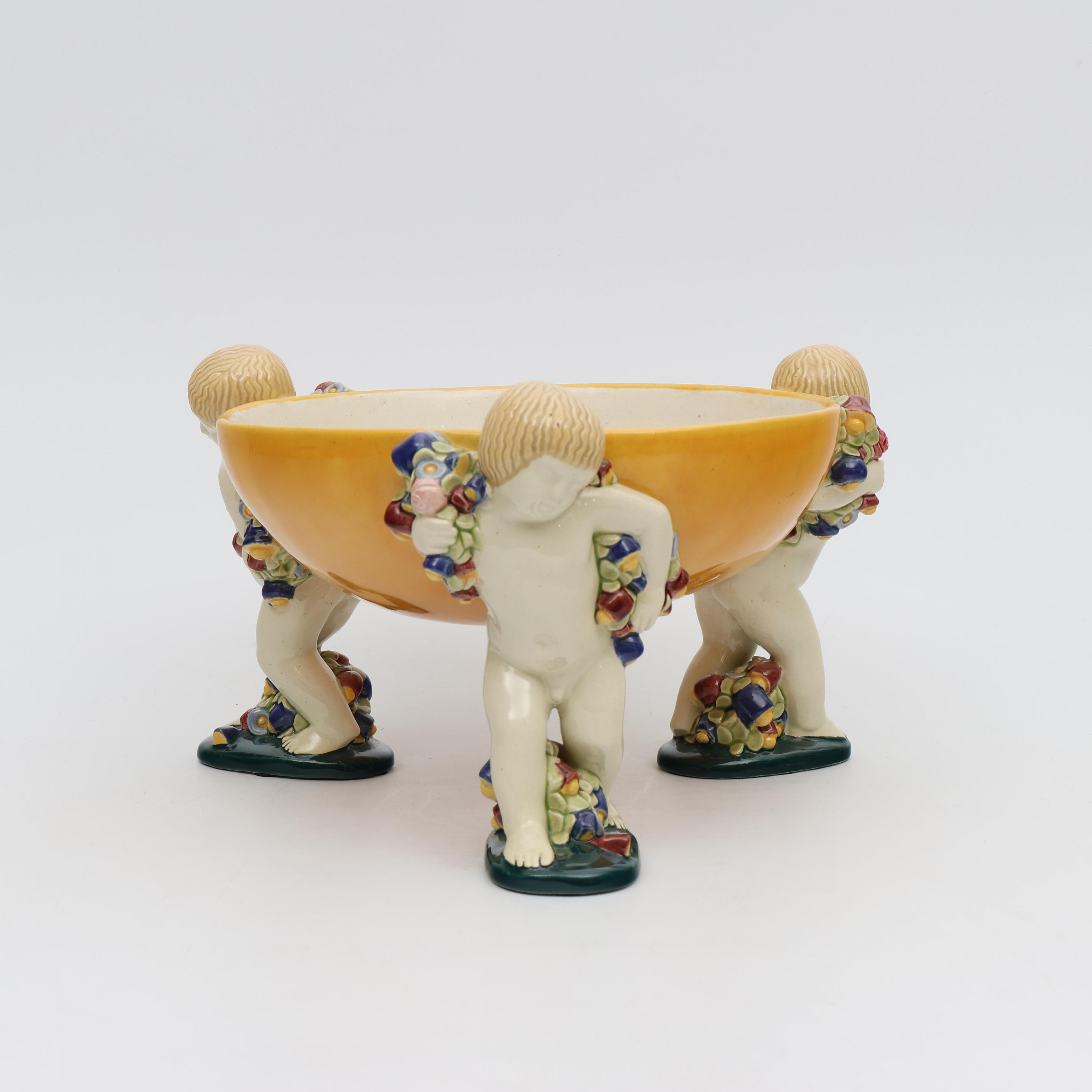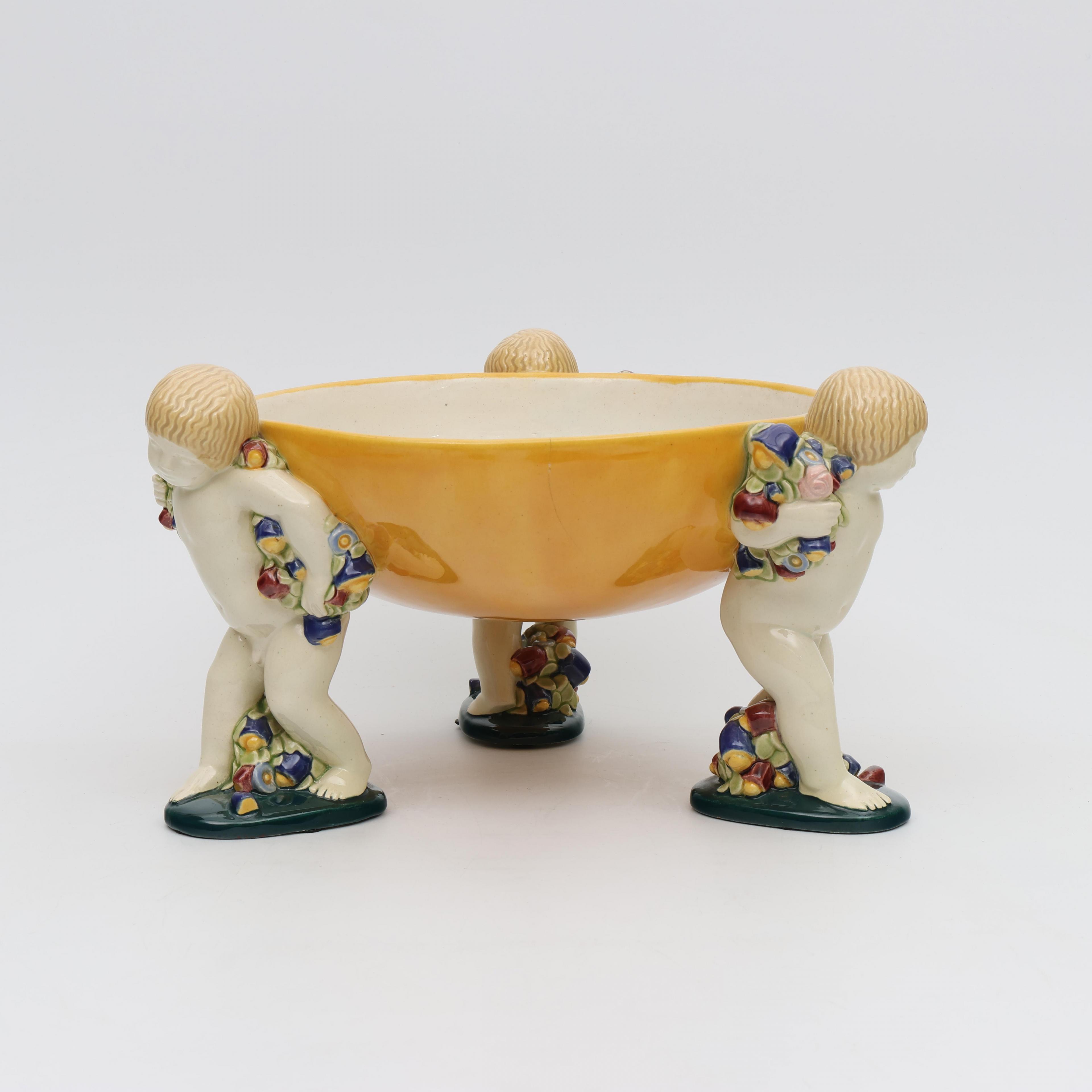 Michael Powolny (1871-1954), polychroom beschilderde aardewerk schaal gedragen door drie putti, Wiener Kunstkeramische Werkstätte, circa 1910;