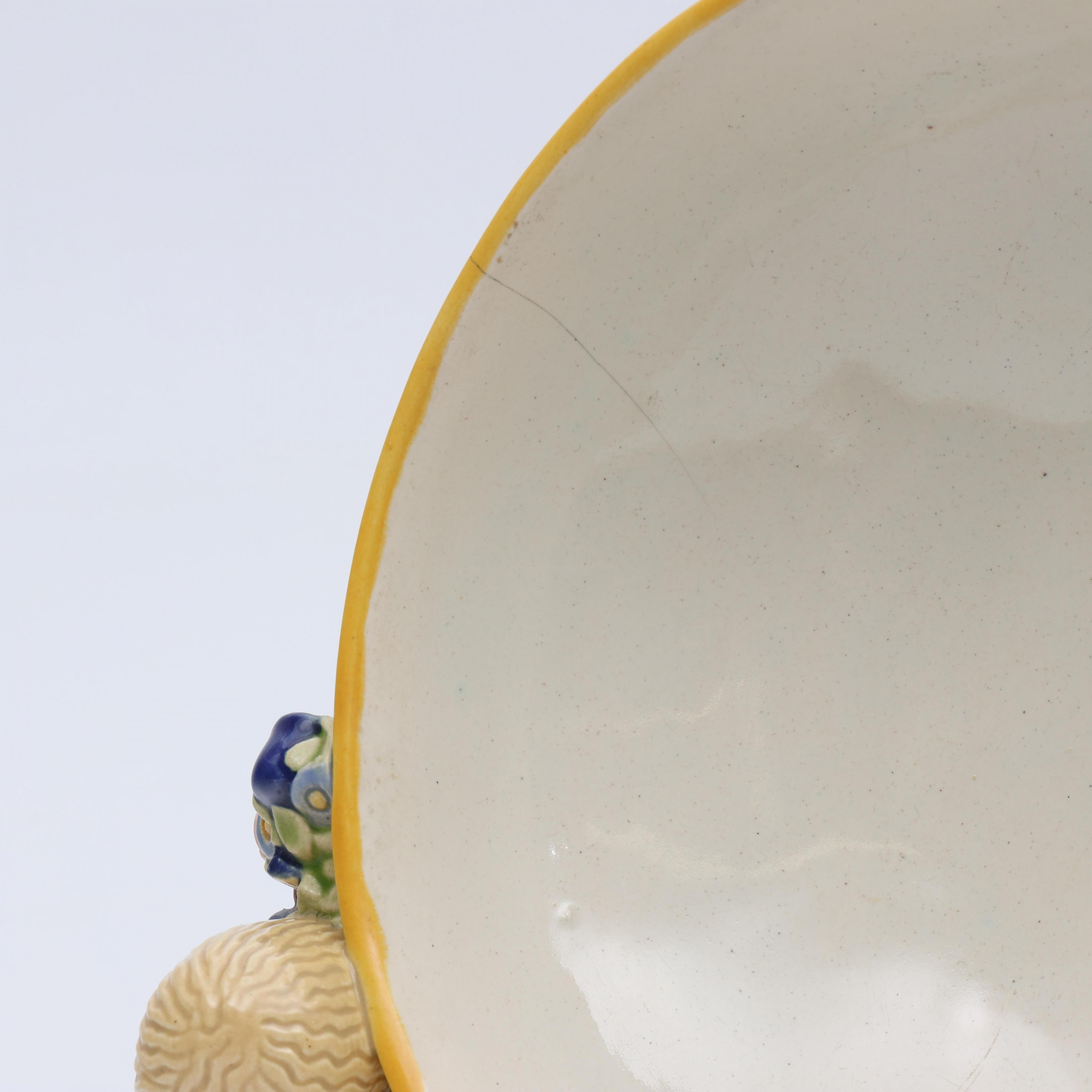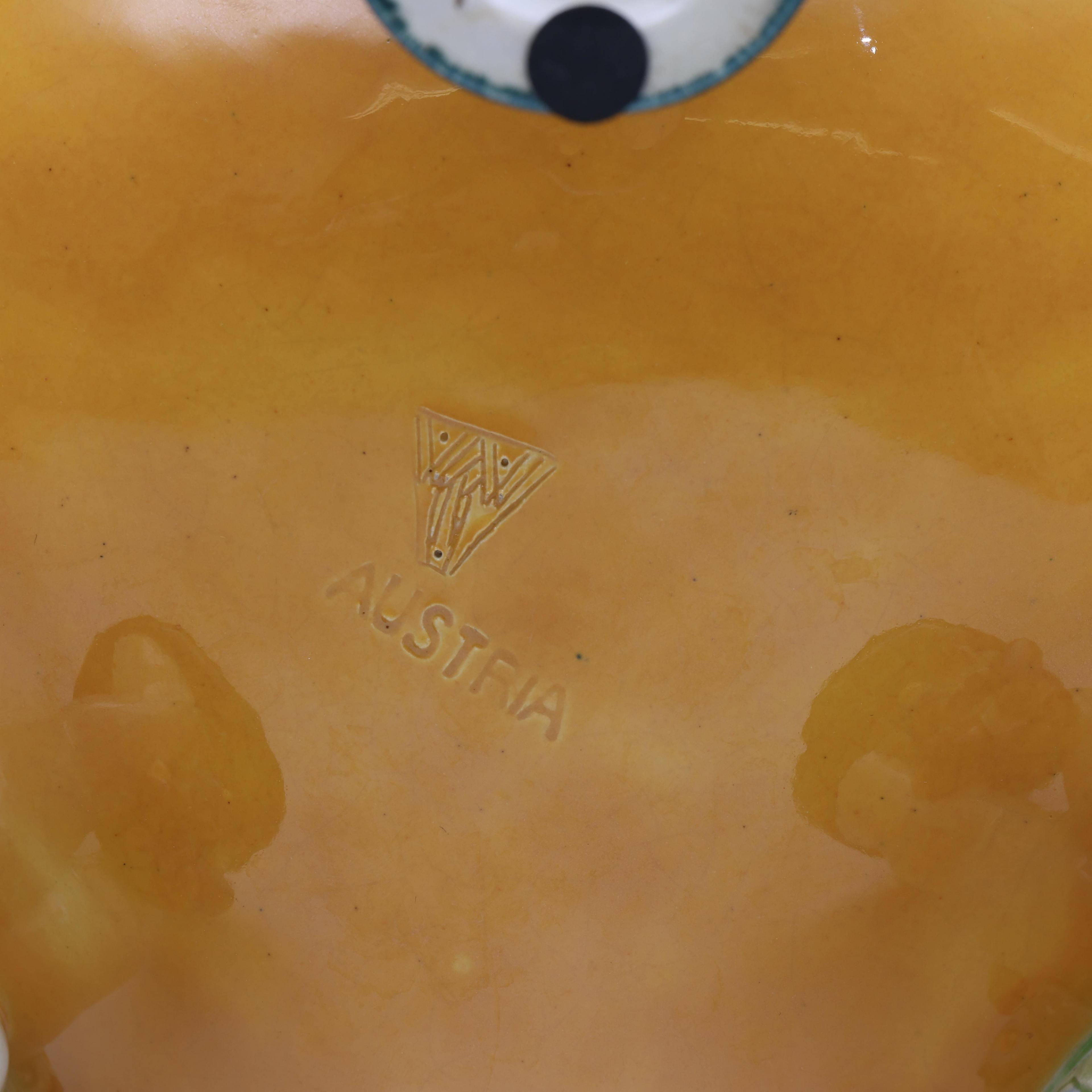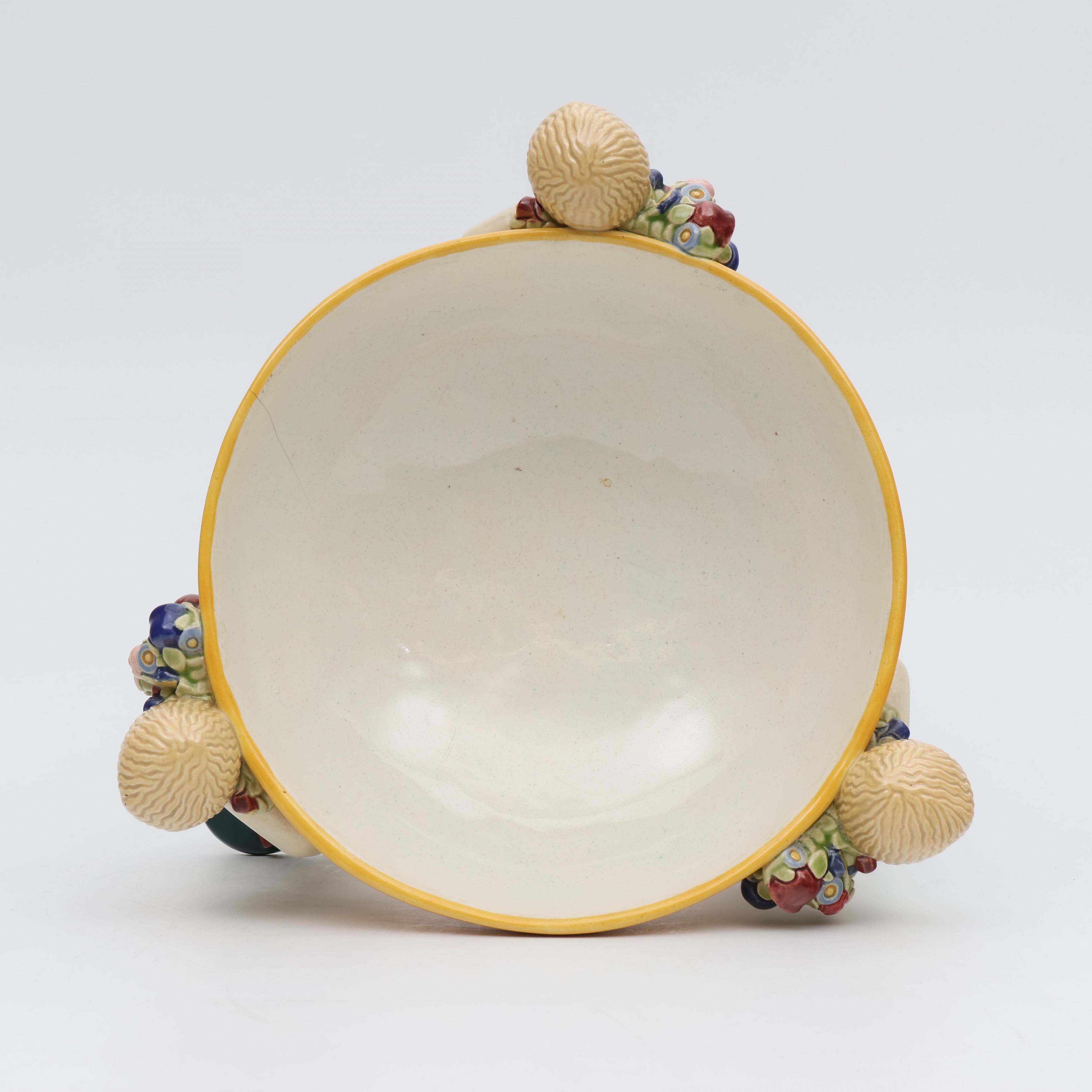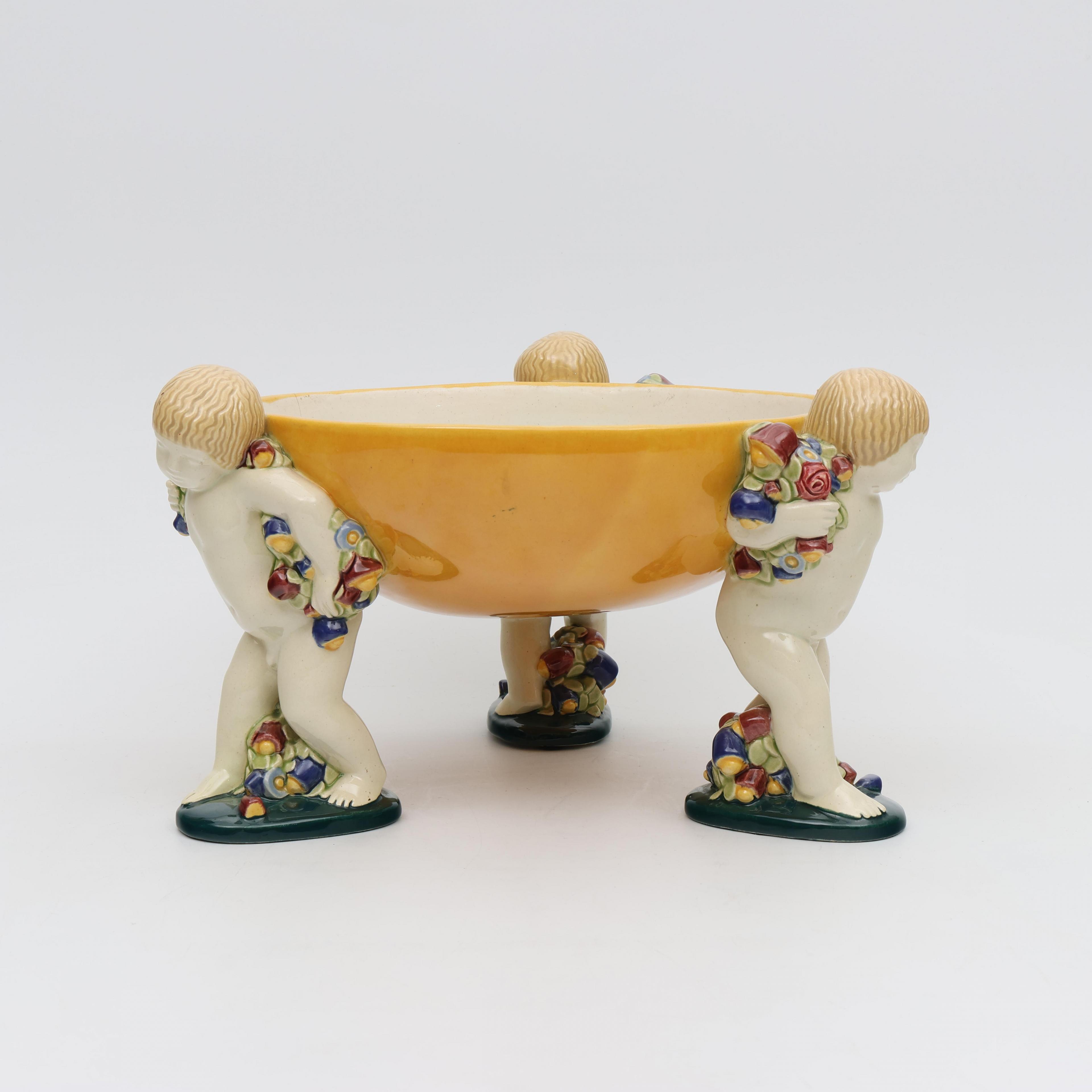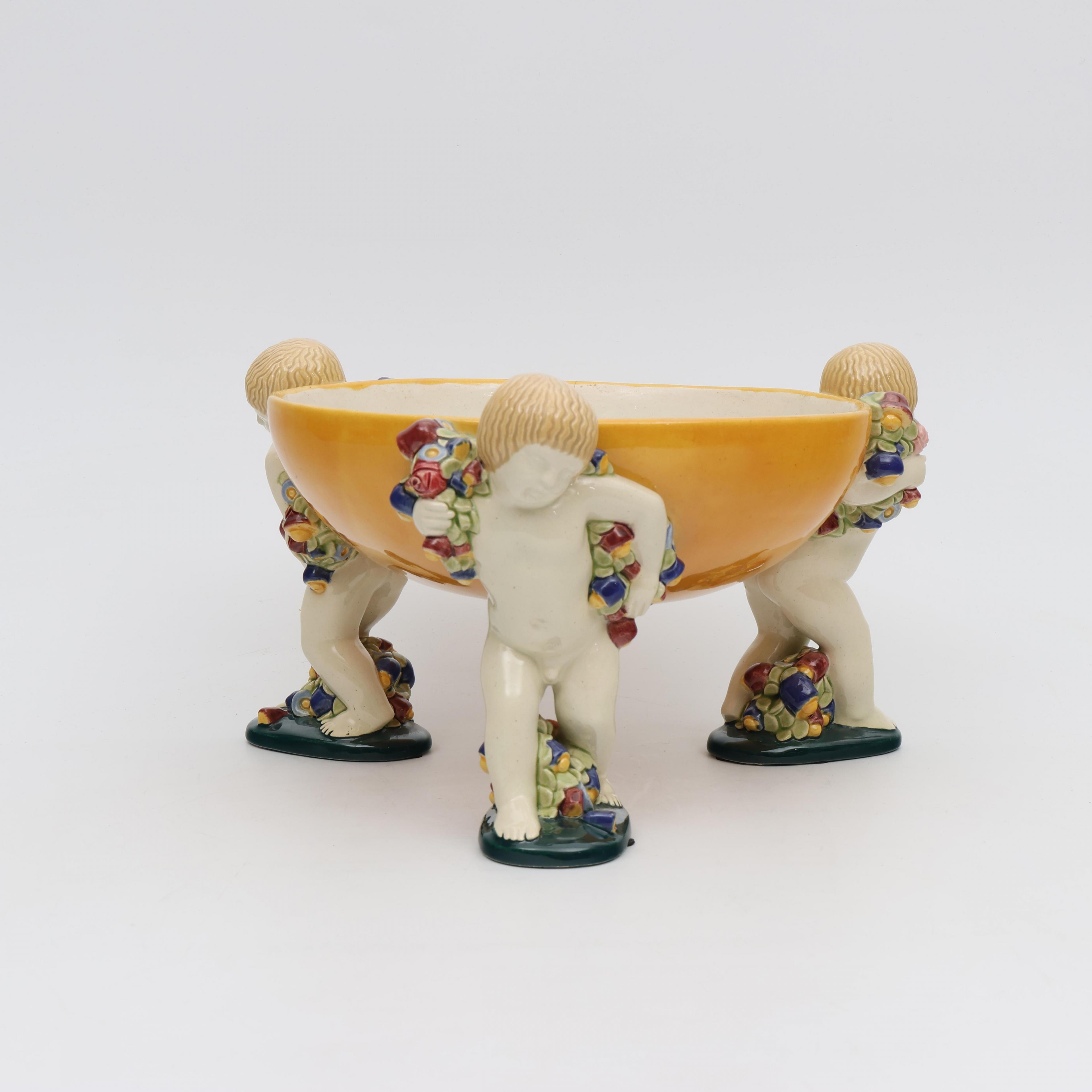 Michael Powolny (1871-1954), polychroom beschilderde aardewerk schaal gedragen door drie putti, Wiener Kunstkeramische Werkstätte, circa 1910;