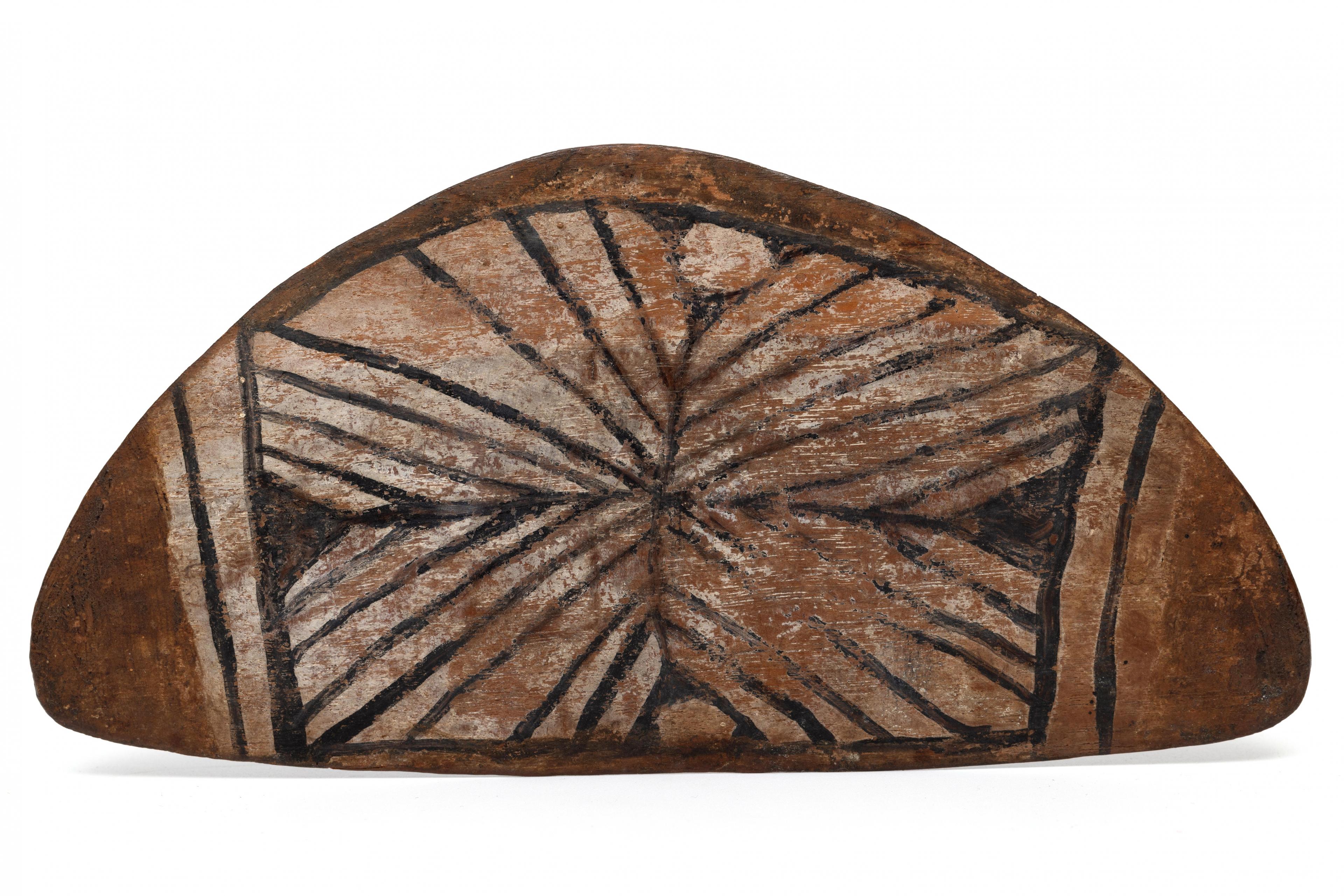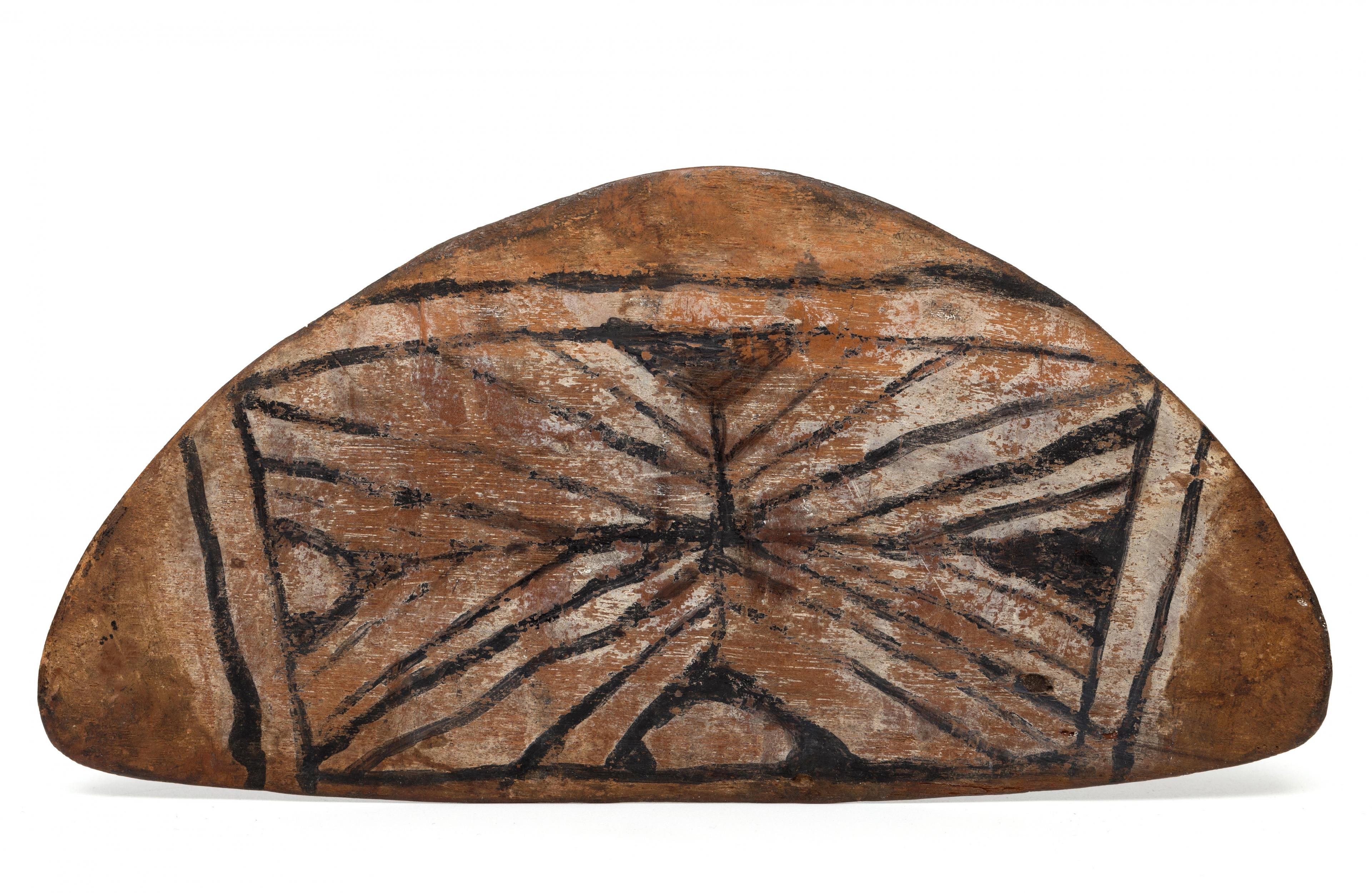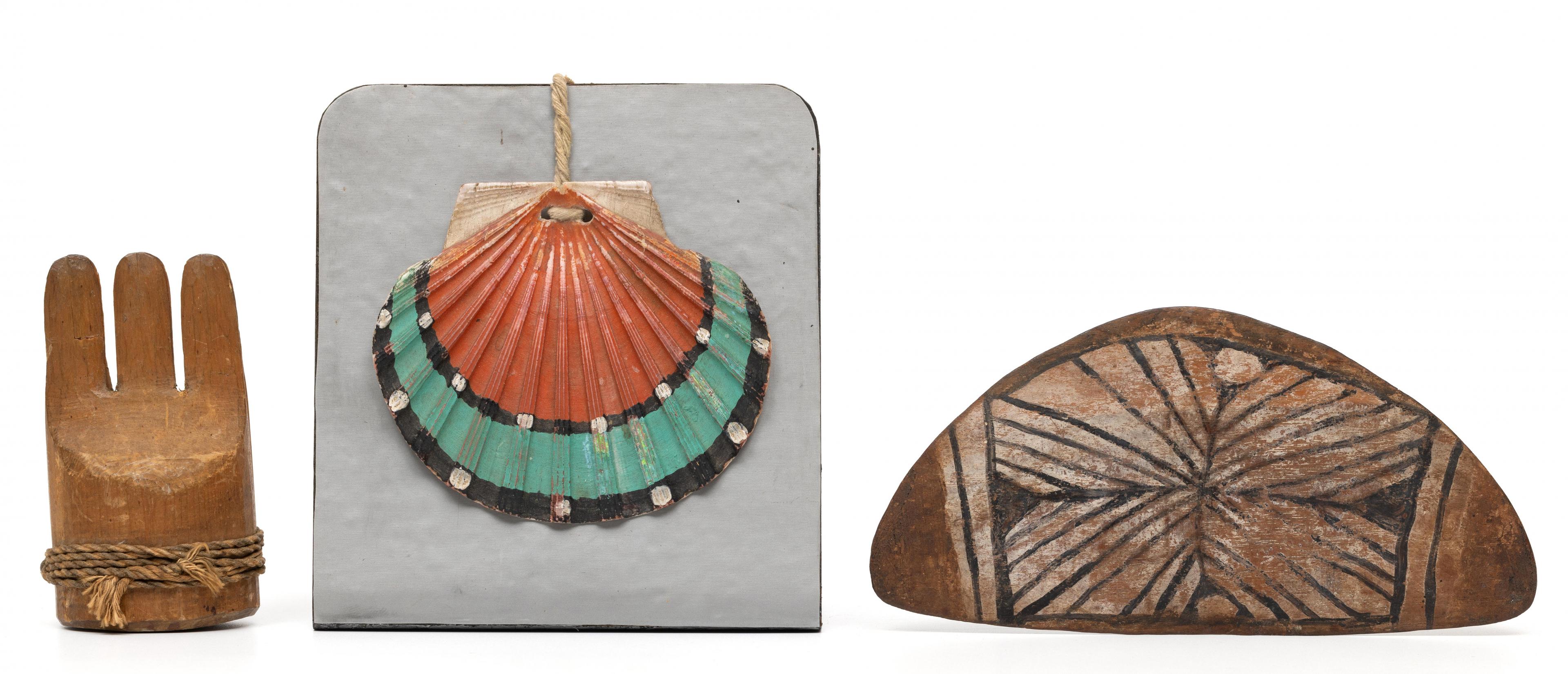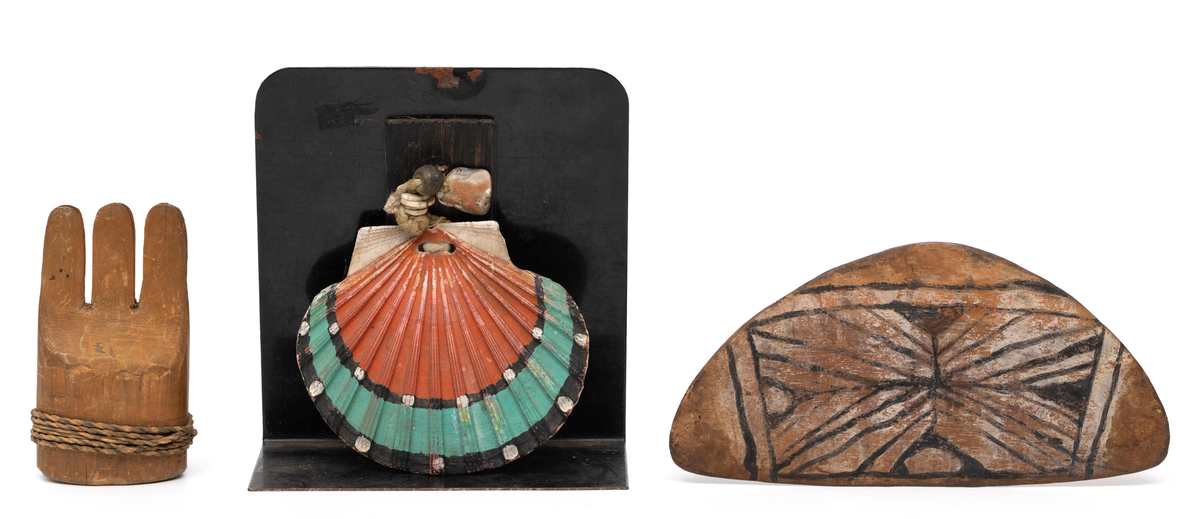 South America, Peru-Brazil, a painted wooden amulet, North American Native Indian, a painted shell and a carved wooden ornament-container.