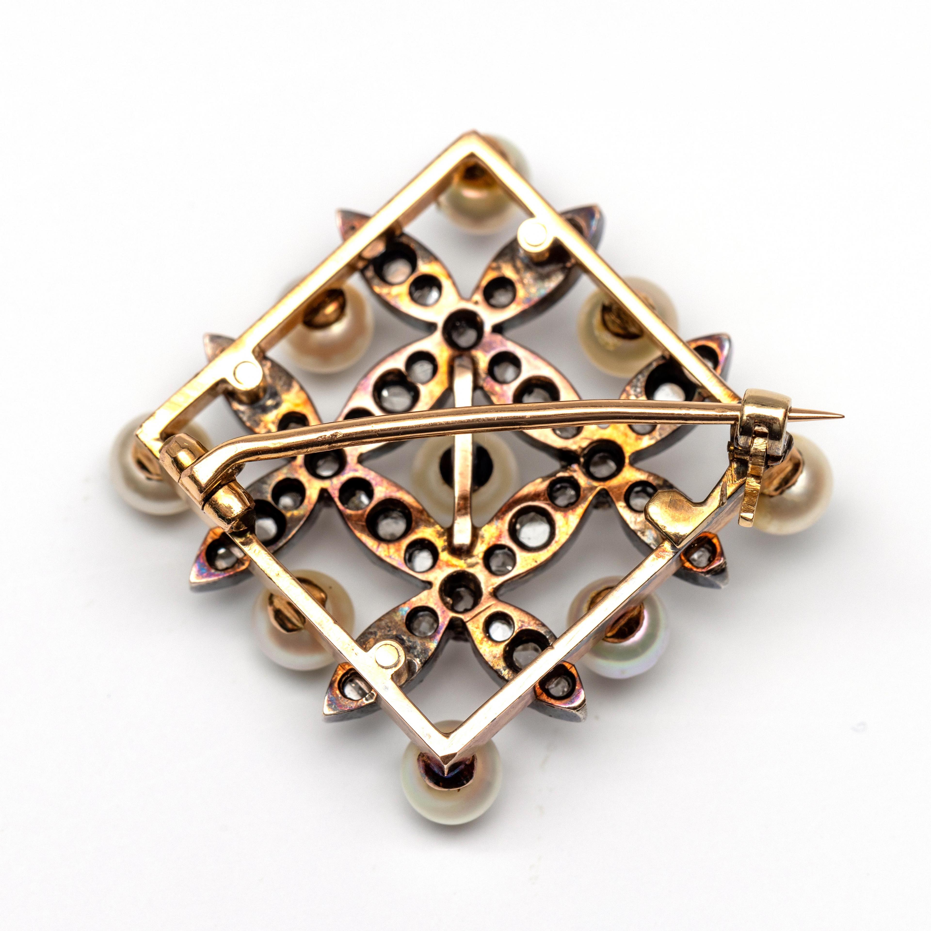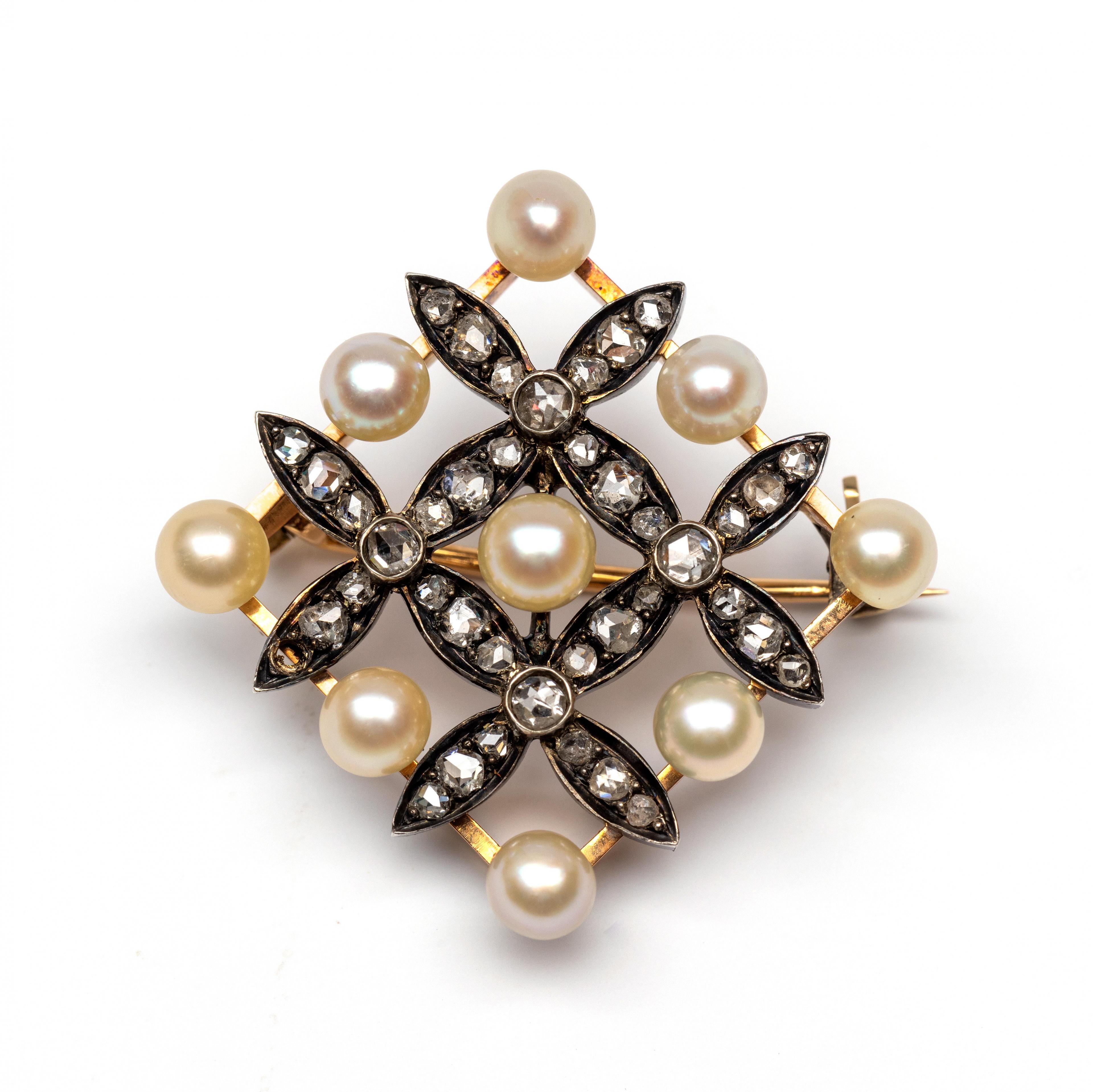 Gold diamond-shaped brooch, ca. 1900. Set with cultured pearls between which flower-shaped silver appliques set with fine rose-cut diamonds