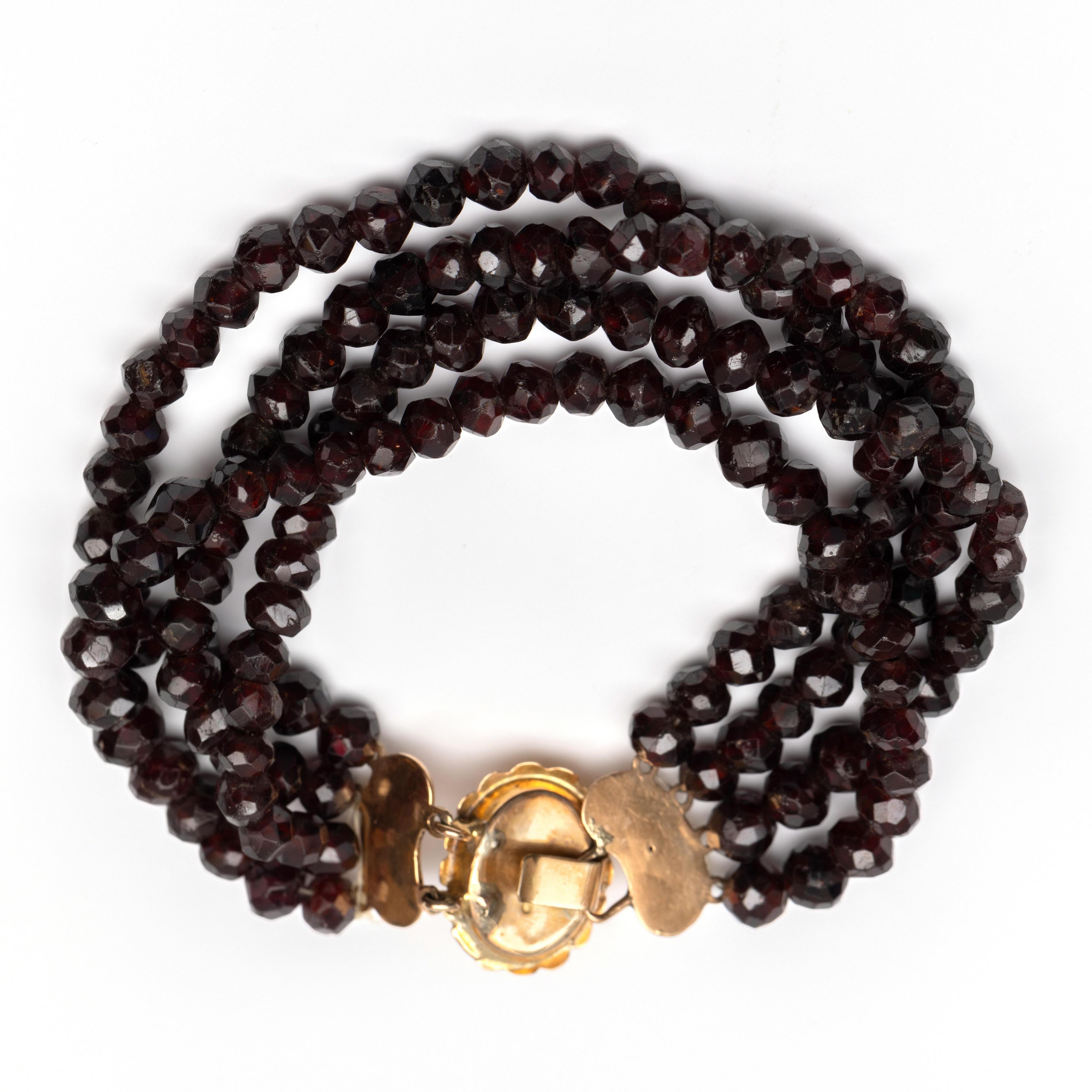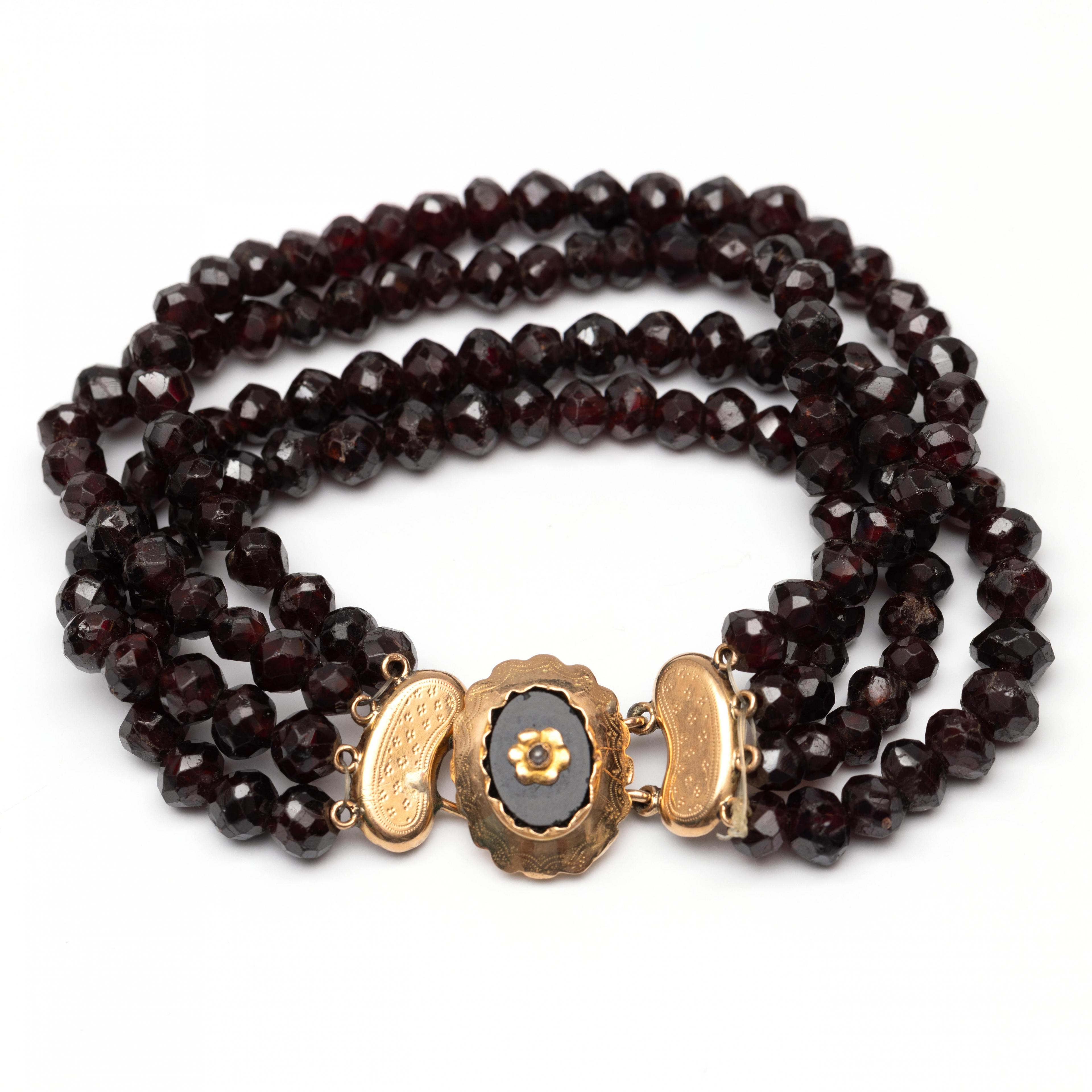 Bracelet of four strands of garnet. On a 14 k. gold clasp, set with onyx on which a flower-shaped applique, set with a seed pearl and decorated with fine engraving (remnants of solder)