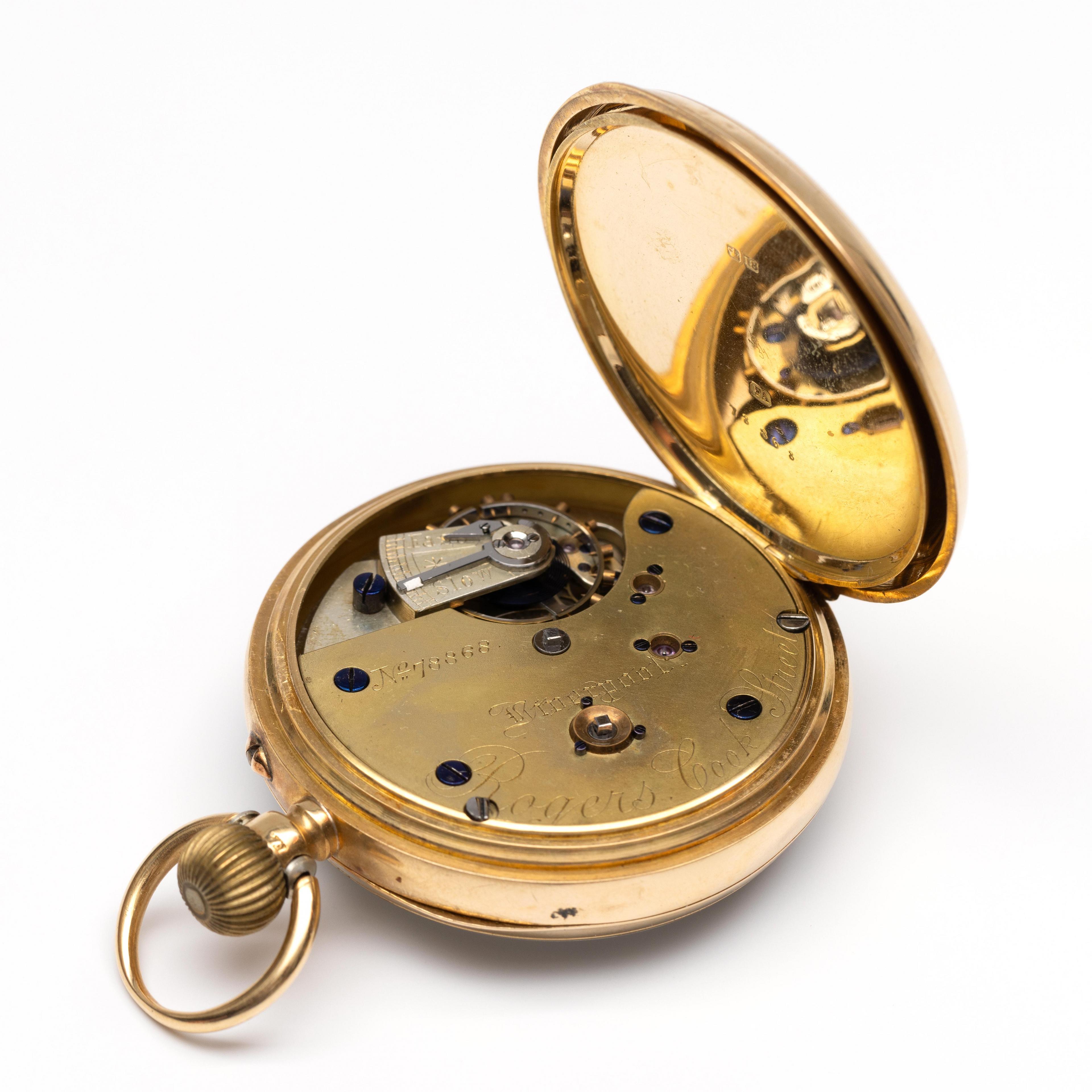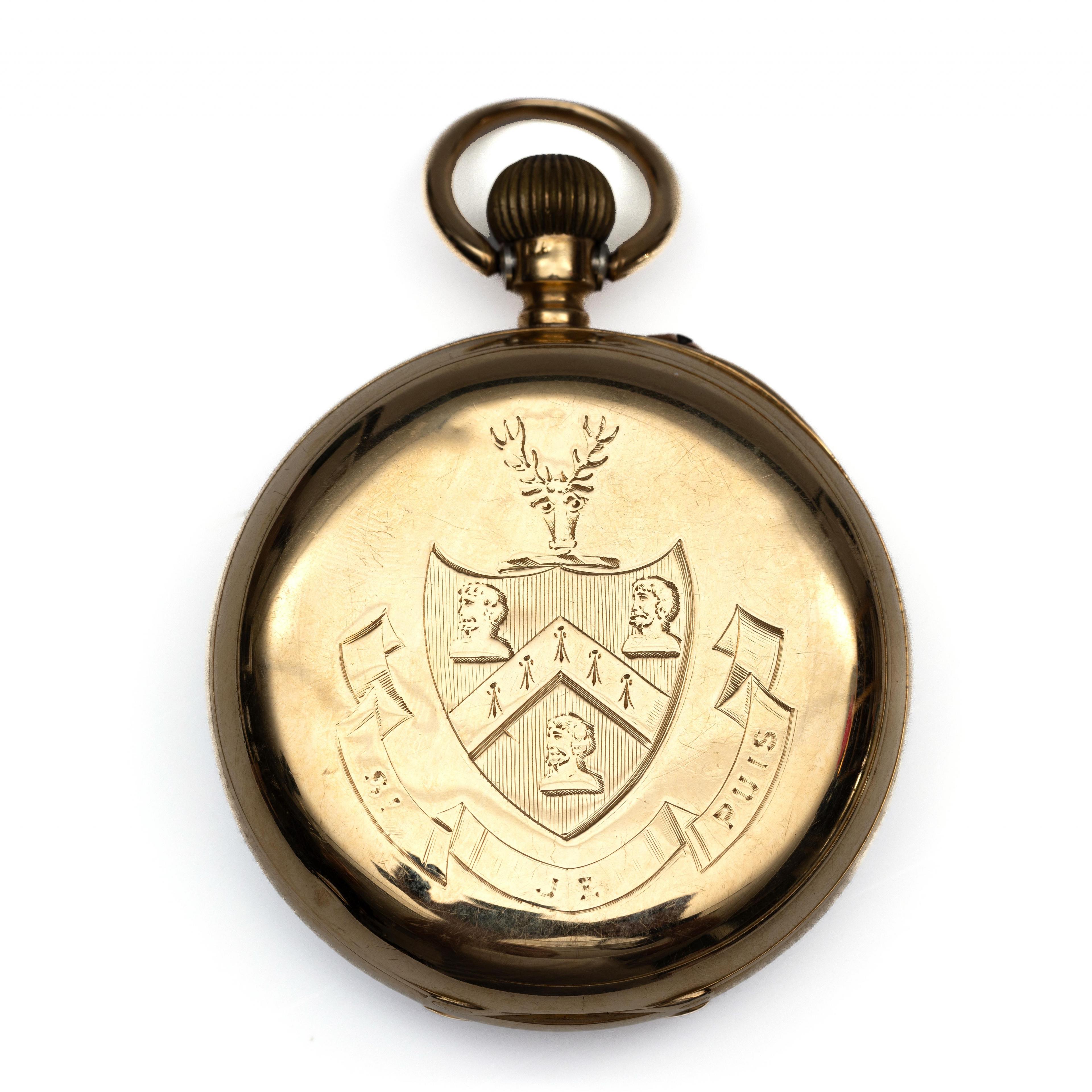 England, 18 k. gold pocket watch, 19th century. The back is engraved with the Williams family crest, direct relatives of Sir Monier Monier-Williams, Boden Professor of Sanskrit at Oxford University, below which is a banner reading "Si Je Puis" (If I Can). The dial is white with Roman numerals and a seconds hand at six. The movement is signed Rogers, Cook Street Liverpool, and numbered 78868. The case bears the maker's mark FA for Fritz Allamand, the city hallmark for London, and the date letter L for 1886. With gold inner lid