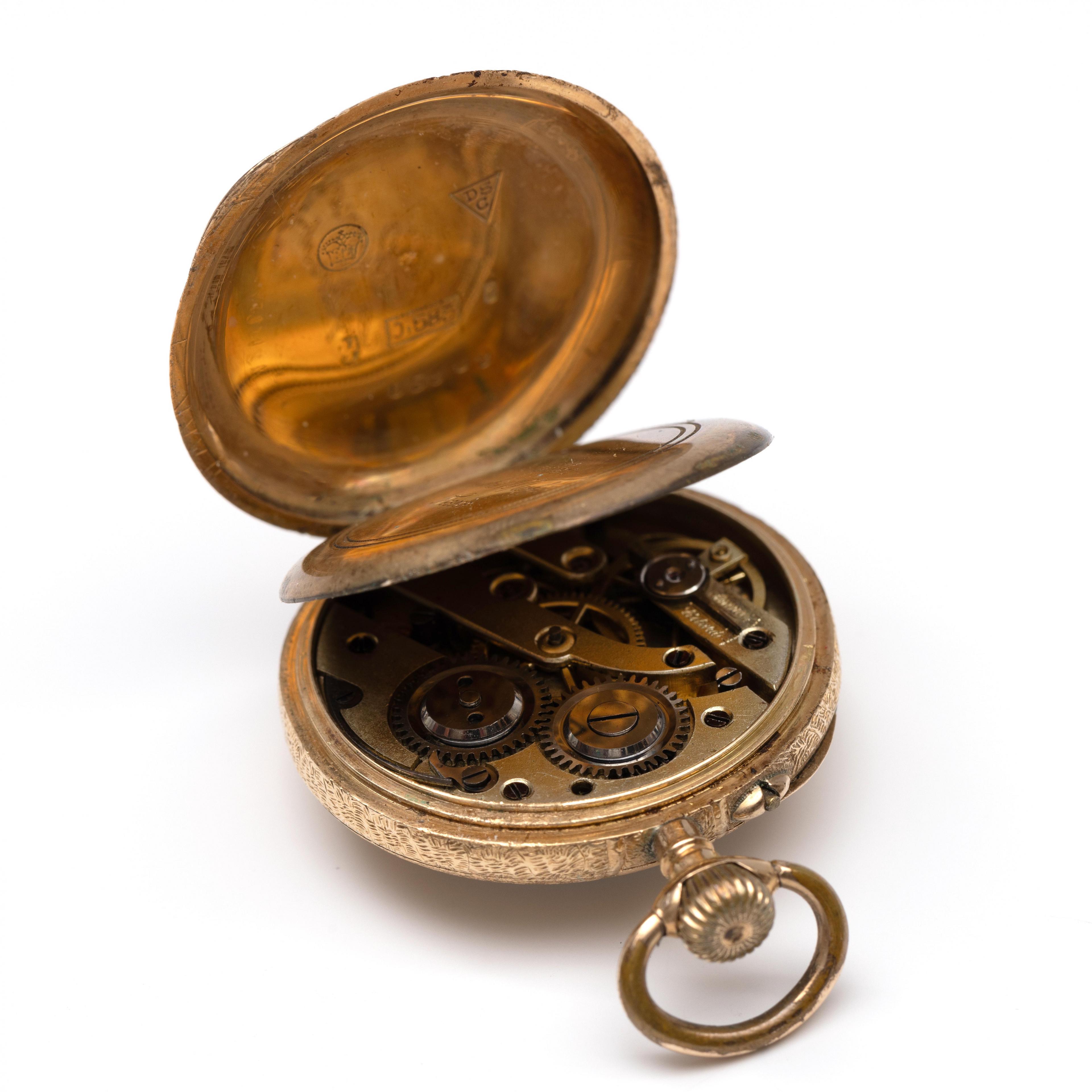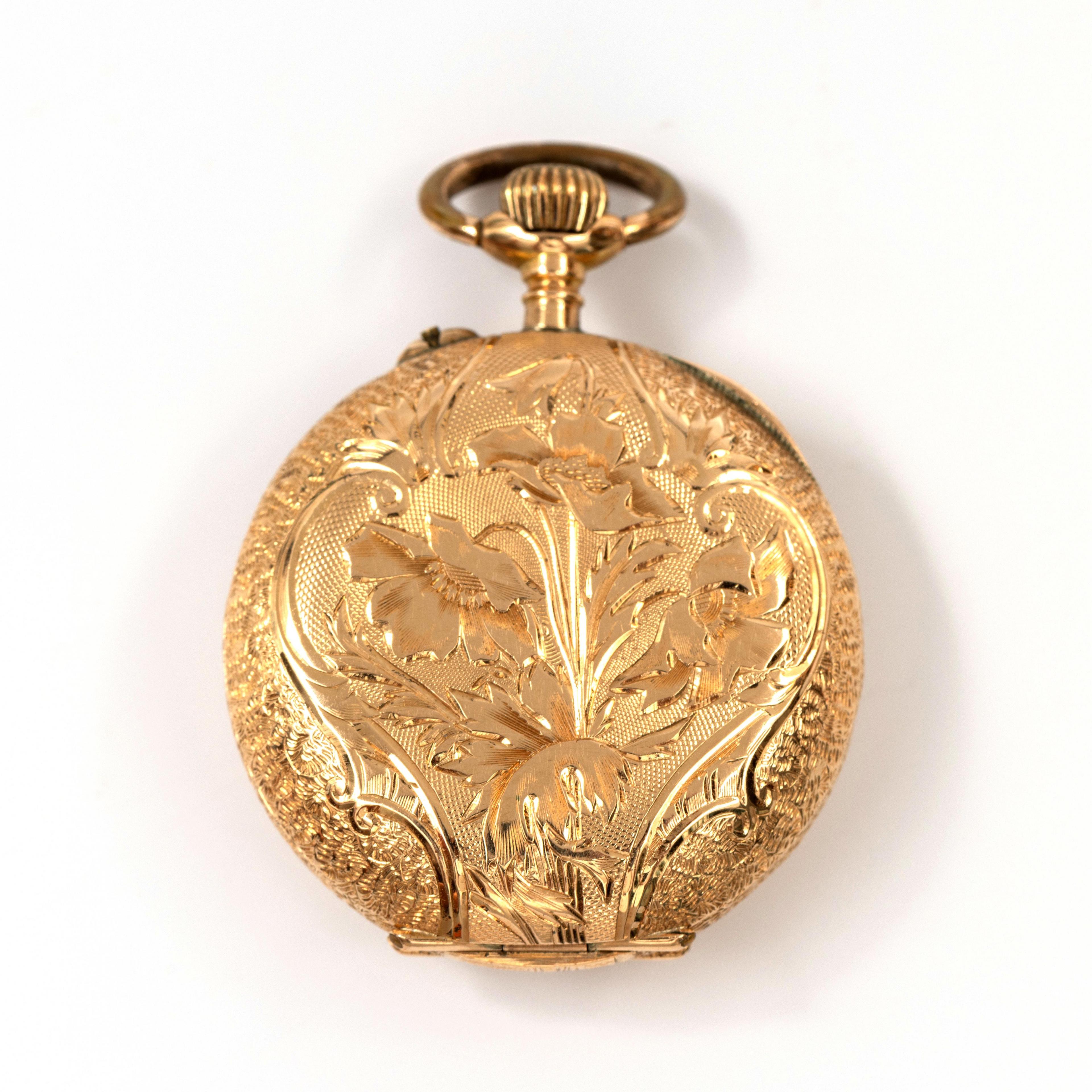14 k. Gold pocket watch, with white dial with red Roman numerals for the hours. The case completely engraved, the back with a decoration of poppies. The inner lid and the bail of base metal.