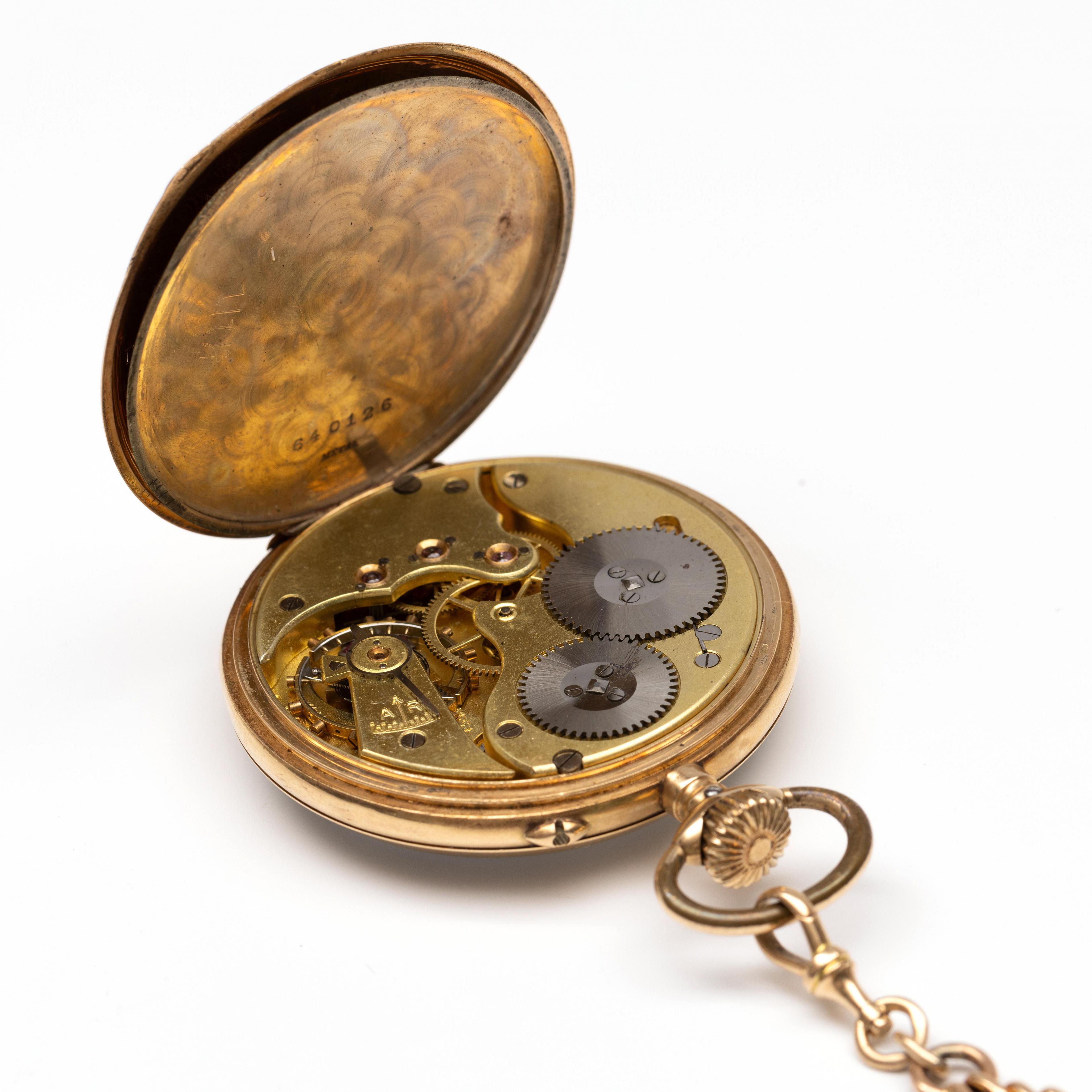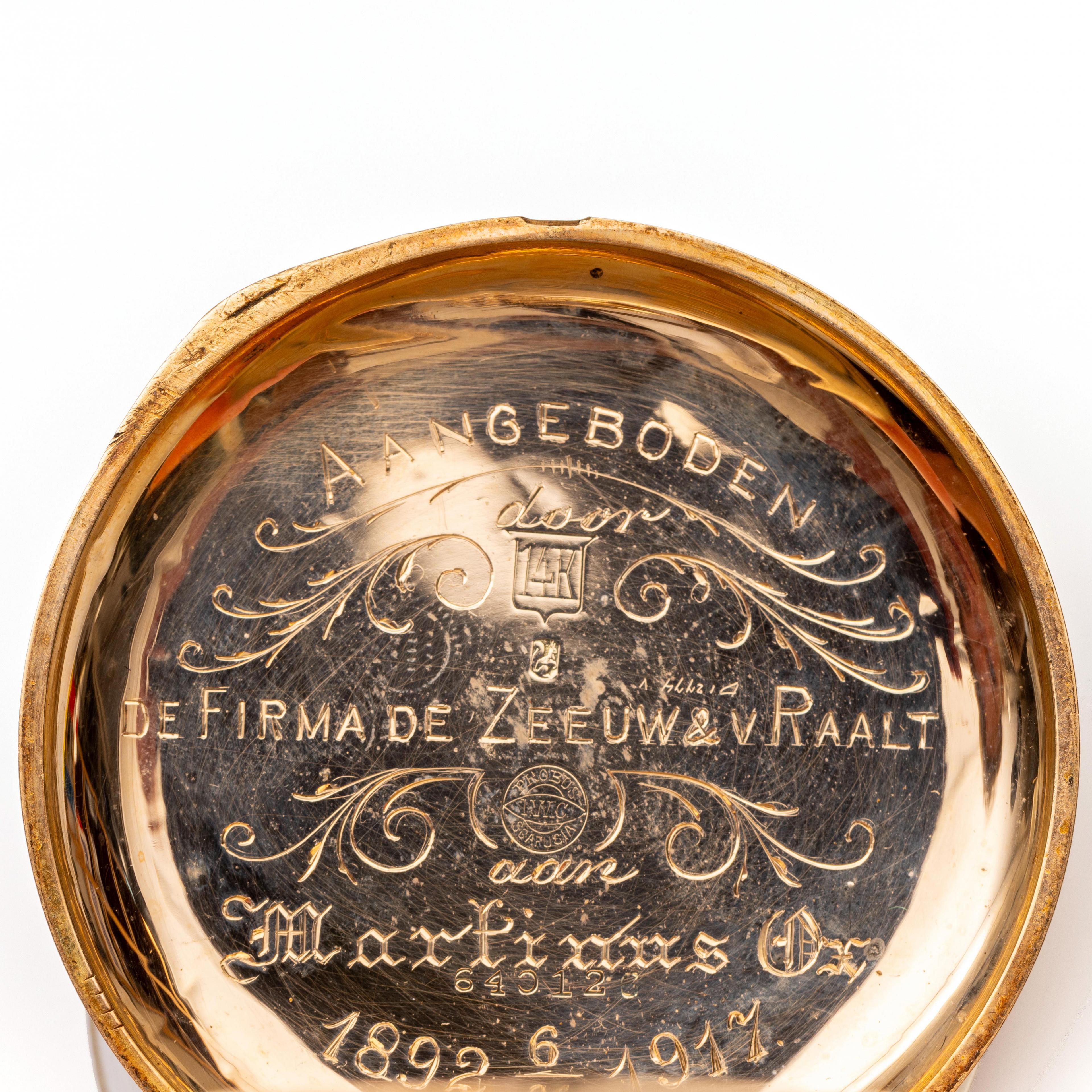 Met witte wijzerplaat met Arabische cijfers voor de uren en minuten en secondeaanduiding op de zes. De binnendeksel en hangoog onedel. De binnenzijde van de buitendeksel met gravure "Aangeboden door de Firma de Zeeuw & v. Raalt aan Martinus Ox 1892 - 1917". Hieraan een klein stuk 14 kt. ketting van een Milanese schakel.