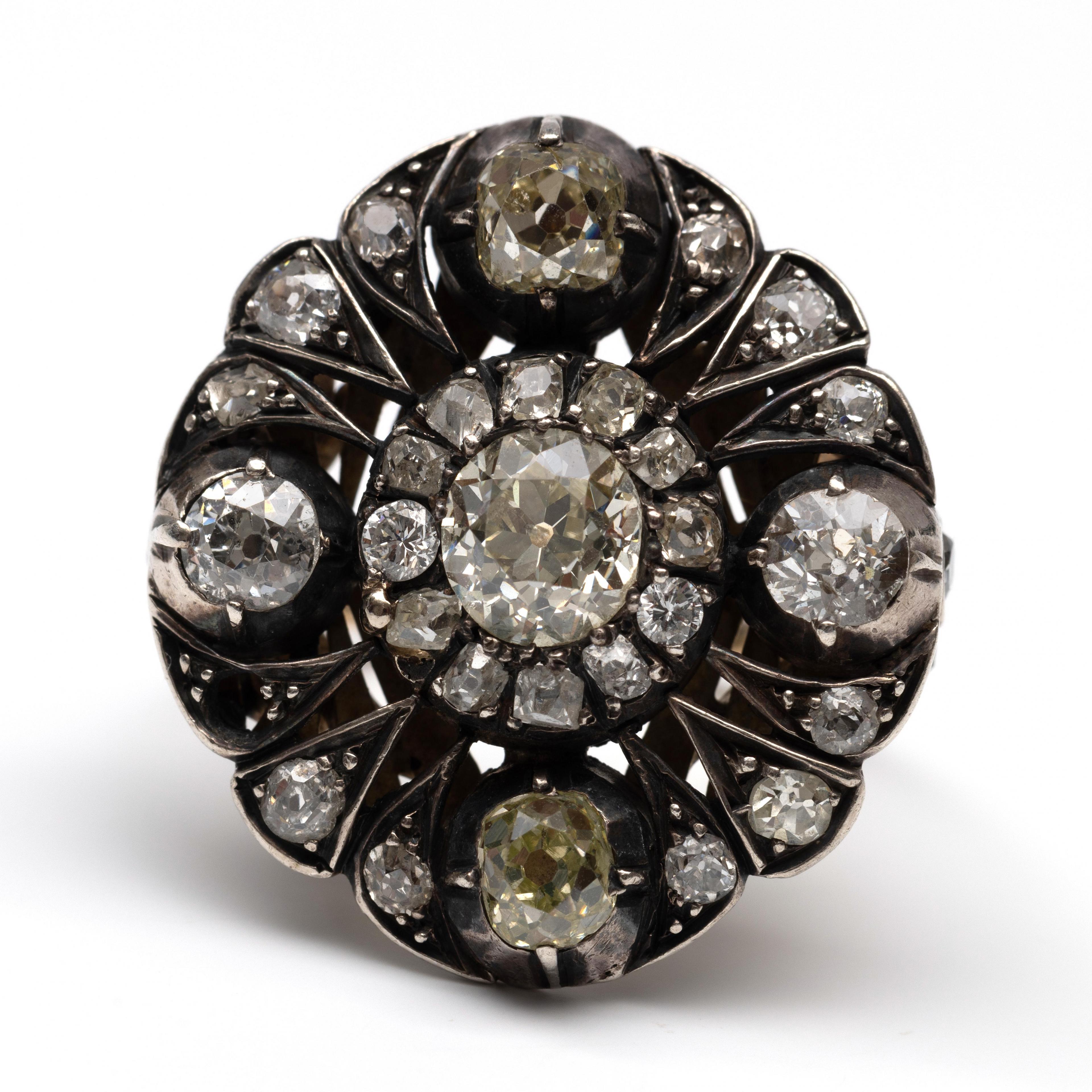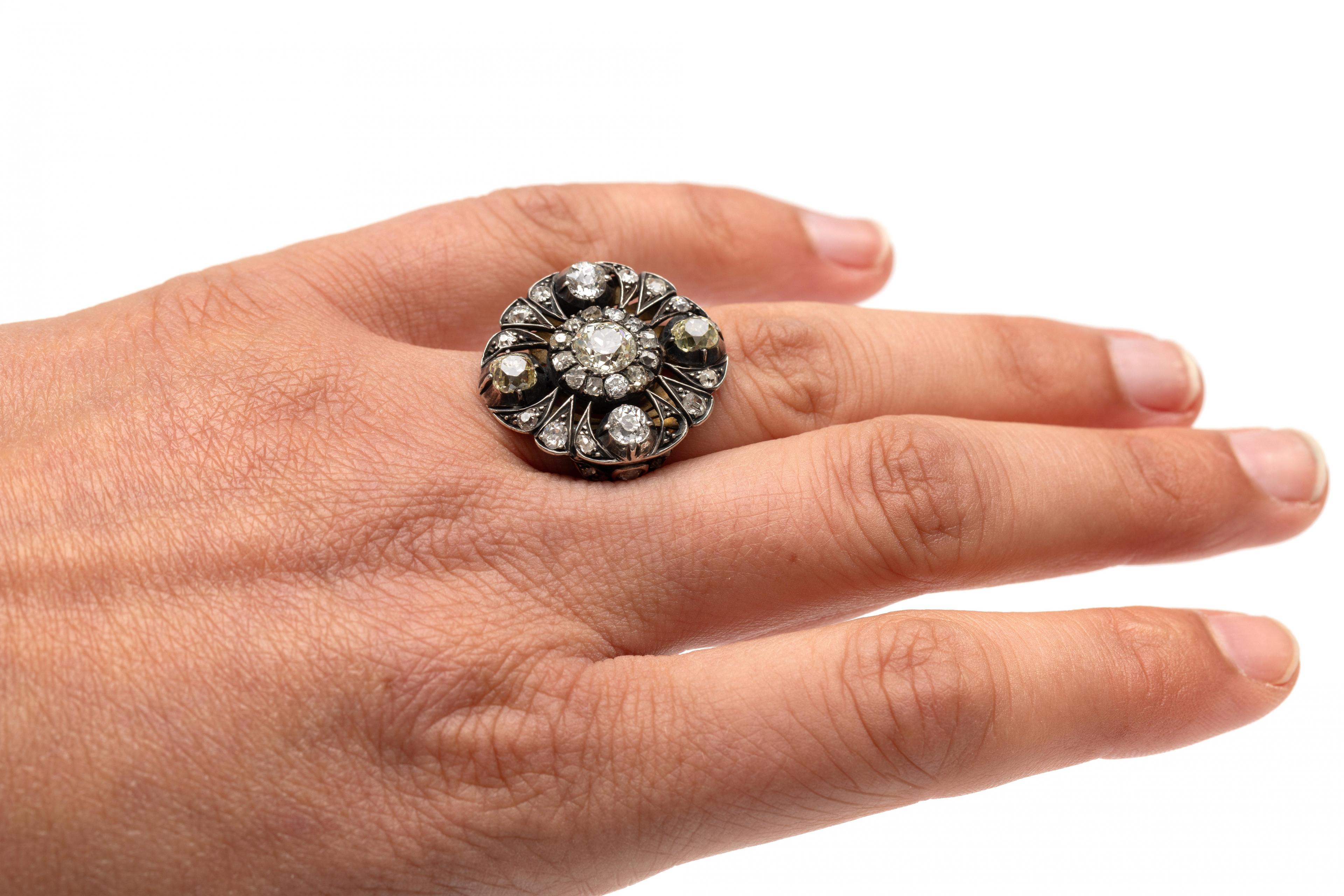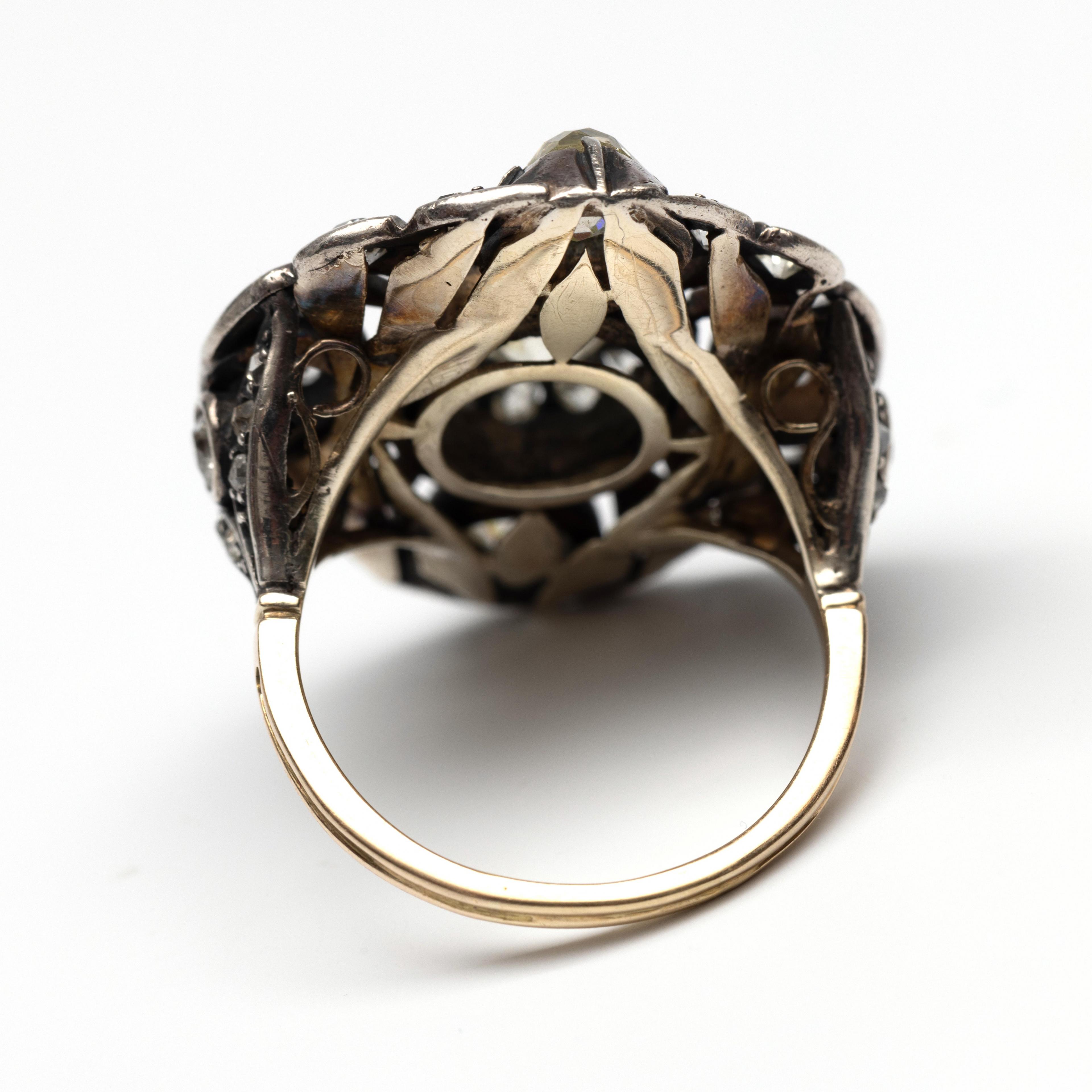 Gold with silver ring. Centrally set with a yellow old brilliant cut diamond (approx. 0.85 ct) in an entourage of small old brilliant cut diamonds (two replaced by a modern brilliant). Around which leaf motifs, set with two yellow and two white old brilliant cut diamonds of approx. 0.20 - 0.25 ct. each, between which smaller old brilliant cut diamonds. The three yellow diamonds in a vertical row. The shoulders each set with an old brilliant cut diamond and six rose cut diamonds (one replaced by a modern brilliant). Total diamond weight approx. 2.50 ct.