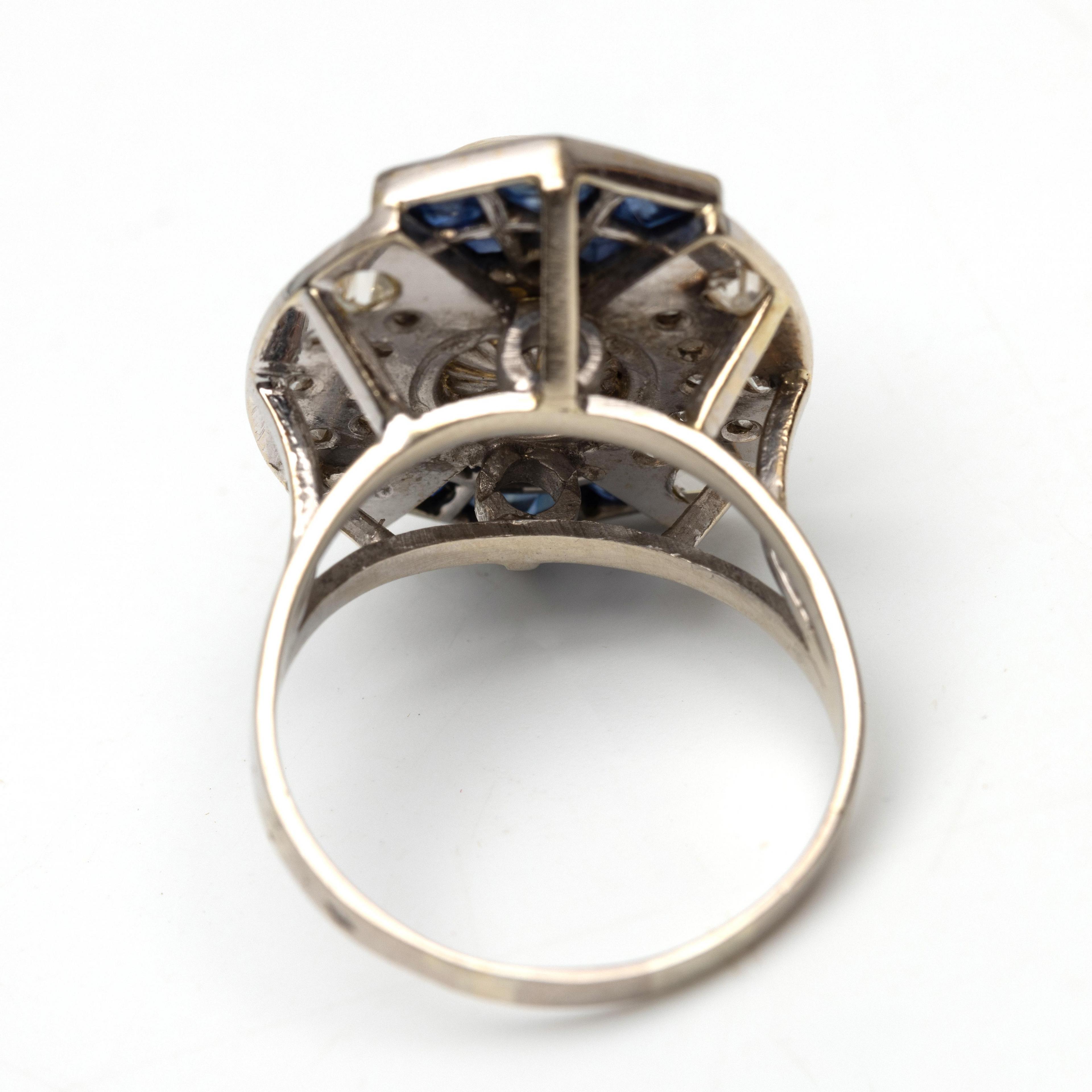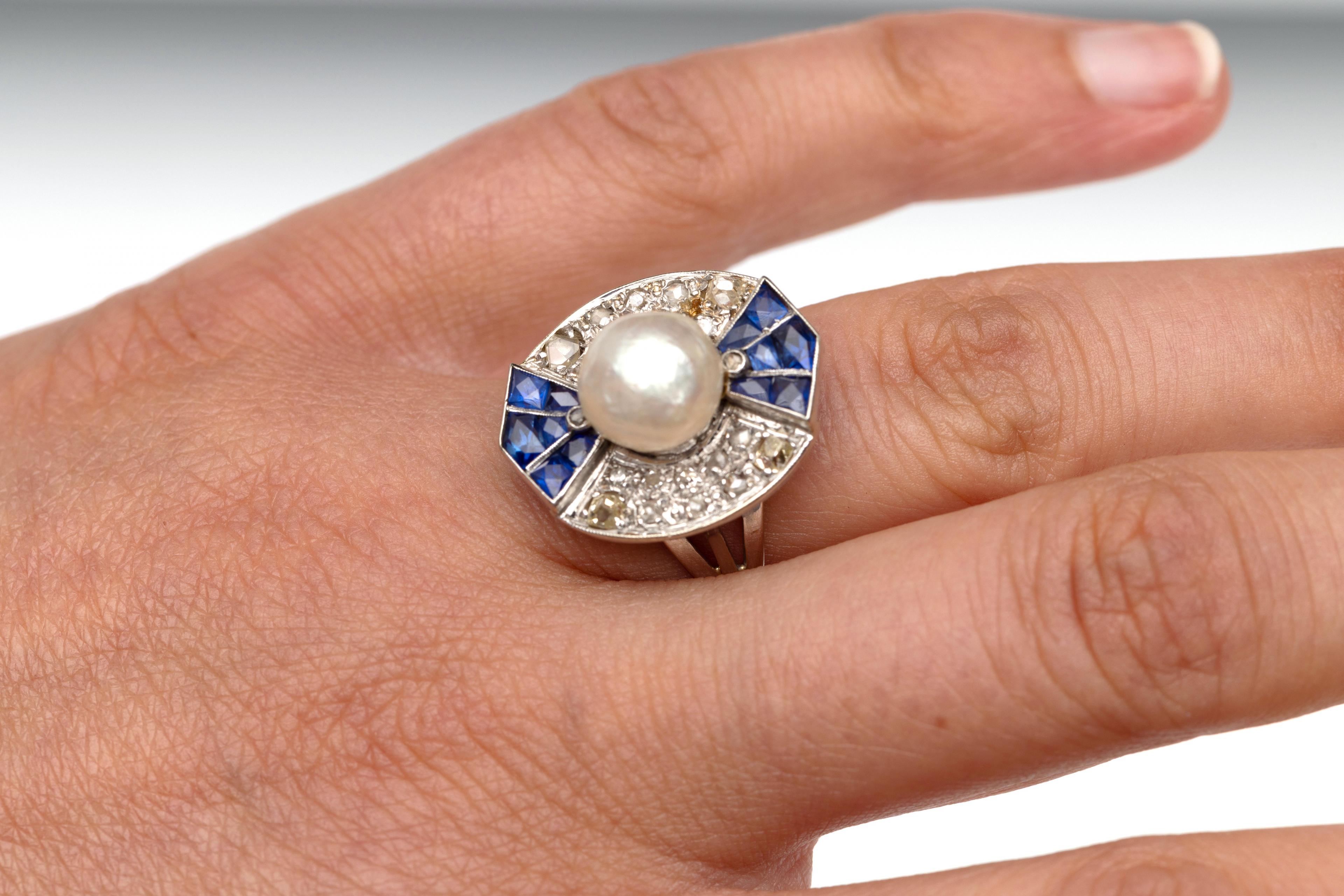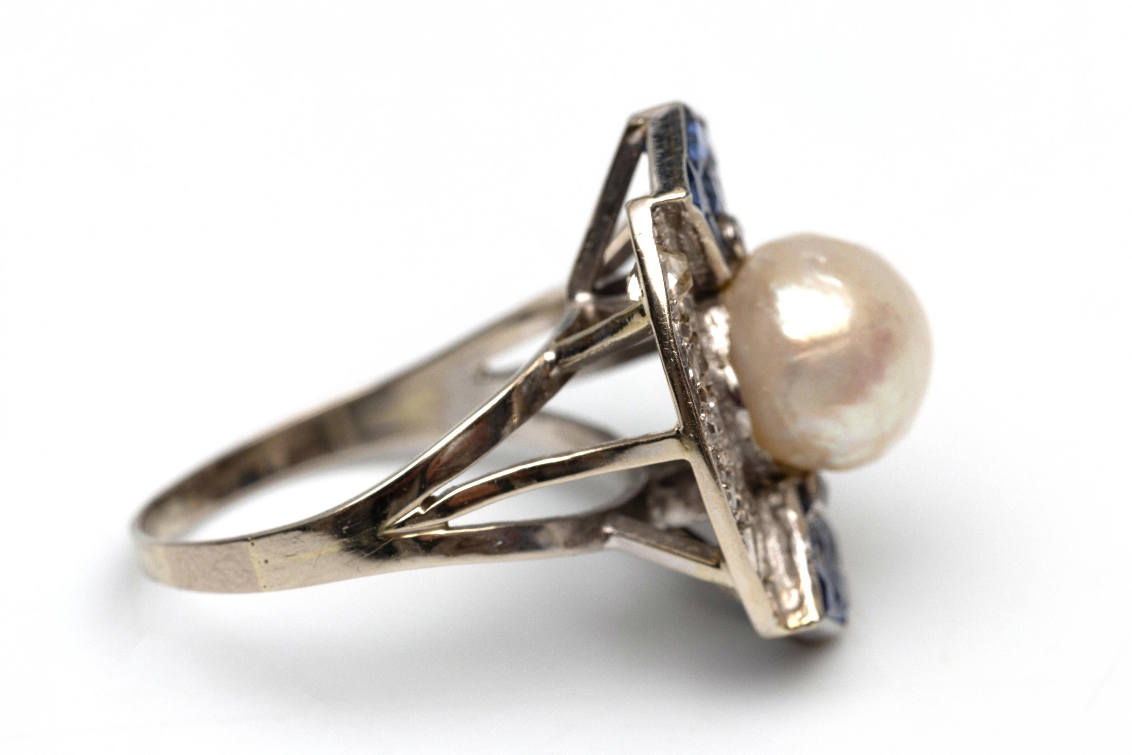 18 k. White gold Retro applique ring. Centrally set with a pearl with above and below a fan-shaped applique set with calibrated blue sapphire and a small rose-cut diamond. On either side of the pearl, the top pavé set with small old brilliant and rose-cut diamonds. With oral report from the Netherlands Gem Laboratory with report number P255948