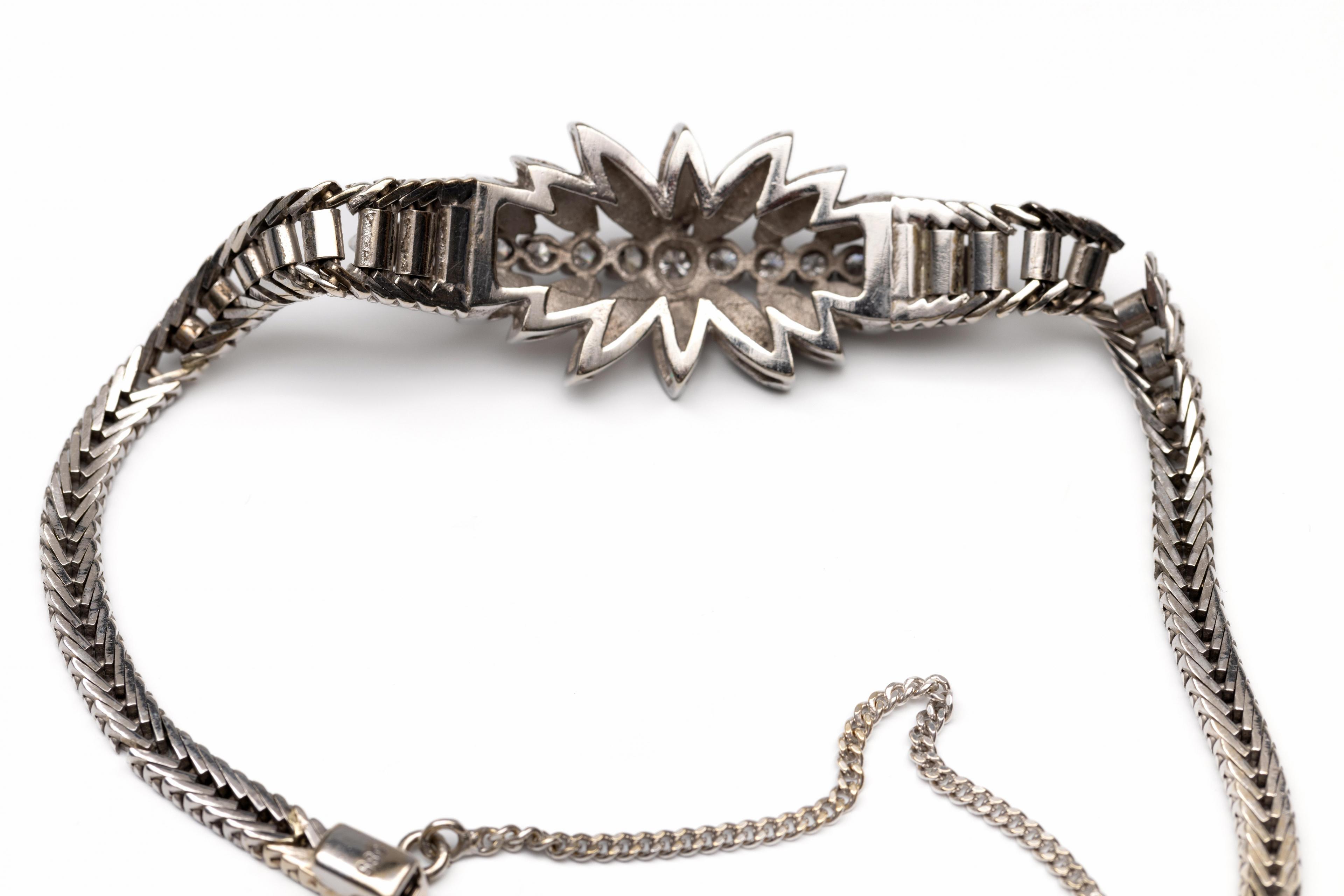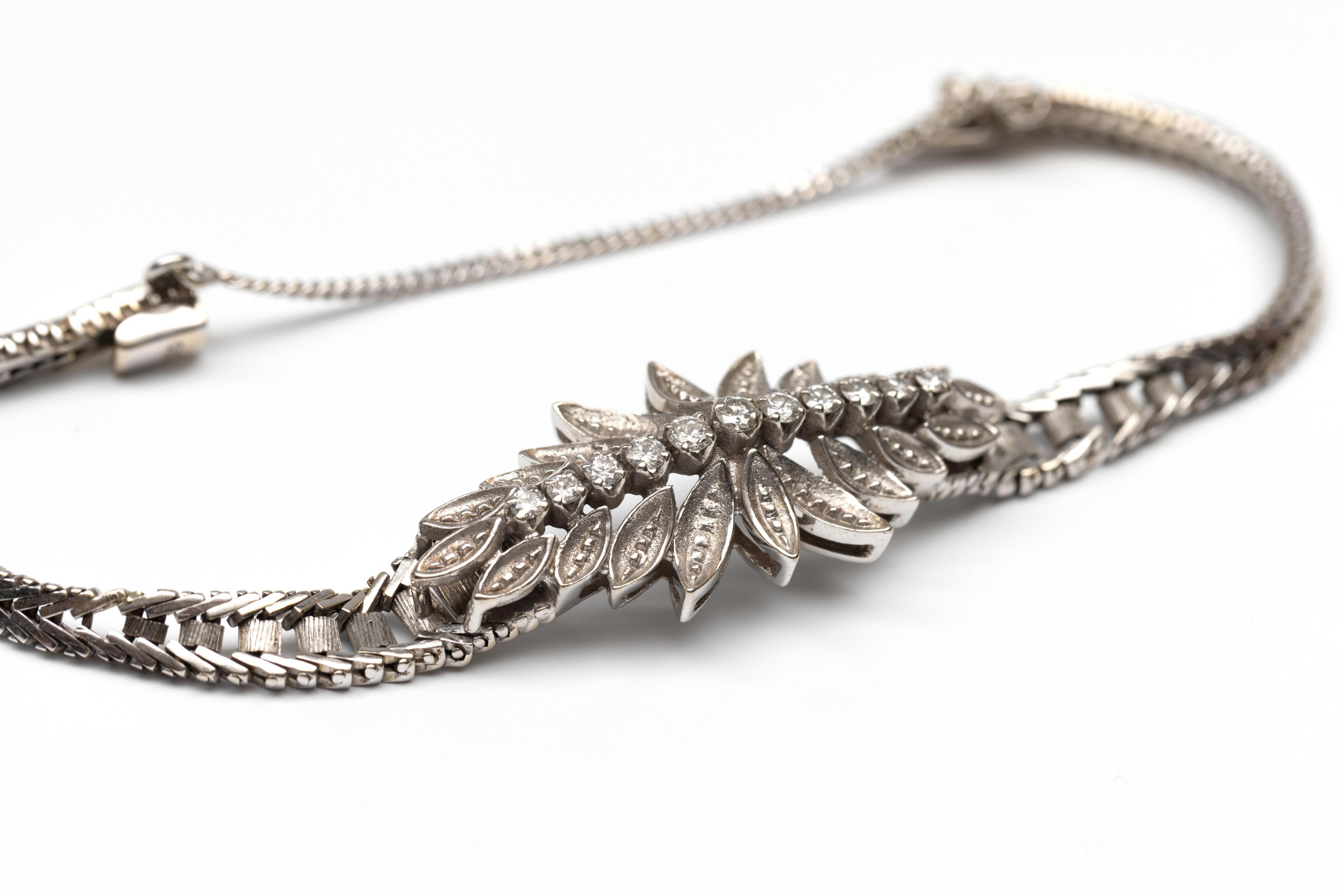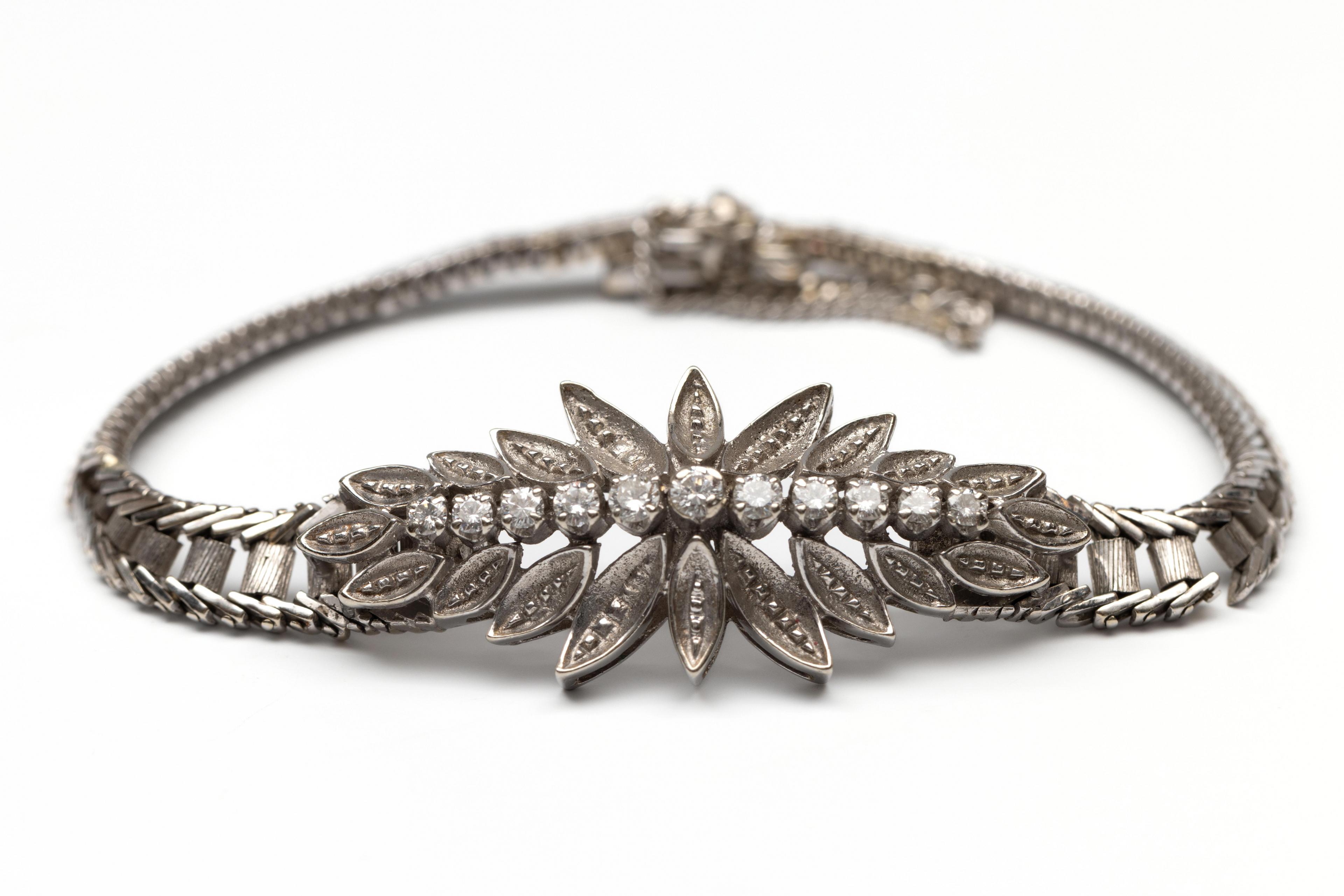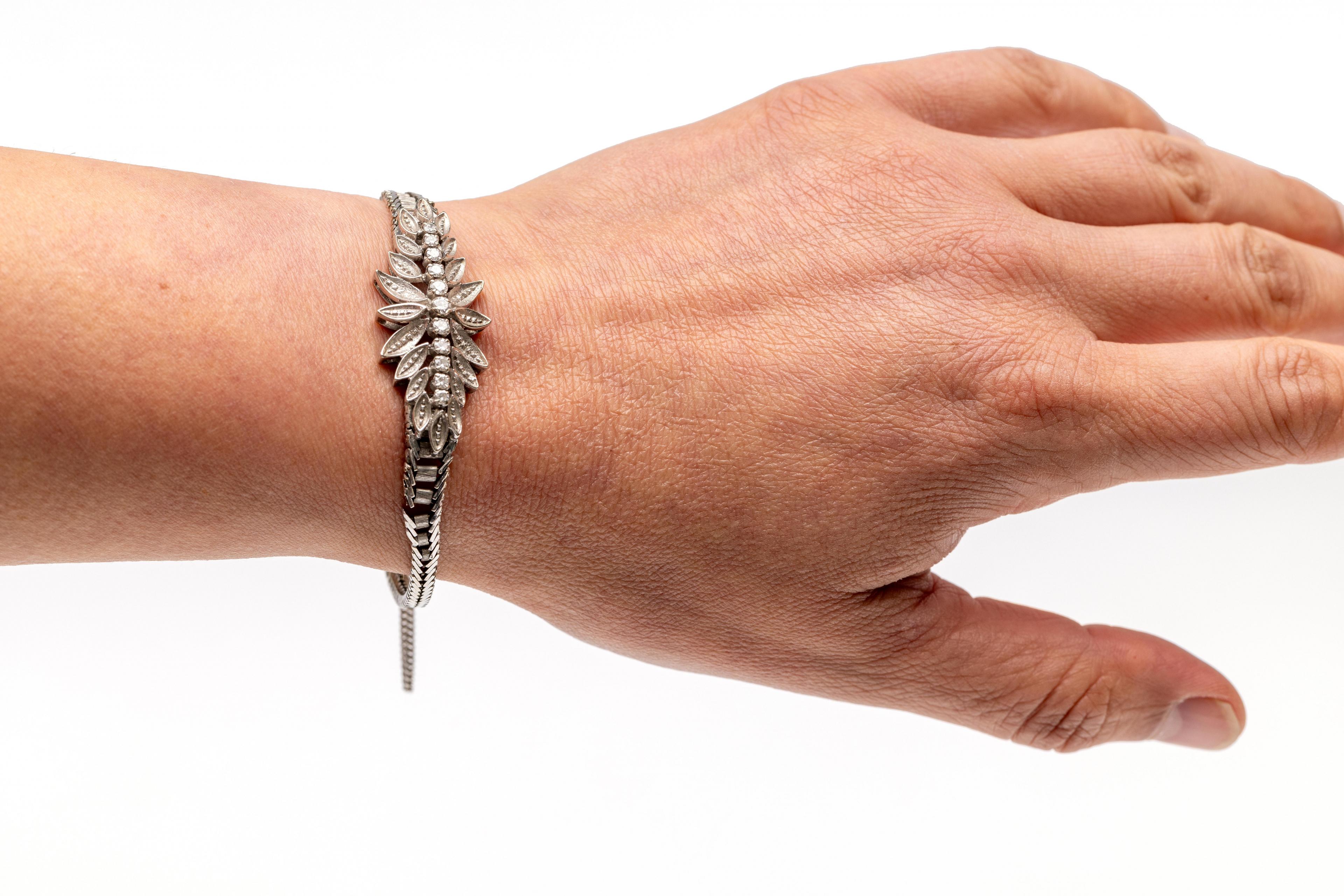 14 k. White gold bracelet, 1960s. With a central marquise-shaped applique on which a row of brilliant-cut diamonds, decreasing in size from the middle, with a total weight of approx. 0.50 ct., surrounded by leaf-shaped ornaments. The band of a herringbone link, expanding towards the middle