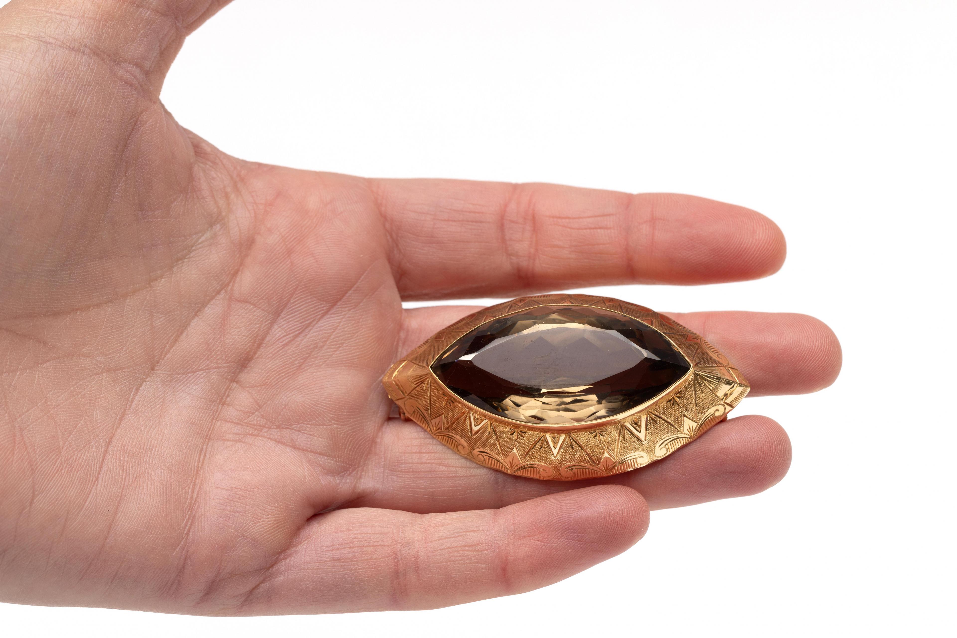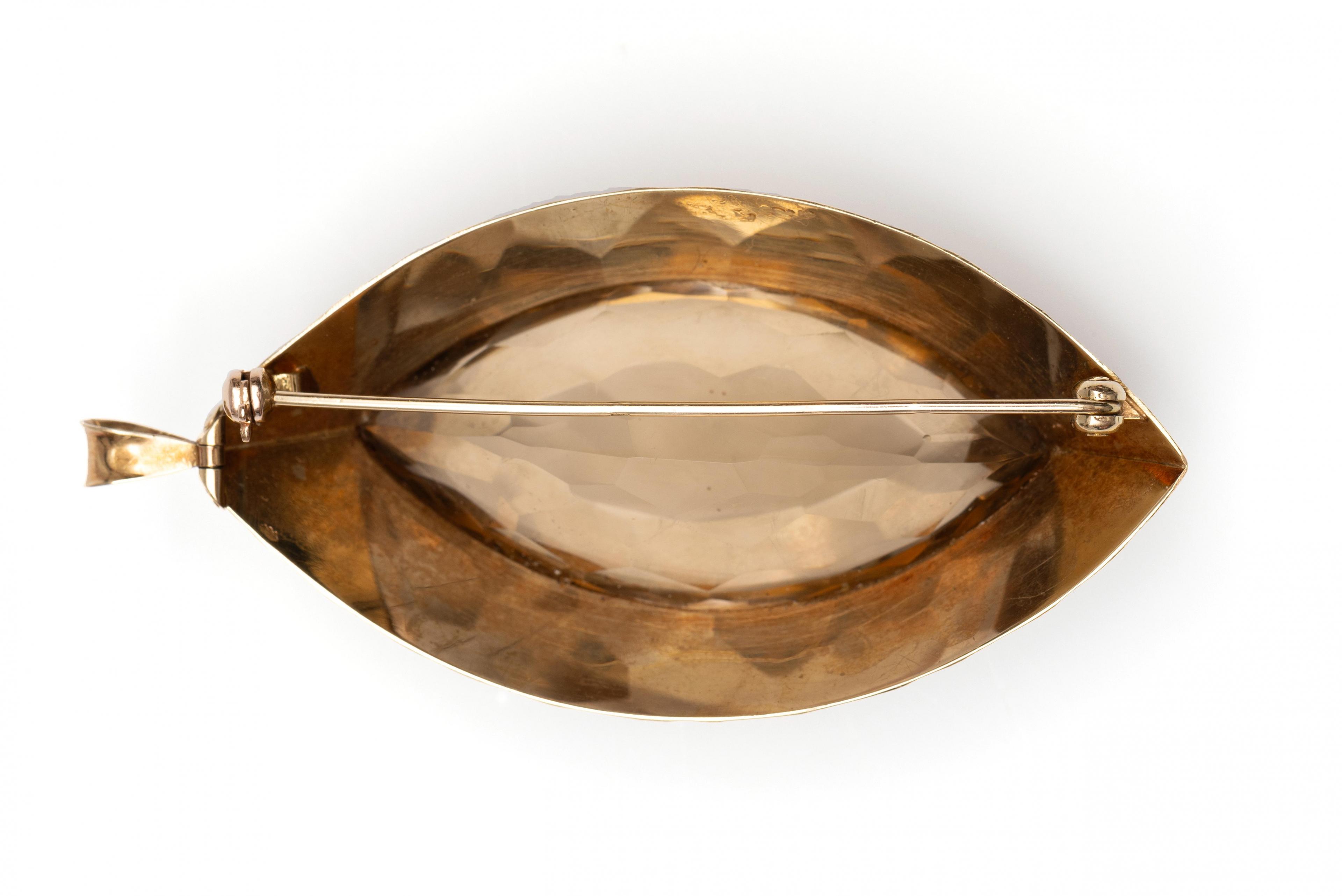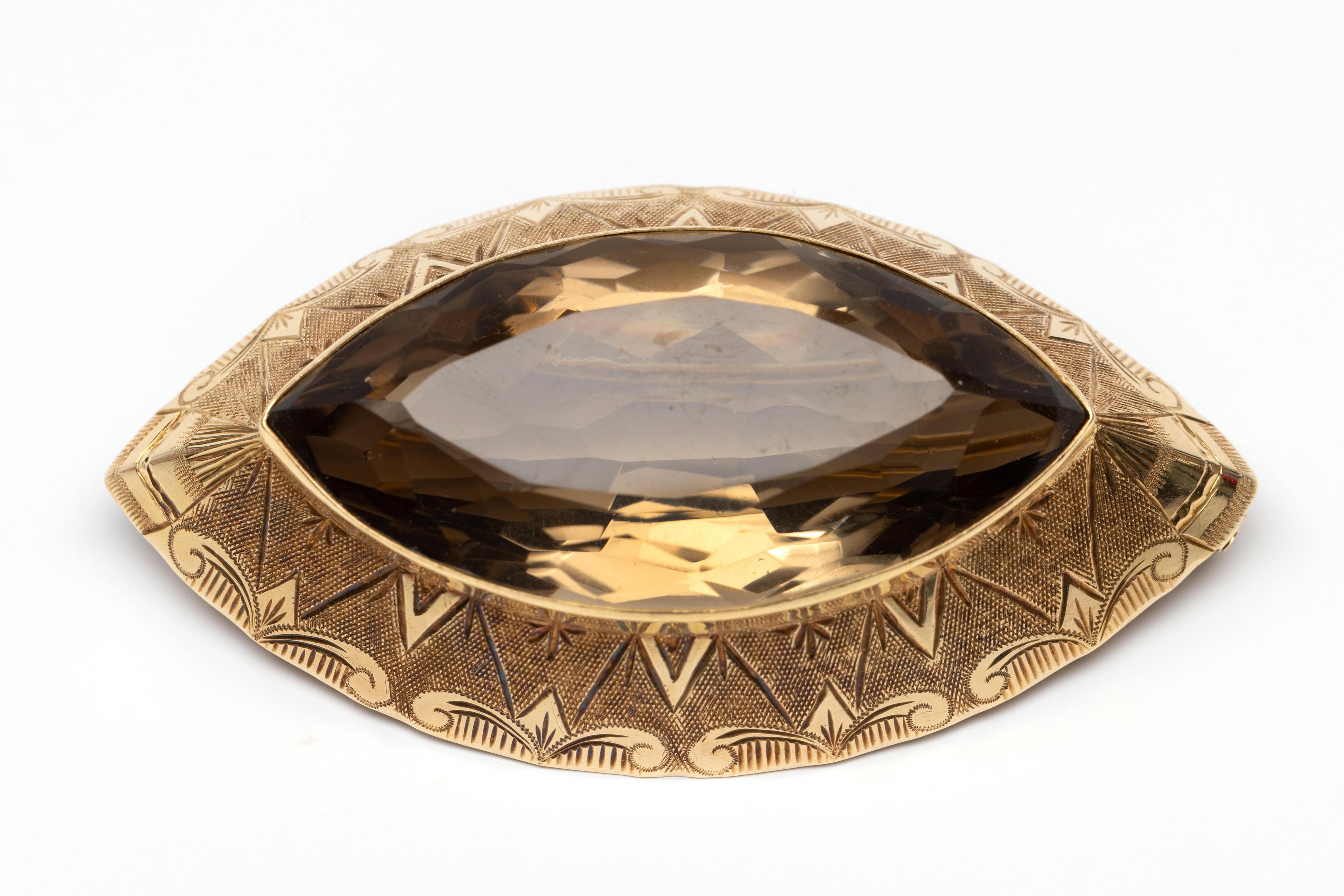 14 k. Gold pendant/brooch, 1970s. Set with a large marquise-shaped smoky quartz (approx. 42 x 20 mm). The bezel decorated with engraving.