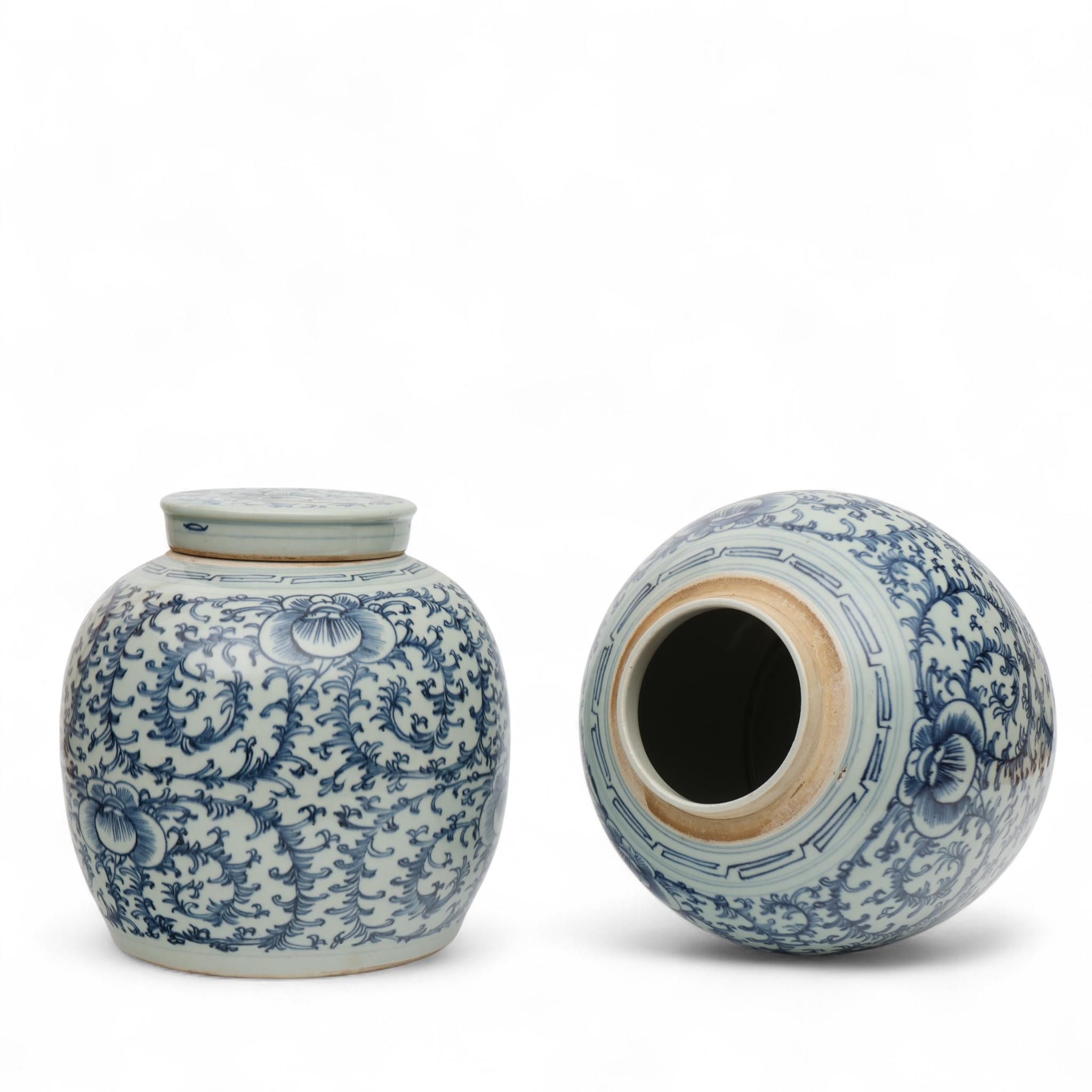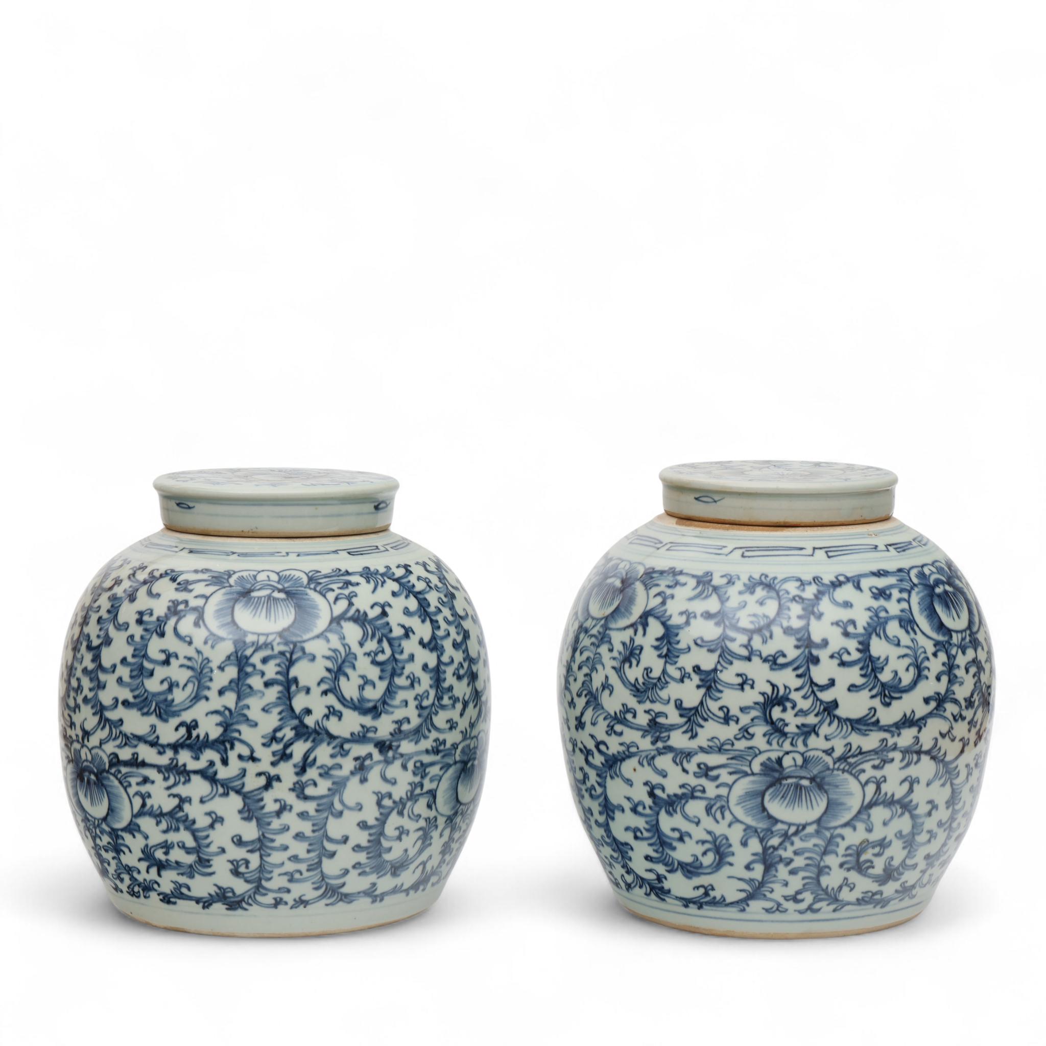 China, a pair of blue and white 'peony-scroll' jars and covers, 20th century,