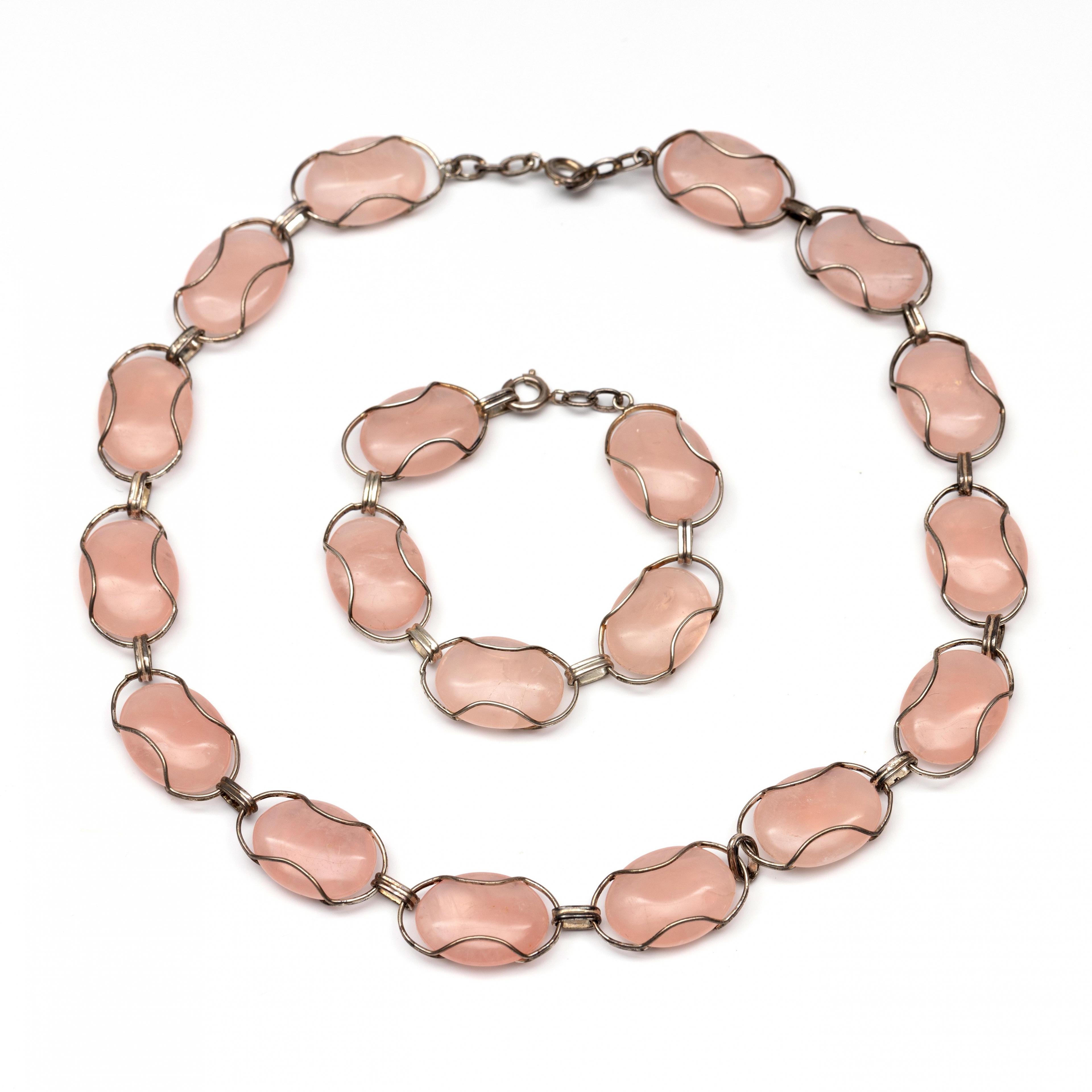 bestaande uit een rivière collier en een armband, beide bezet met ovale cabochon geslepen rozenkwarts (ca. 21 x 16 mm)