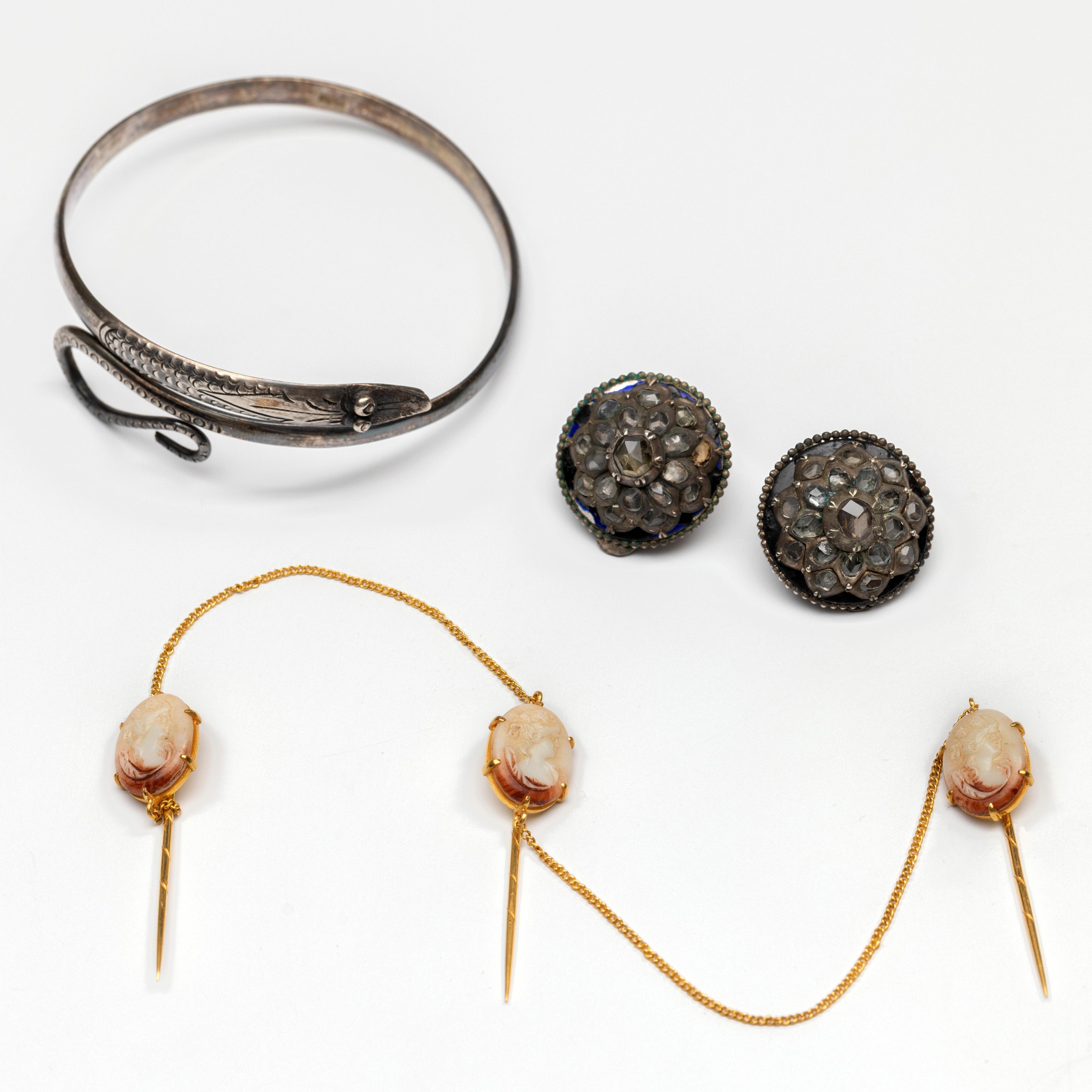 Various Indonesian jewellery; high-carat gold kabaja pins, connected by a piece of curb link and set with a cameo in paté de verre, silver torque bracelet in the shape of a snake and a pair of silver ear clips with a rosette set with imitation rose-cut diamonds against a background of blue enamel
