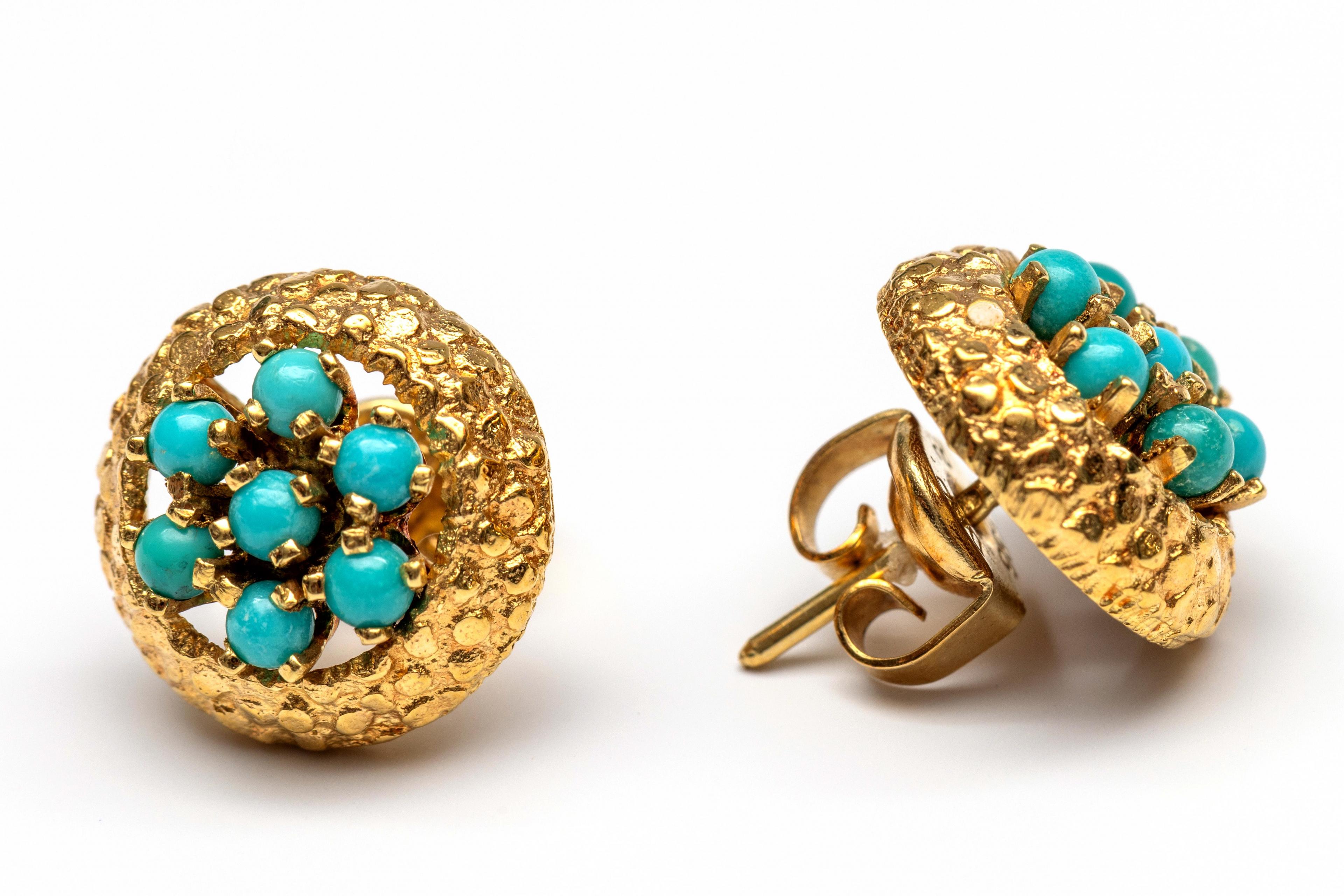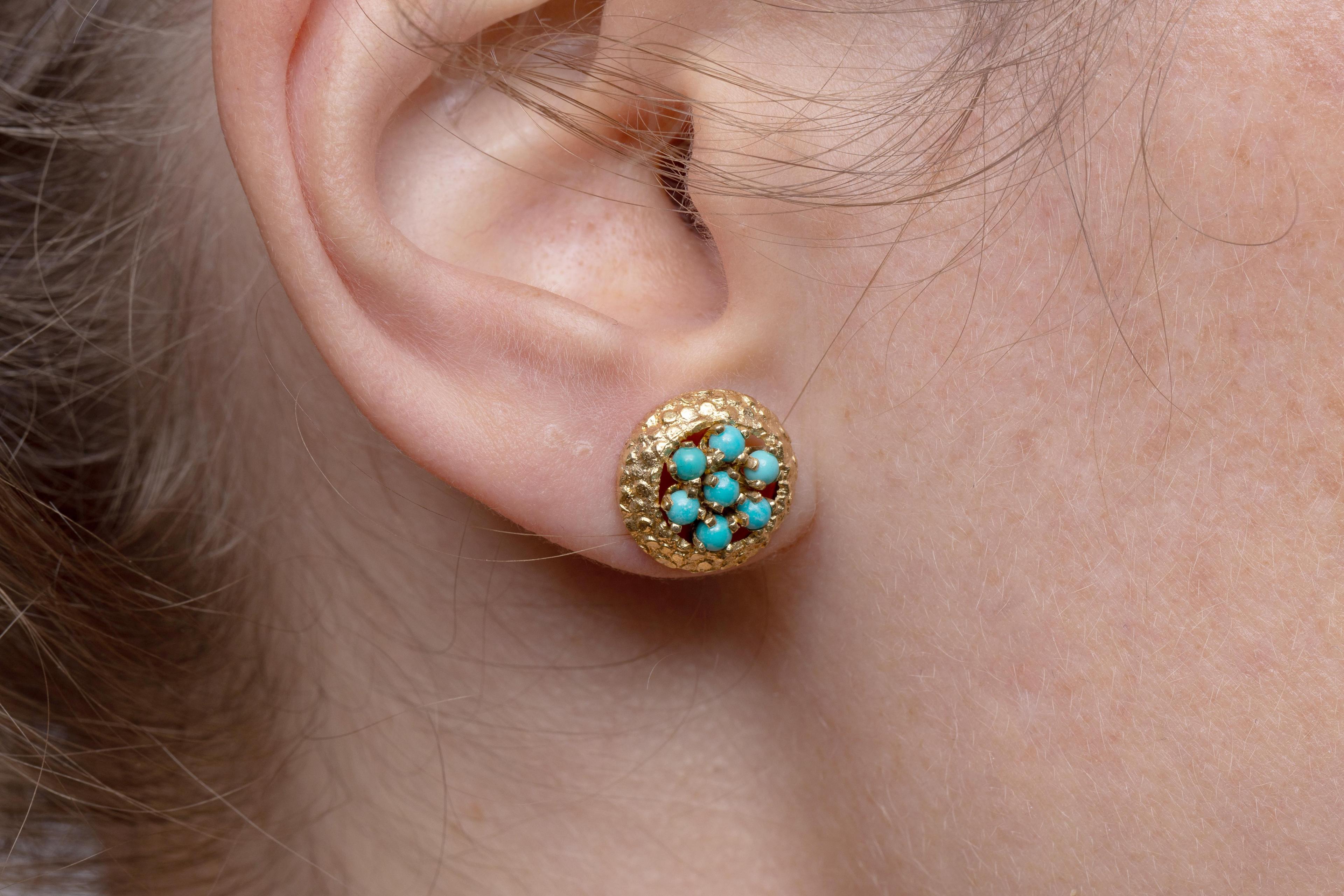 14 k. Gold stud earrings, 1960s - 1970s, set with small cabochon cut turquoise