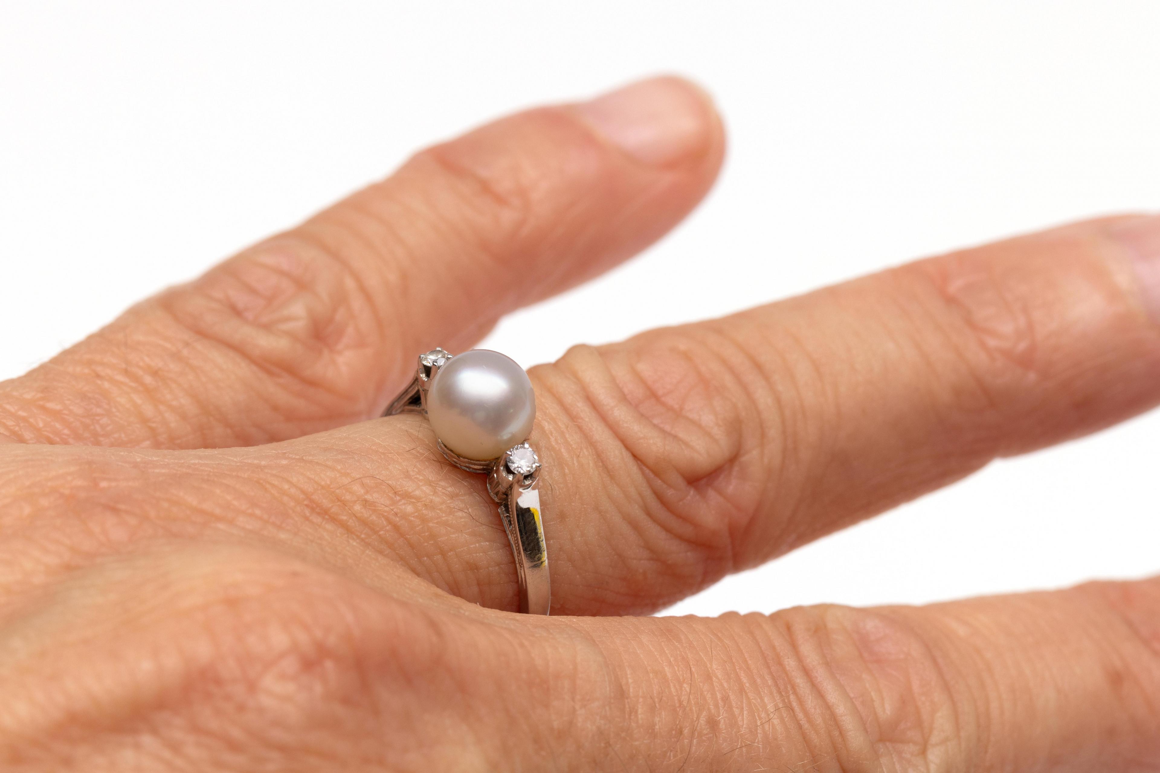 14 k. White gold ring, centrally set with a cultured pearl (diam. approx. 6.5 mm), with a small brilliant cut diamond on either side. Maker's mark Kohler and Van 't Zelfde, The Hague 1745 - 1974.
