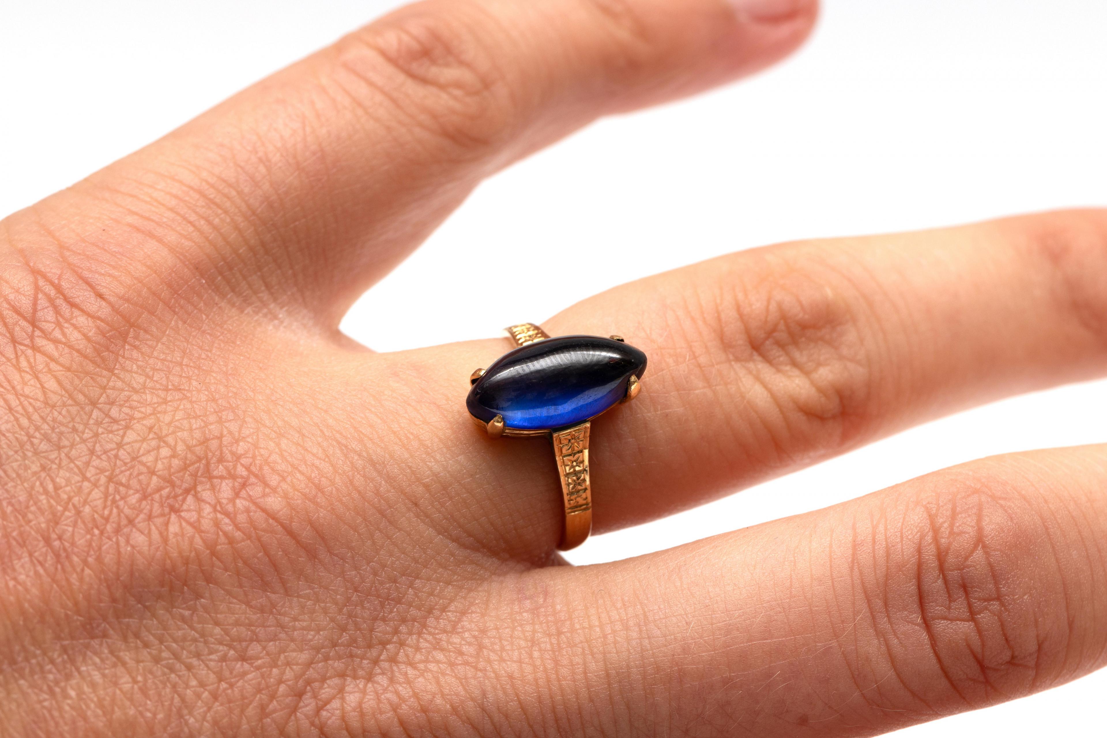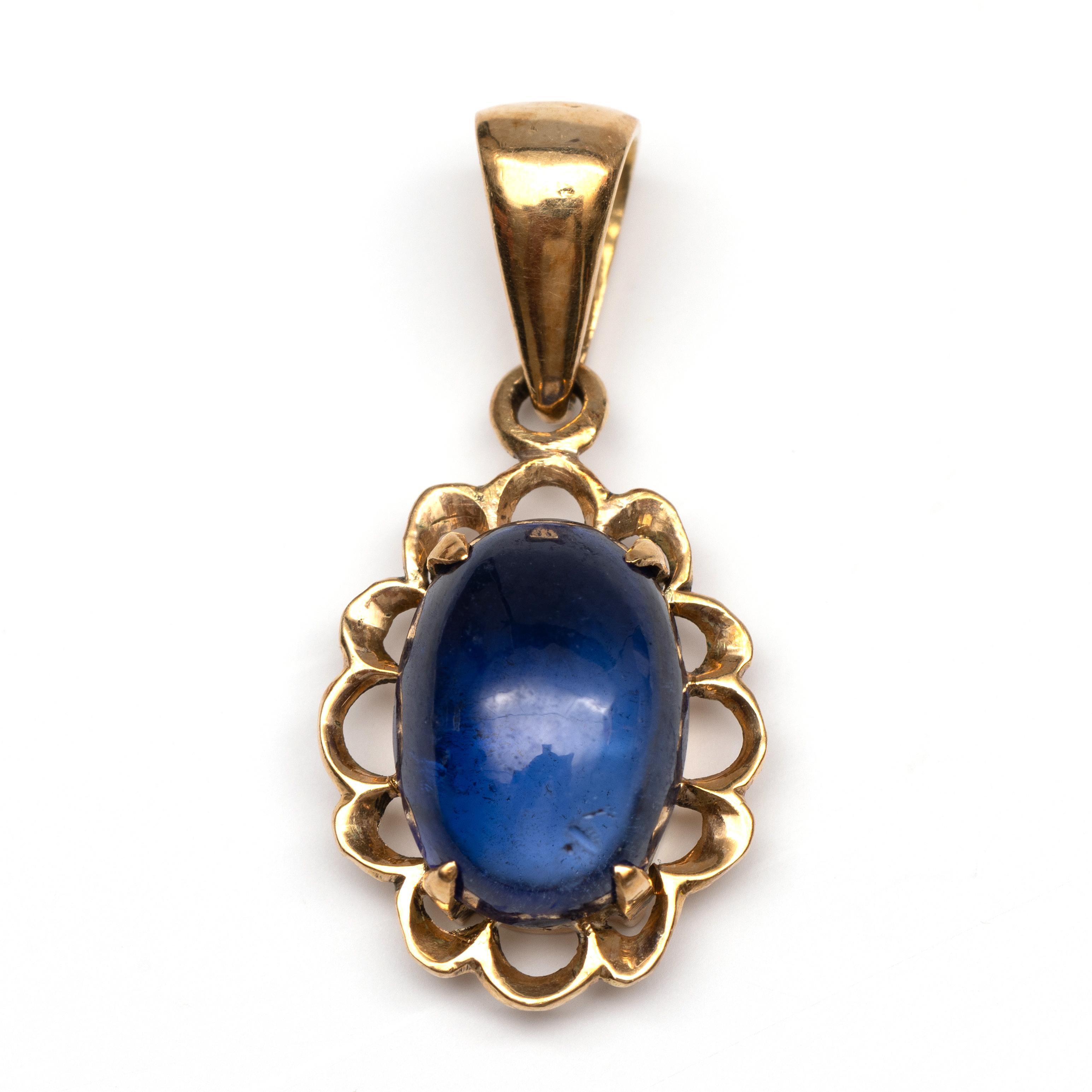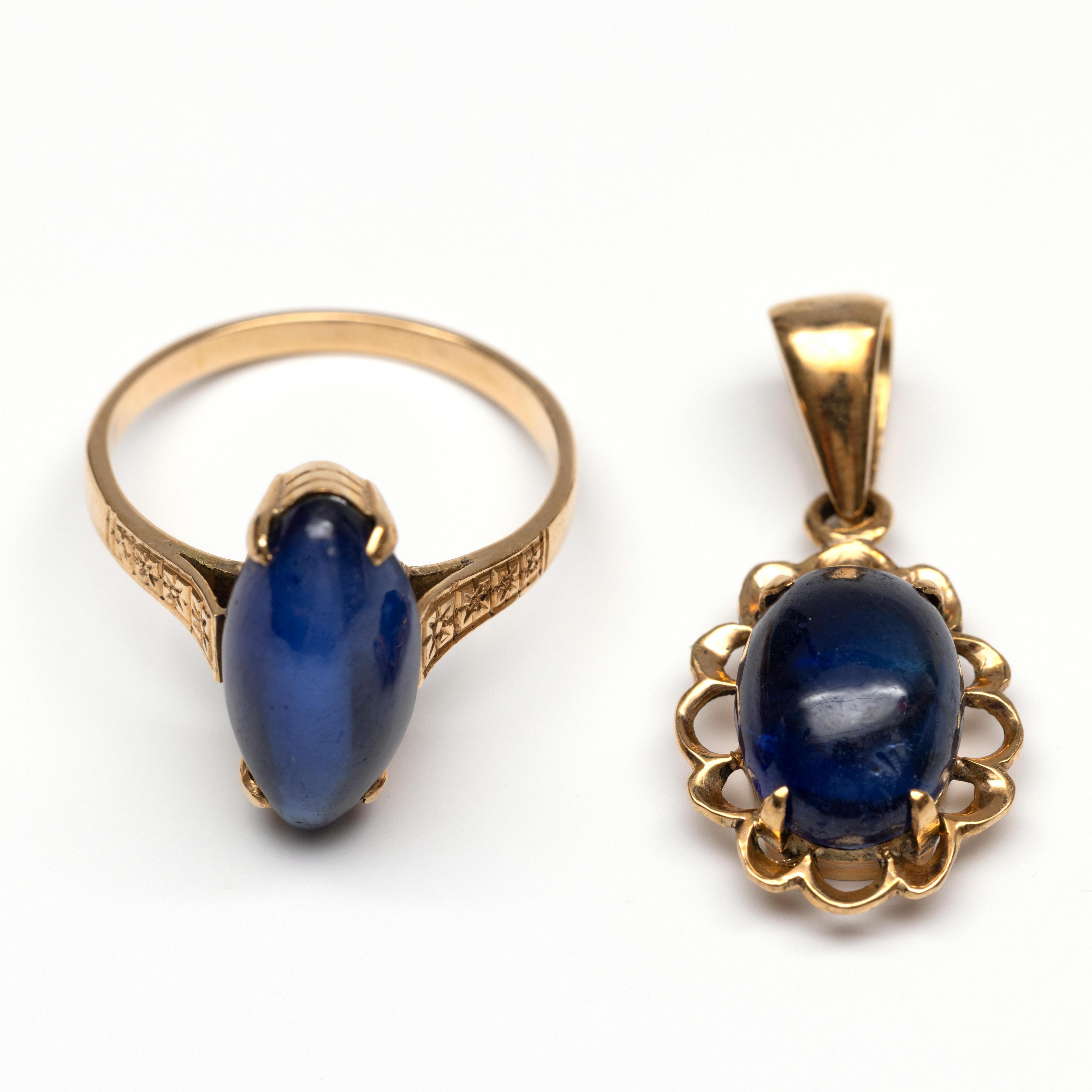 Gold ring and pendant. Both set with an oval cabochon cut synthetic blue sapphire.