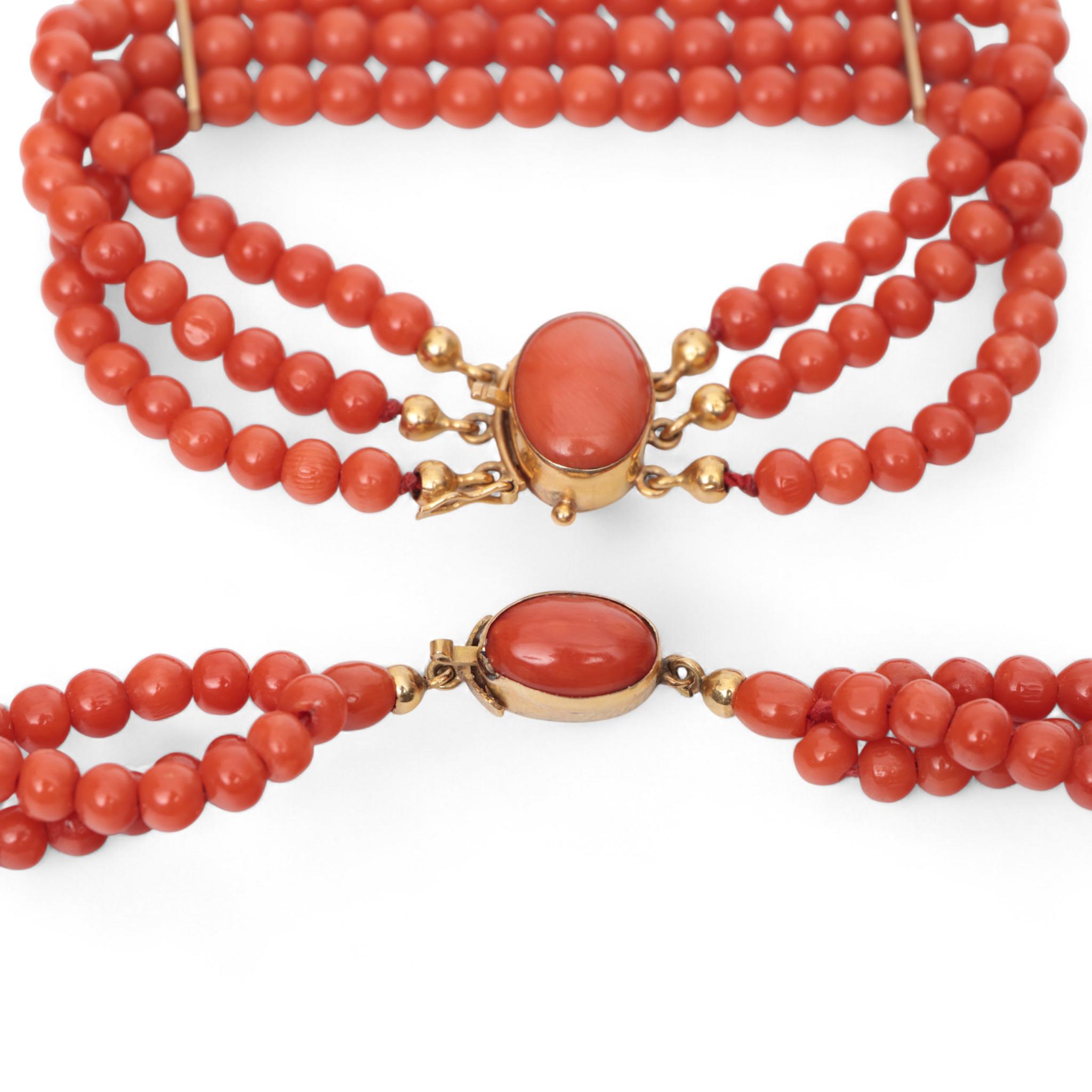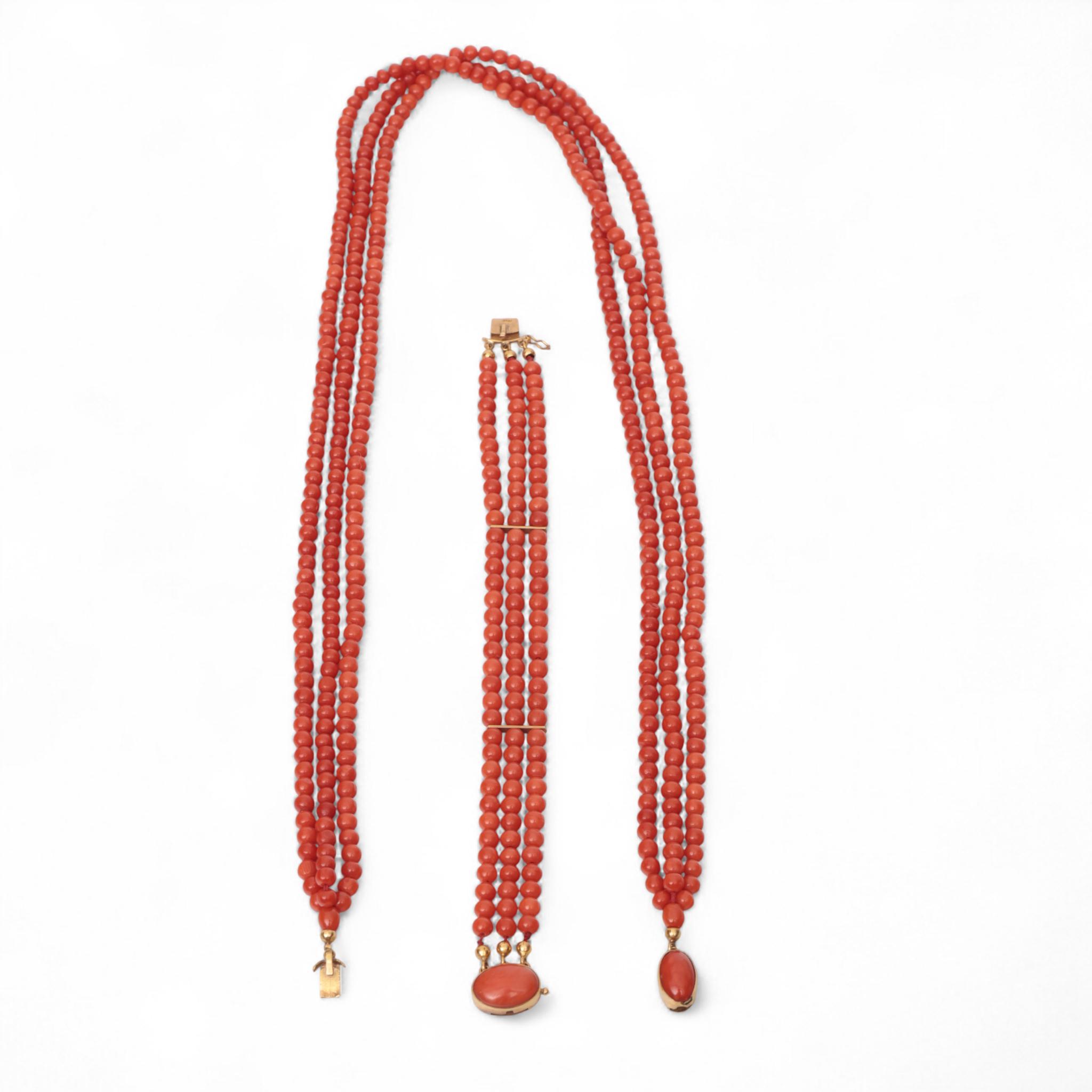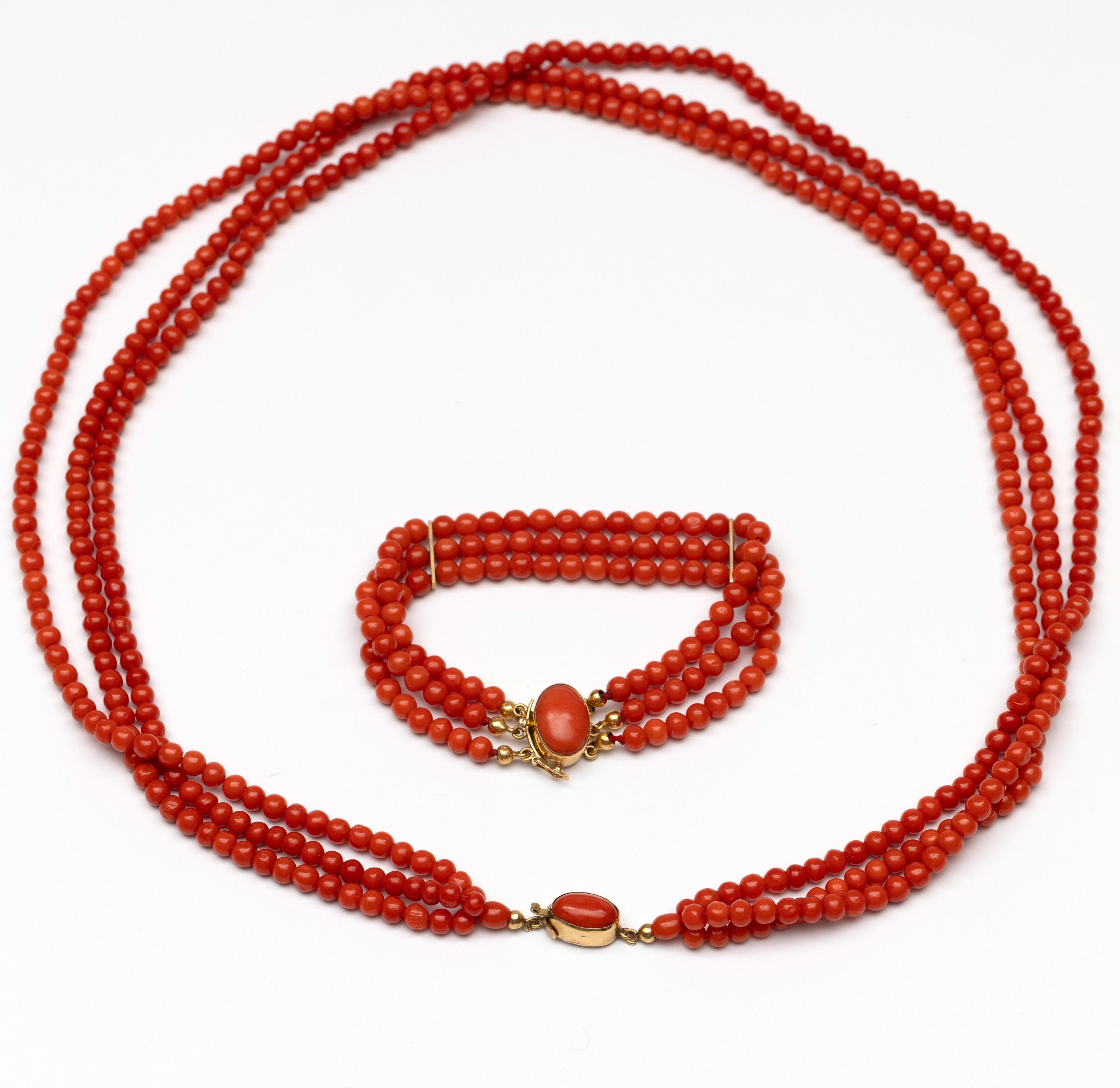 Necklace and bracelet. Both of three turns of round beads of red coral, on a gold clasp (acid tested 18 k.) set with an oval cabochon cut red coral. The bracelet with gold bars
