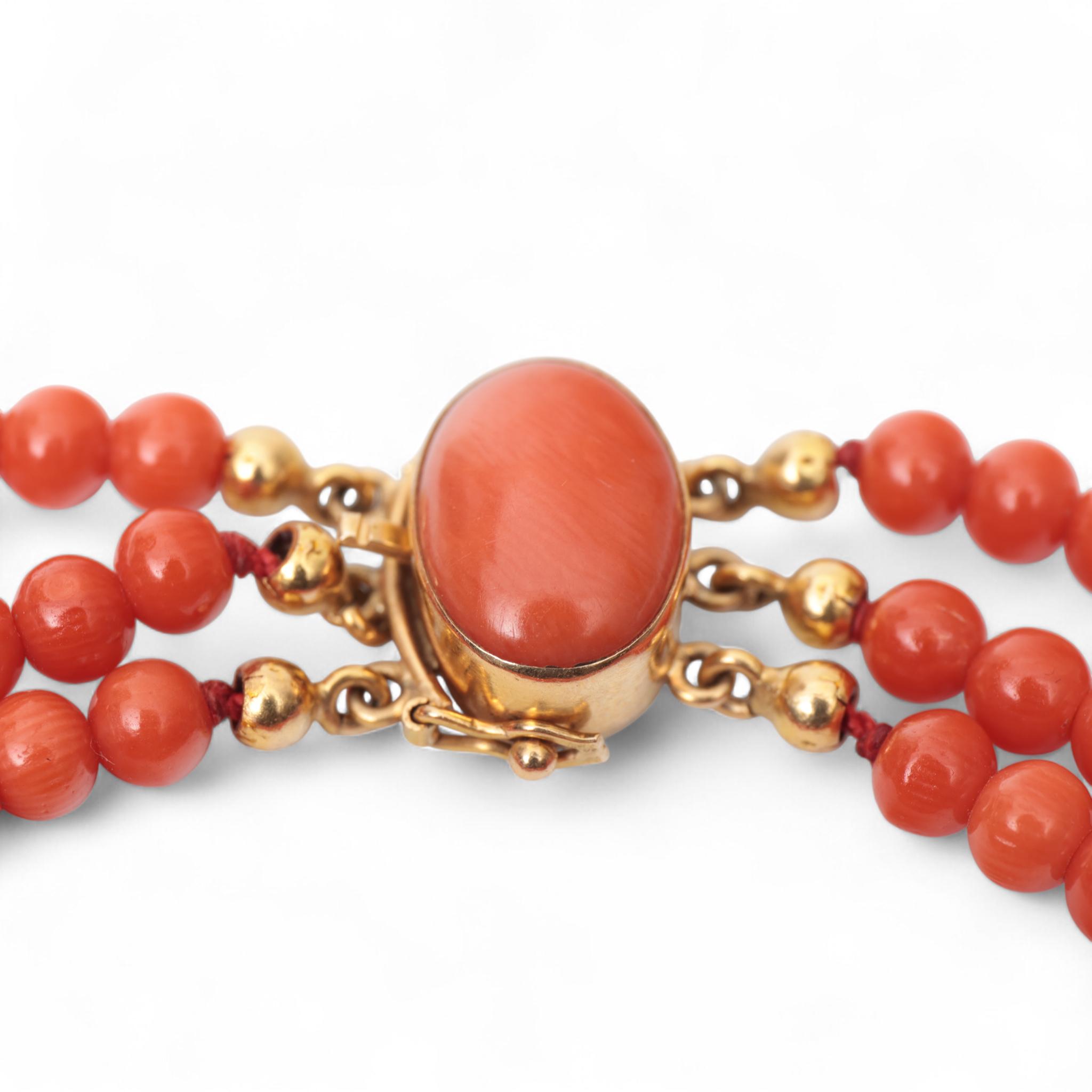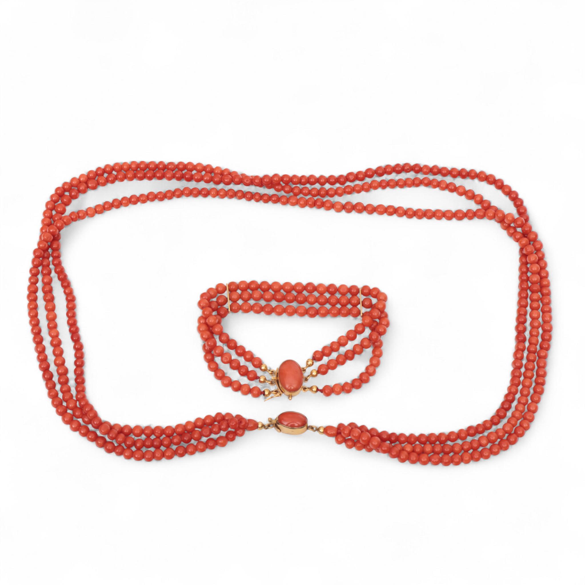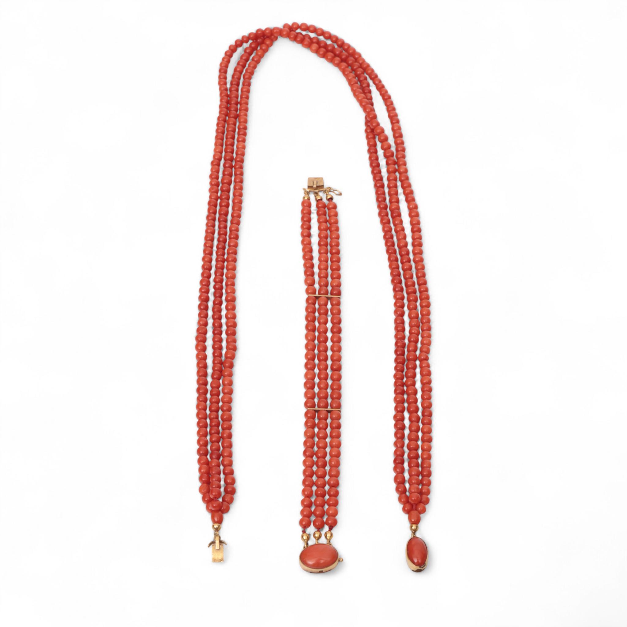 Necklace and bracelet. Both of three turns of round beads of red coral, on a gold clasp (acid tested 18 k.) set with an oval cabochon cut red coral. The bracelet with gold bars