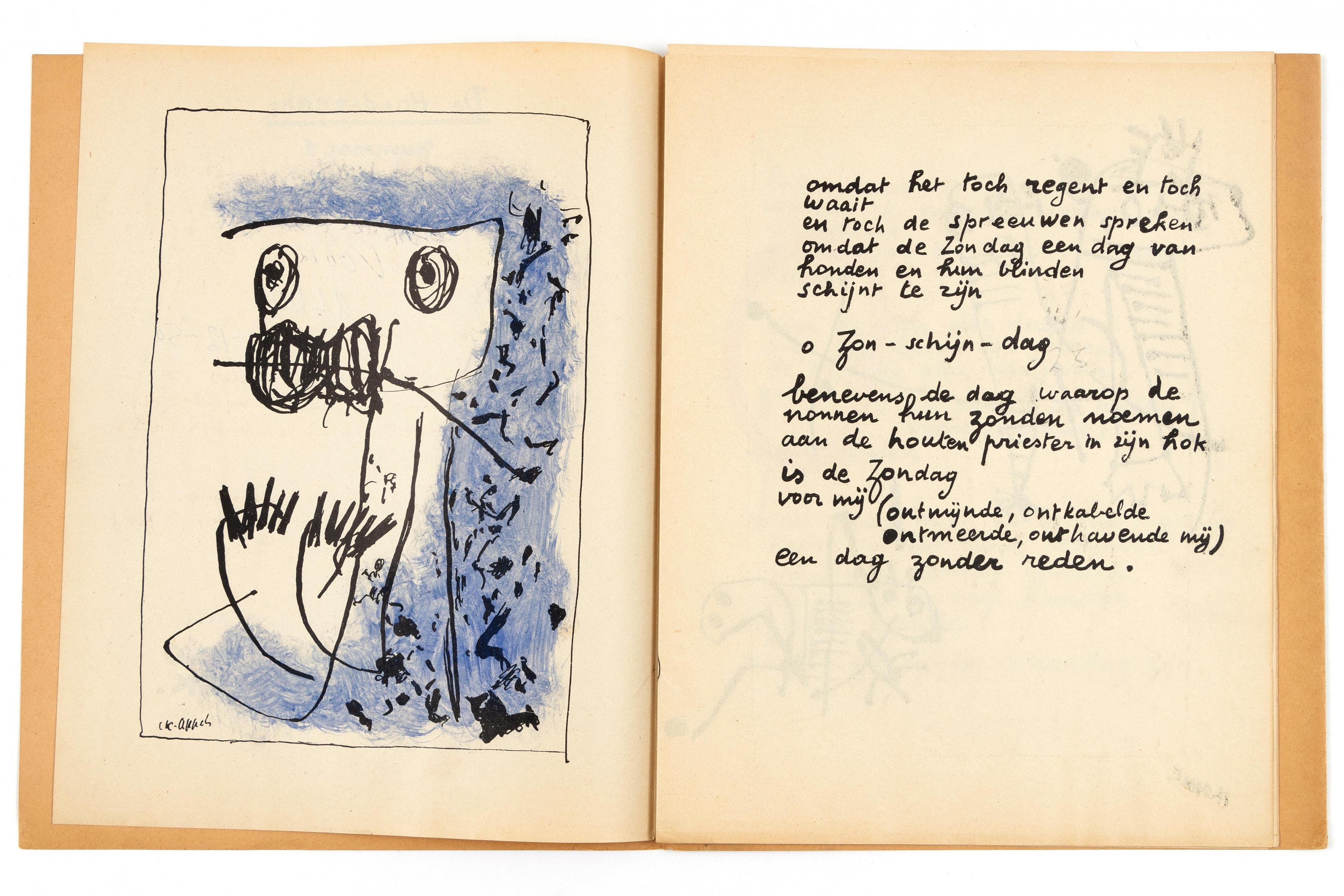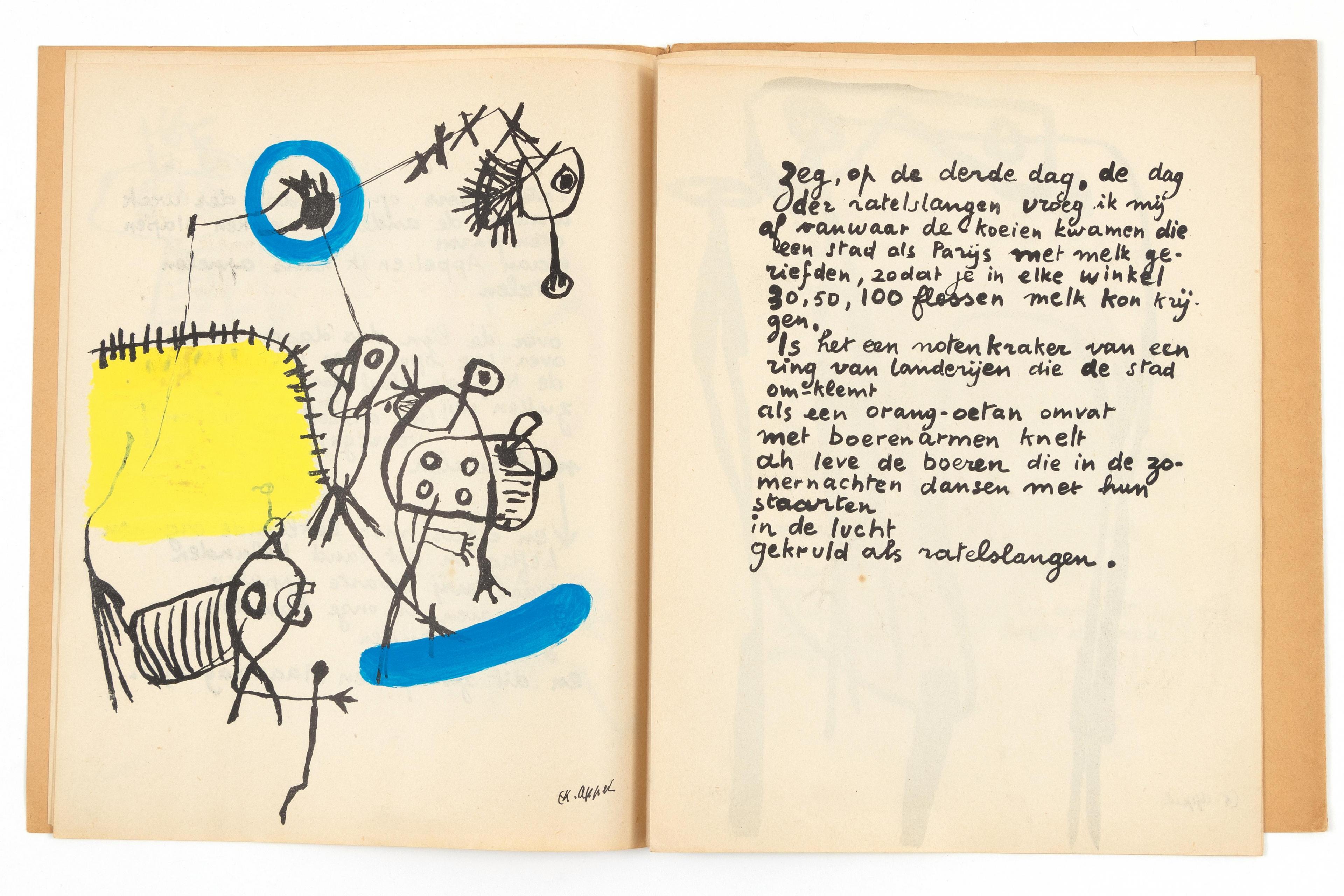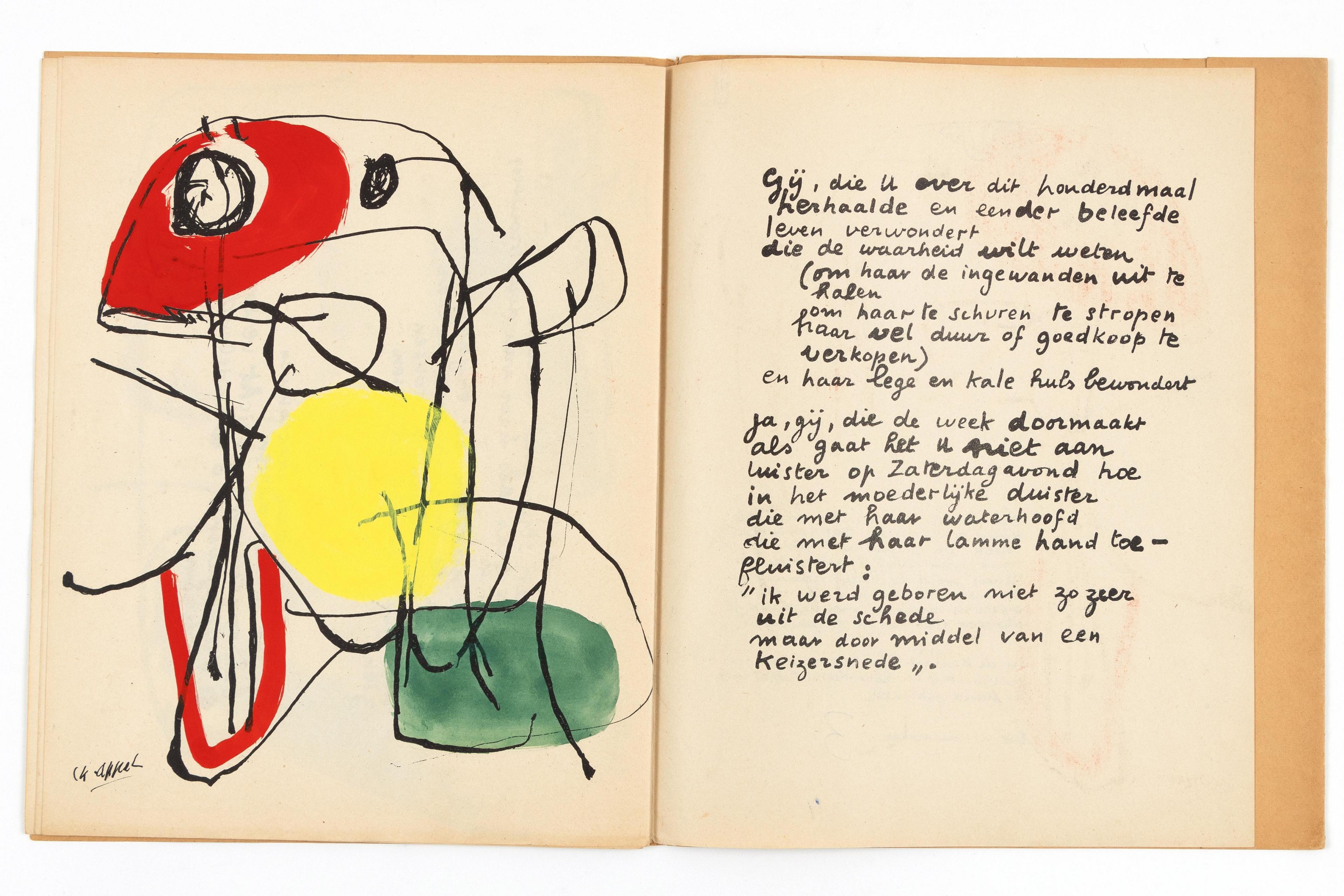folio with photocopy and handcolouring in gouache, signed by artist and author, dedicated by the artist 'voor Aldo 25-12-1950' on the title page, numbered '3' on the justification page, 27,5 x 22,7 cm.
