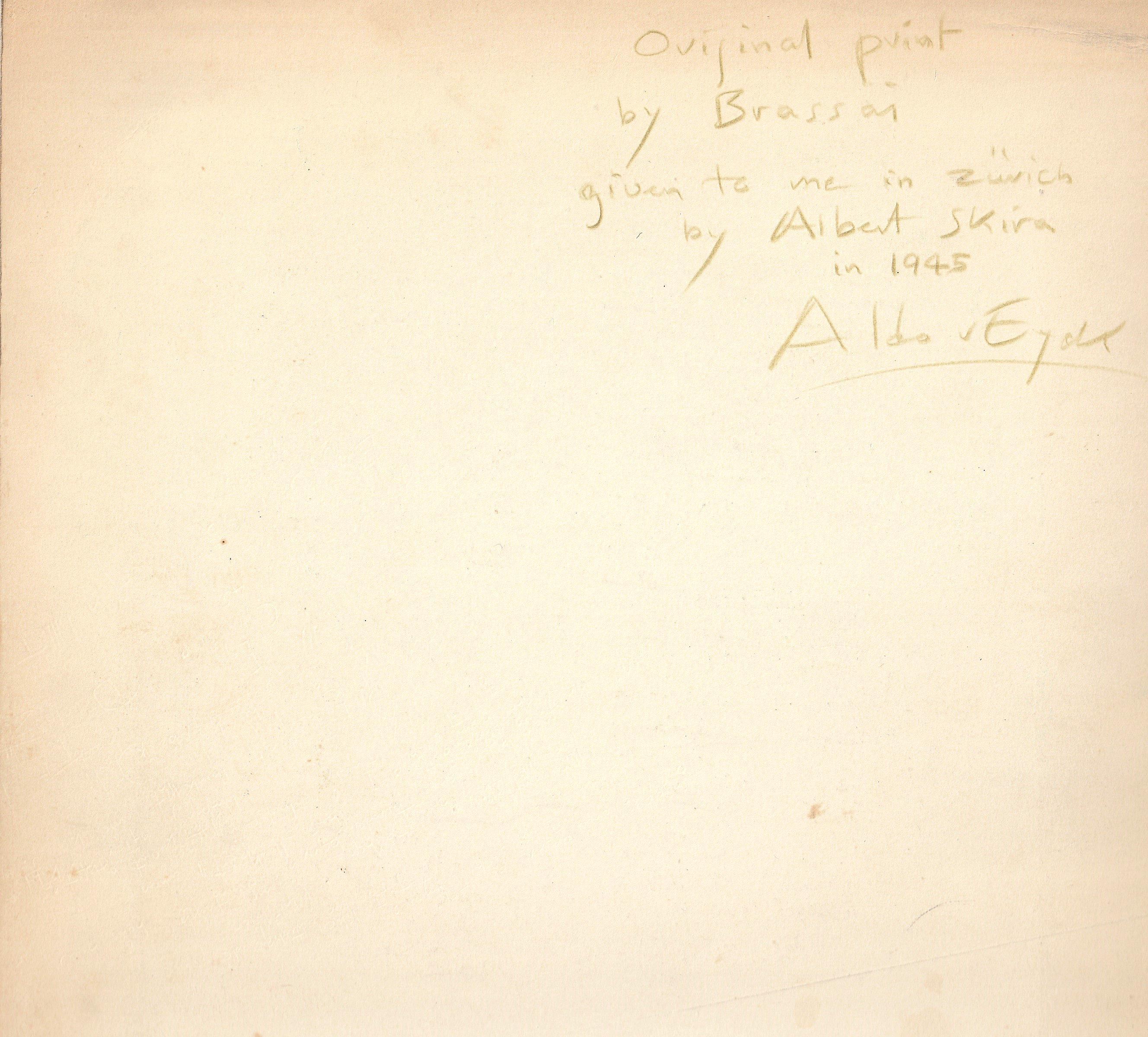 with the annotation by Aldo van Eyck 'Original print by Brassai given to me in Zürich by Albert Skira in 1945 Aldo v Eyck’ on the reverse of the cardboard backing, gelatin silver print, printed 1932/1933, 29 x 23 cm.