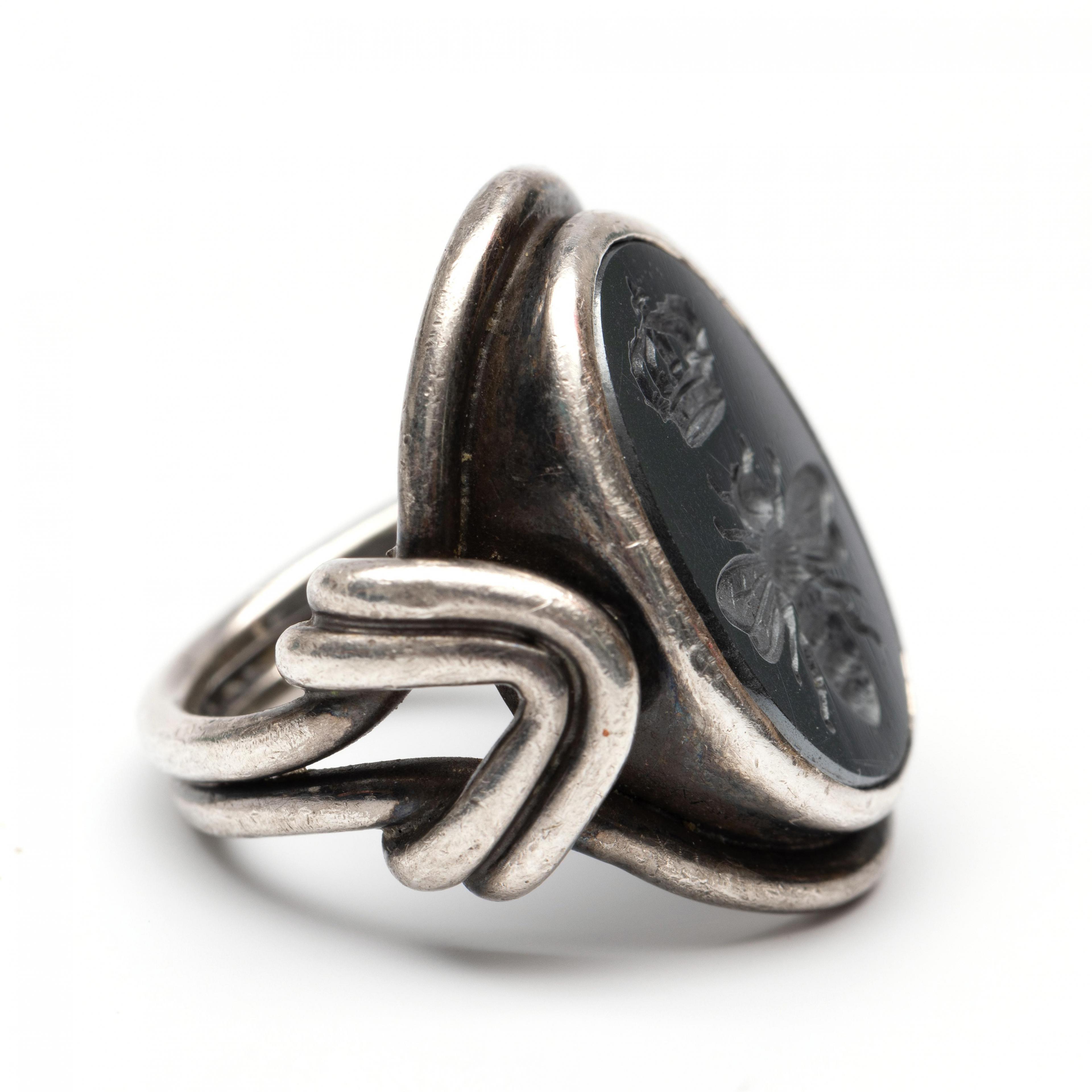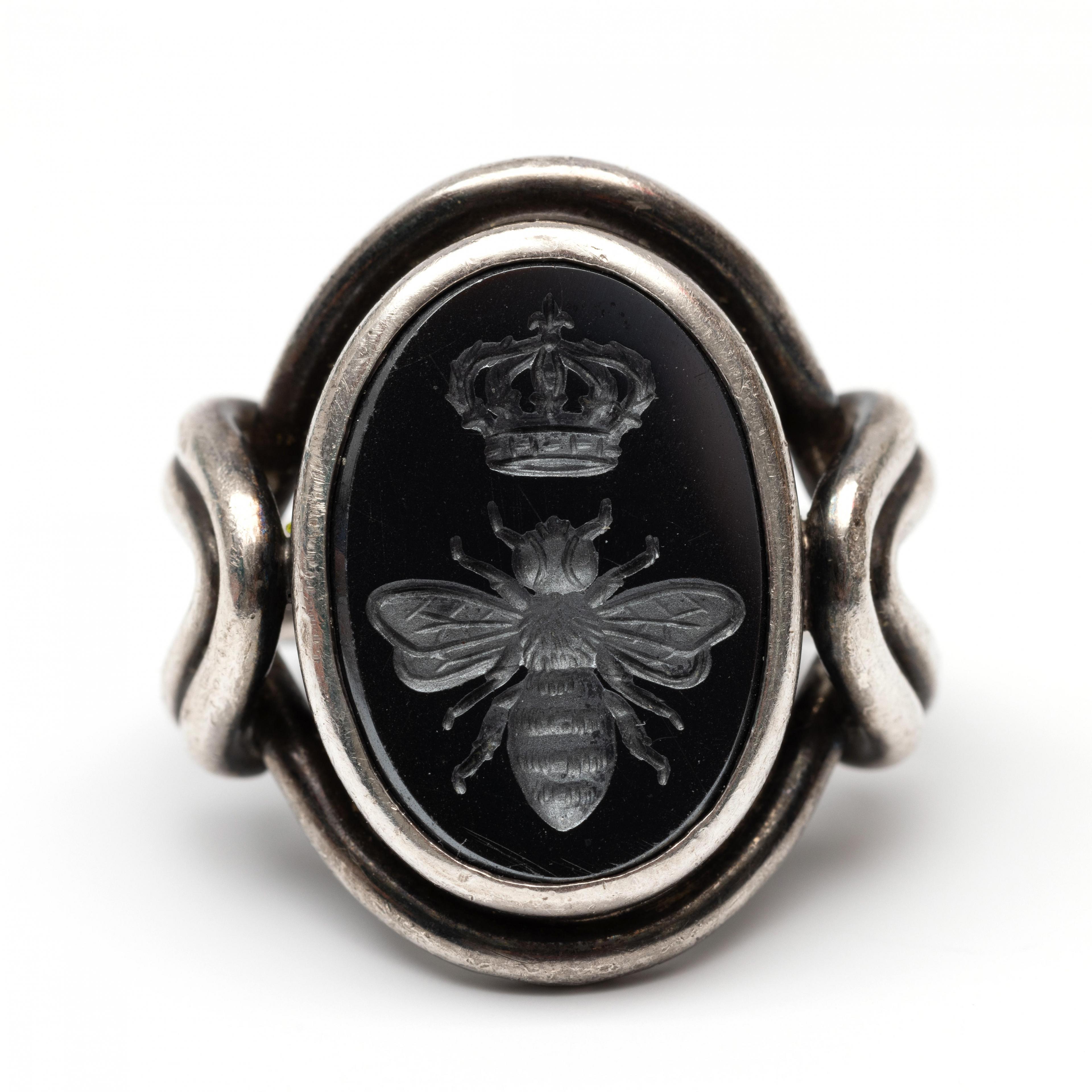 Charles Greig, silver ring. Set with an intaglio of hematite (approx. 16 x 11.5 mm), engraved with a bee above which a crown. Not signed but with digital report by Charles Greig & Son, South Africa.