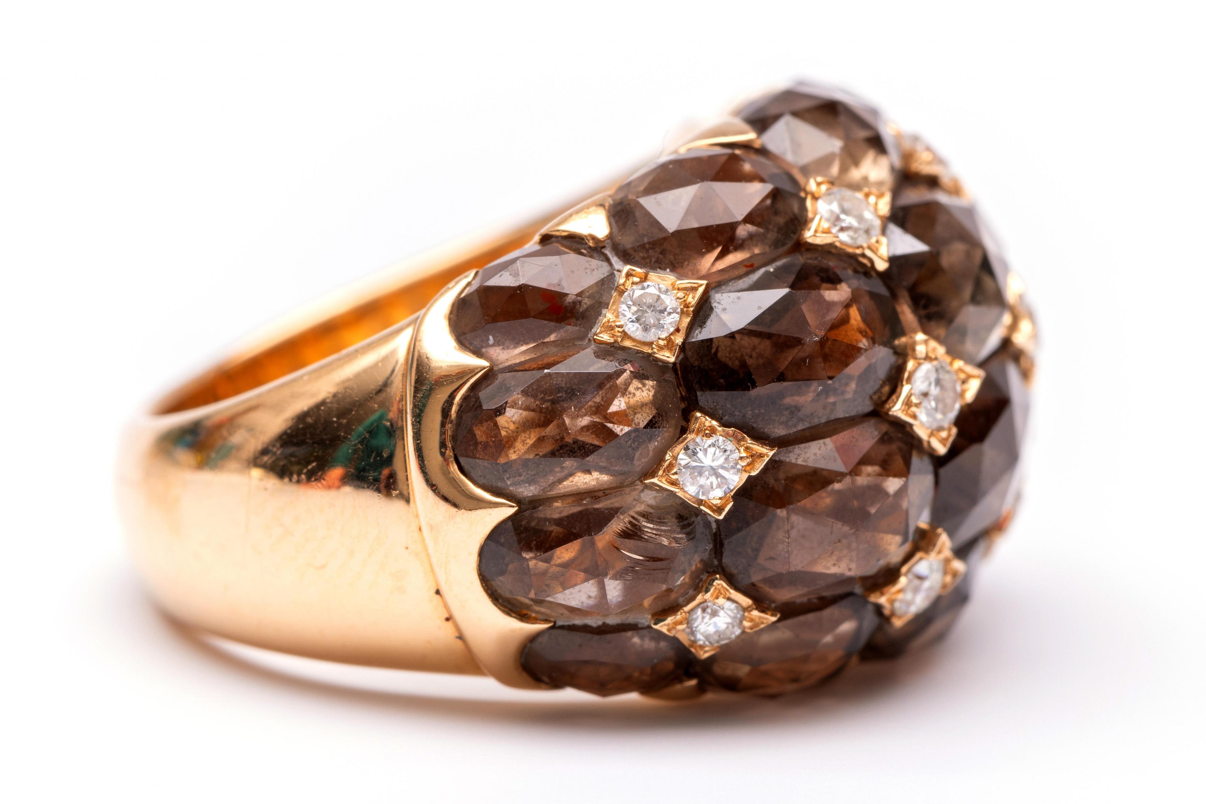 Charles Greig, 18 k. rose gold bombé ring. The top set with oval rose-cut smoky quartz, between which small brilliant-cut diamonds with a total weight of approx. 0.32 ct. Not signed but with digital report by Charles Greig & Son, South Africa.