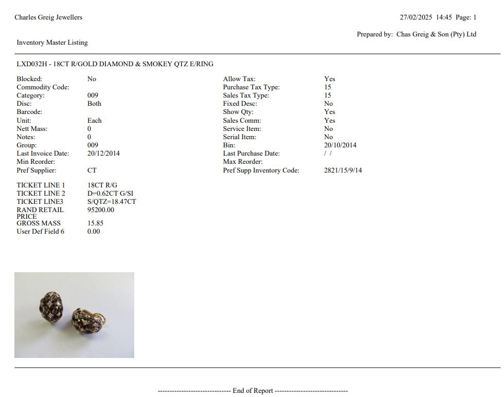 De bovenzijde bezet met ovale roosgeslepen rookkwarts, in grootte aflopend vanuit het midden, waartussen kleine briljant geslepen diamanten met een totaalgewicht van ca. 0.32 ct. Niet gesigneerd maar met digitaal rapport van Charles Greig & Son, Zuid - Afrika.