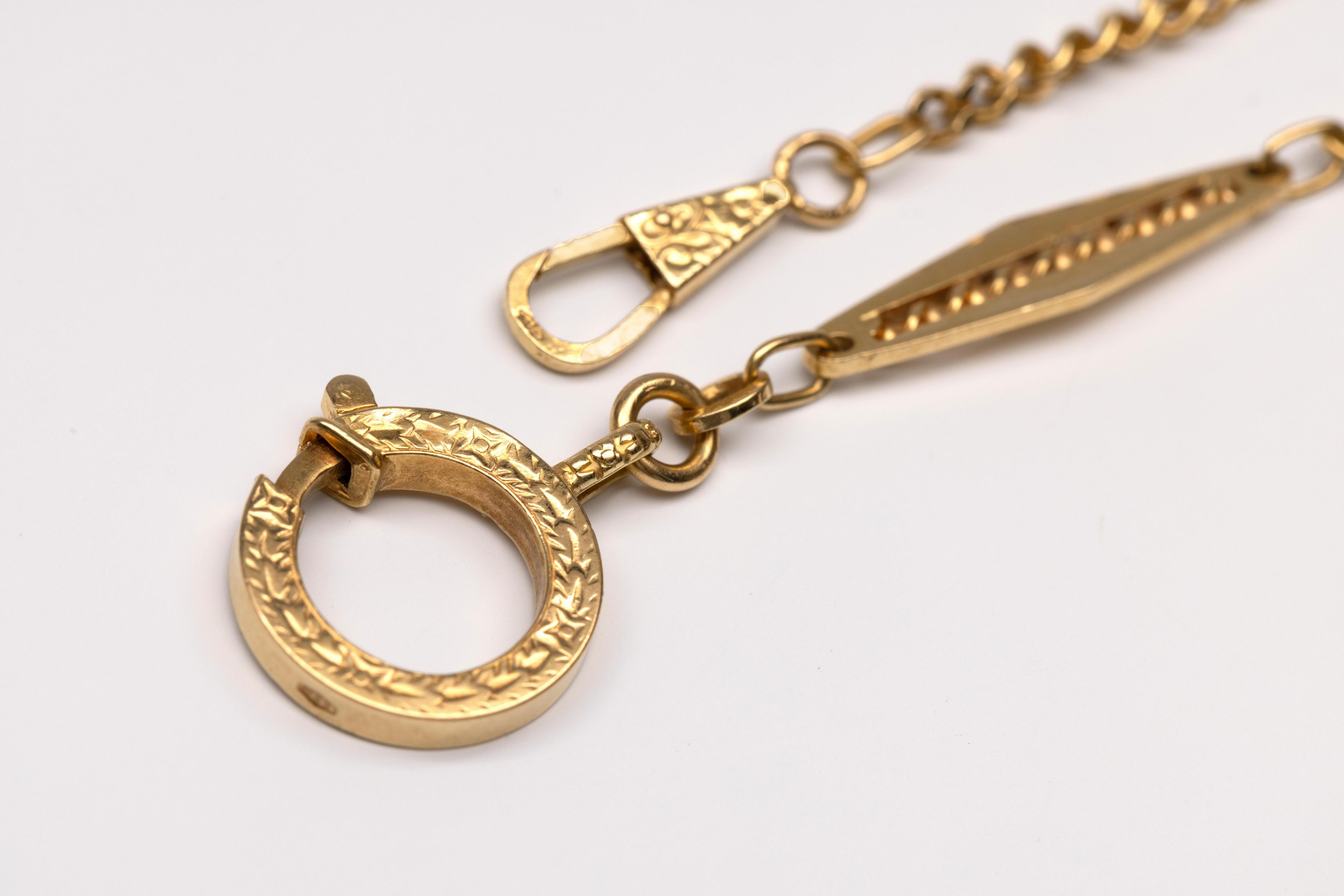 Gold watch chain, made of diamond-shaped links with twisted wire, alternating with a piece of curb link. The spring ring and snap hook richly engraved with floral and leaf motifs.