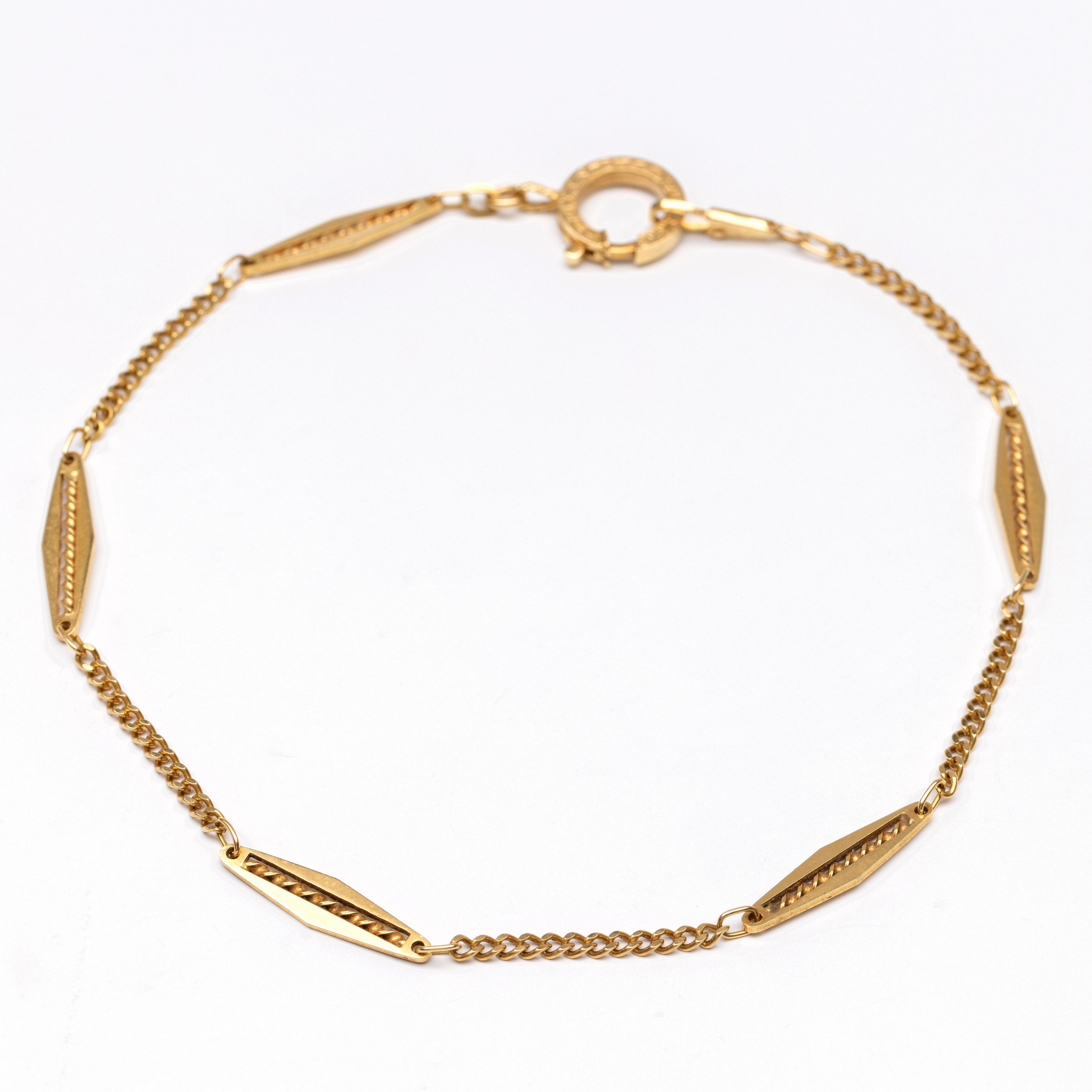 opgebouwd uit ruitvormige schakels waarin torsdraad, afgewisseld met een stukje gourmet schakel. De veerring en musketonhaak rijkelijk gegraveerd met bloem-en bladmotieven
