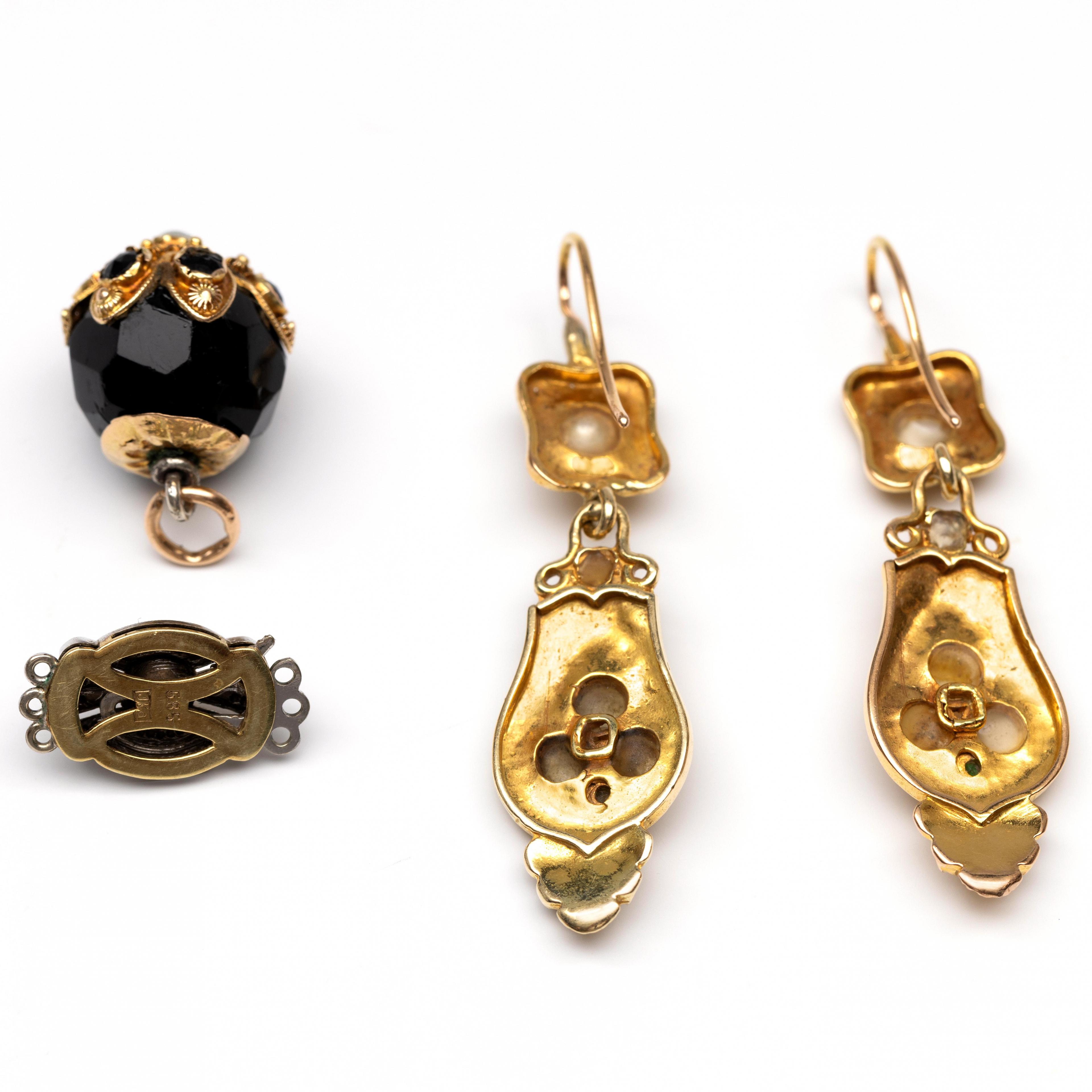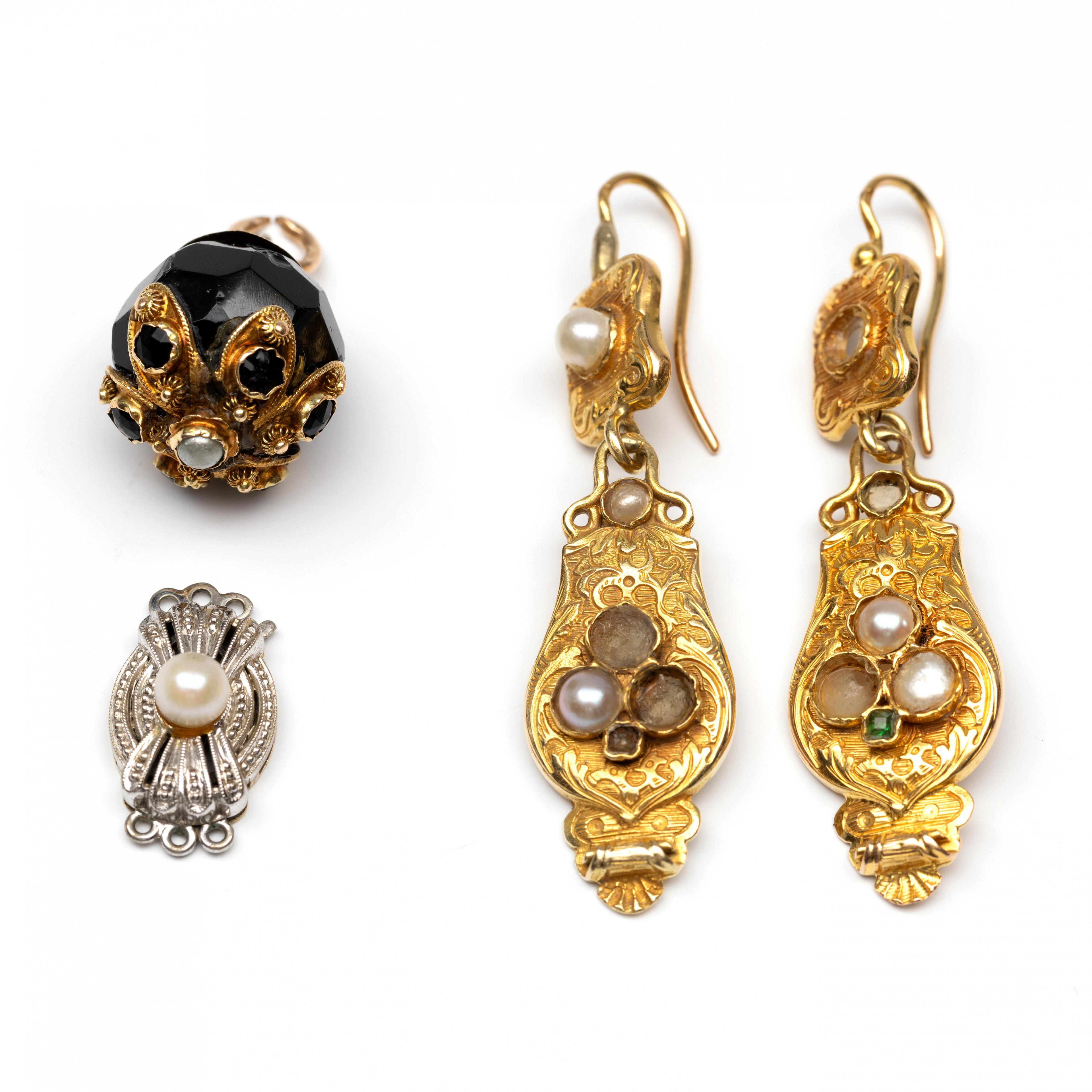 18k gold earrings, set with split-pearls and green paste, engraved with rocailles, floral motifs, and line engraving. Herwith a pendant, originally a hat pin, with black glass and a pearl, decorated with cannetille, and a white and yellow gold box clasp set with a cultured pearl.