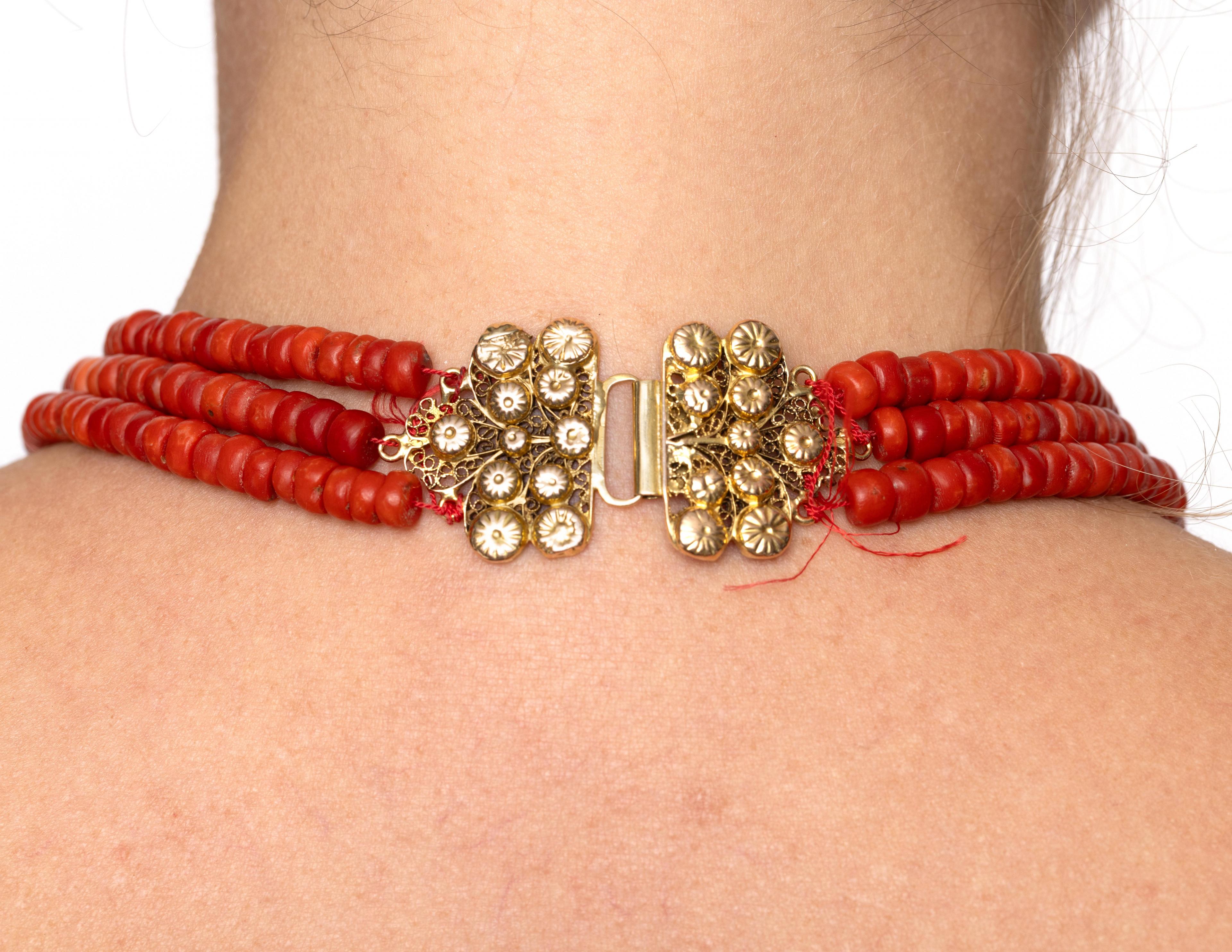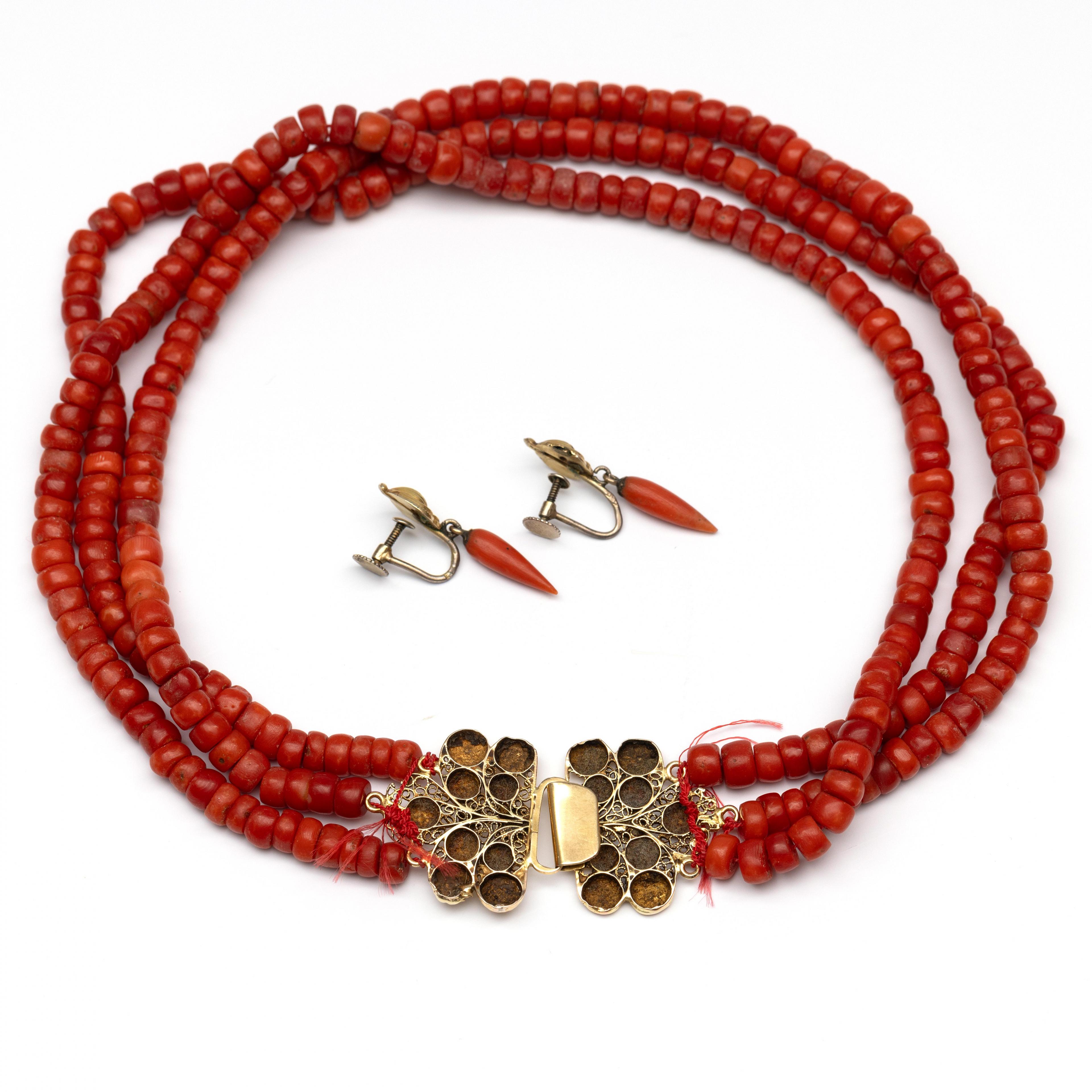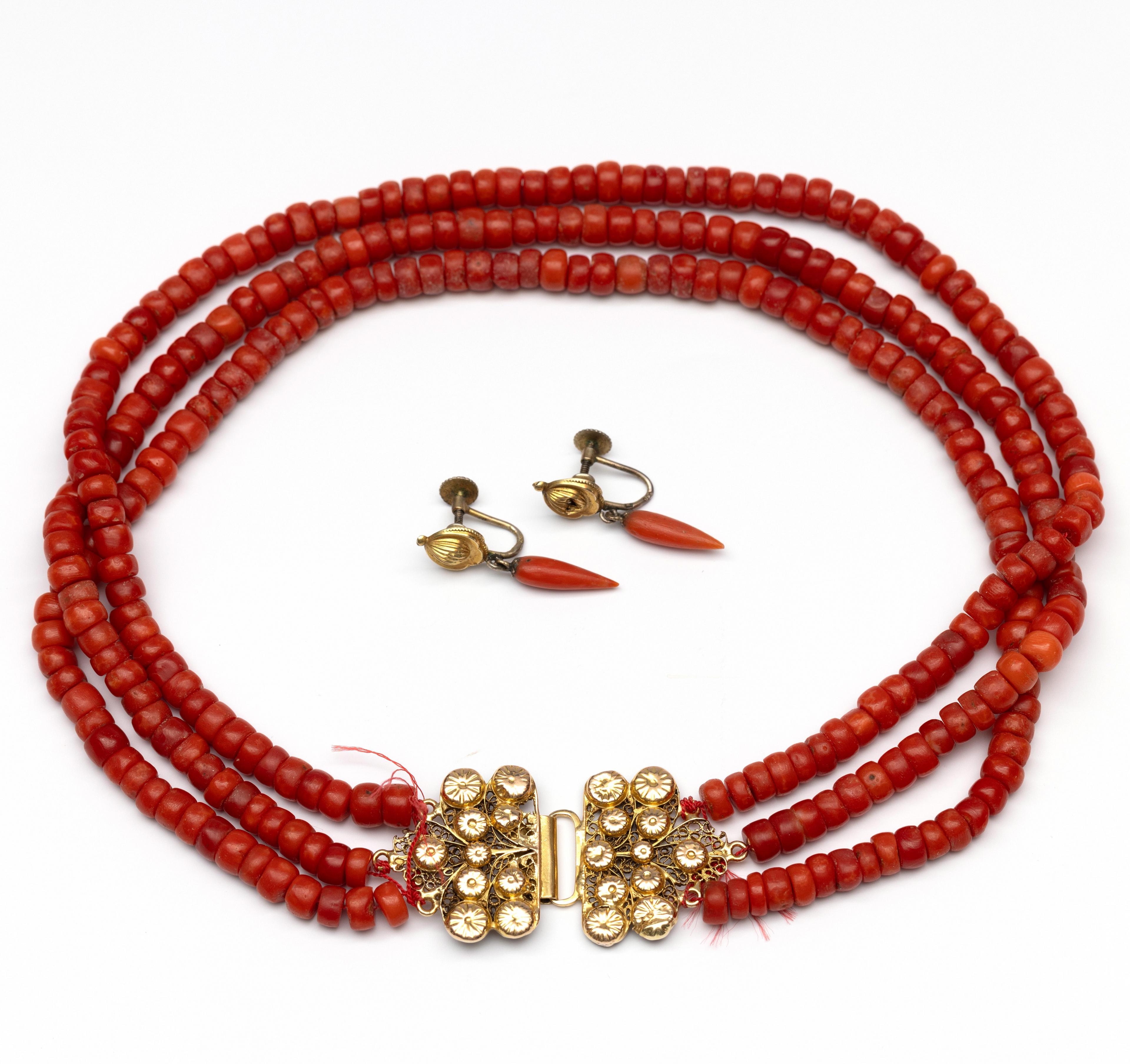 South - Beveland, Zeeland, coral necklace consisting of three strands of barrel-shaped beads (approx. 6 mm), on a 14 k. gold hook, decorated with filigree and rosettes (25 x 50 mm). Herewith a pair of gold on silver ear screws a drop of coral