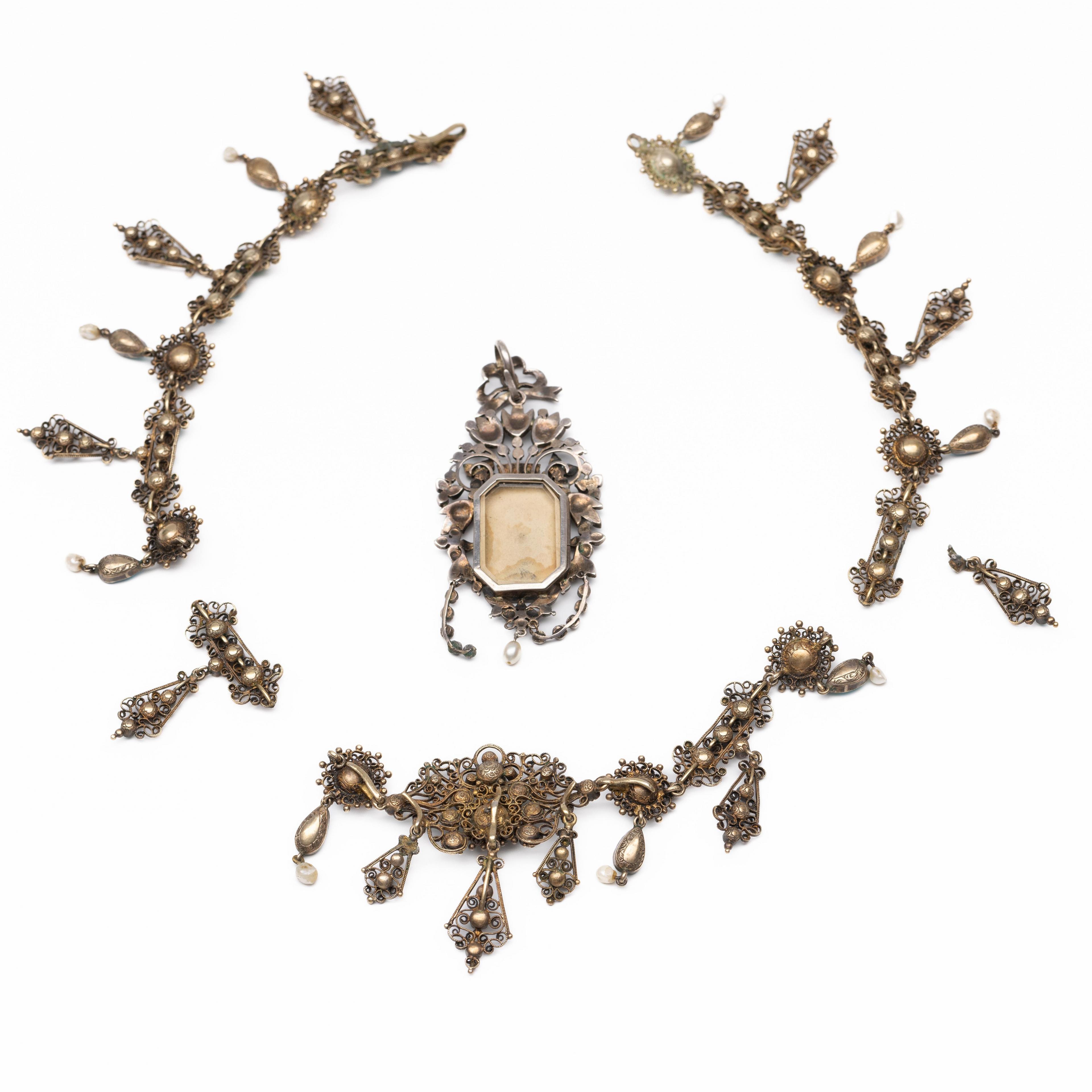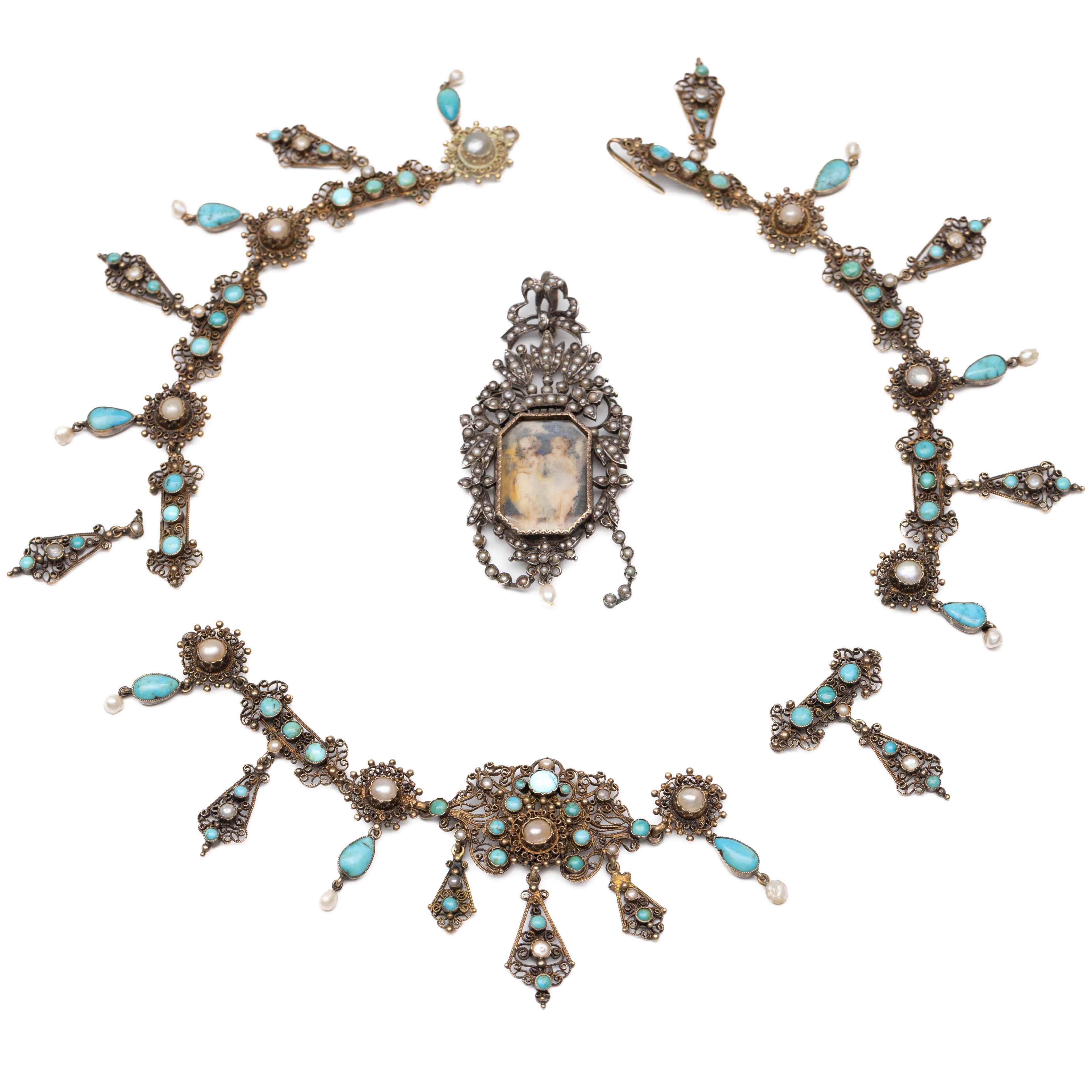 Silver pendant, 19th century. Centrally set with a miniature painting depicting two putti in a red gold bezel, surrounded by floral motifs and garlands set with small split-pearls. An oval pearl dangles loosely at the bottom. The bow-shaped bail is set with pearls. Herewith a gold plated silver necklace with rectangular ornaments and rosettes of filigree, adorned with drops, ending in a central ornament adorned with three drops. The whole is set with split-pearls and turquoise. The reverse gilded and features engraved scrollwork.