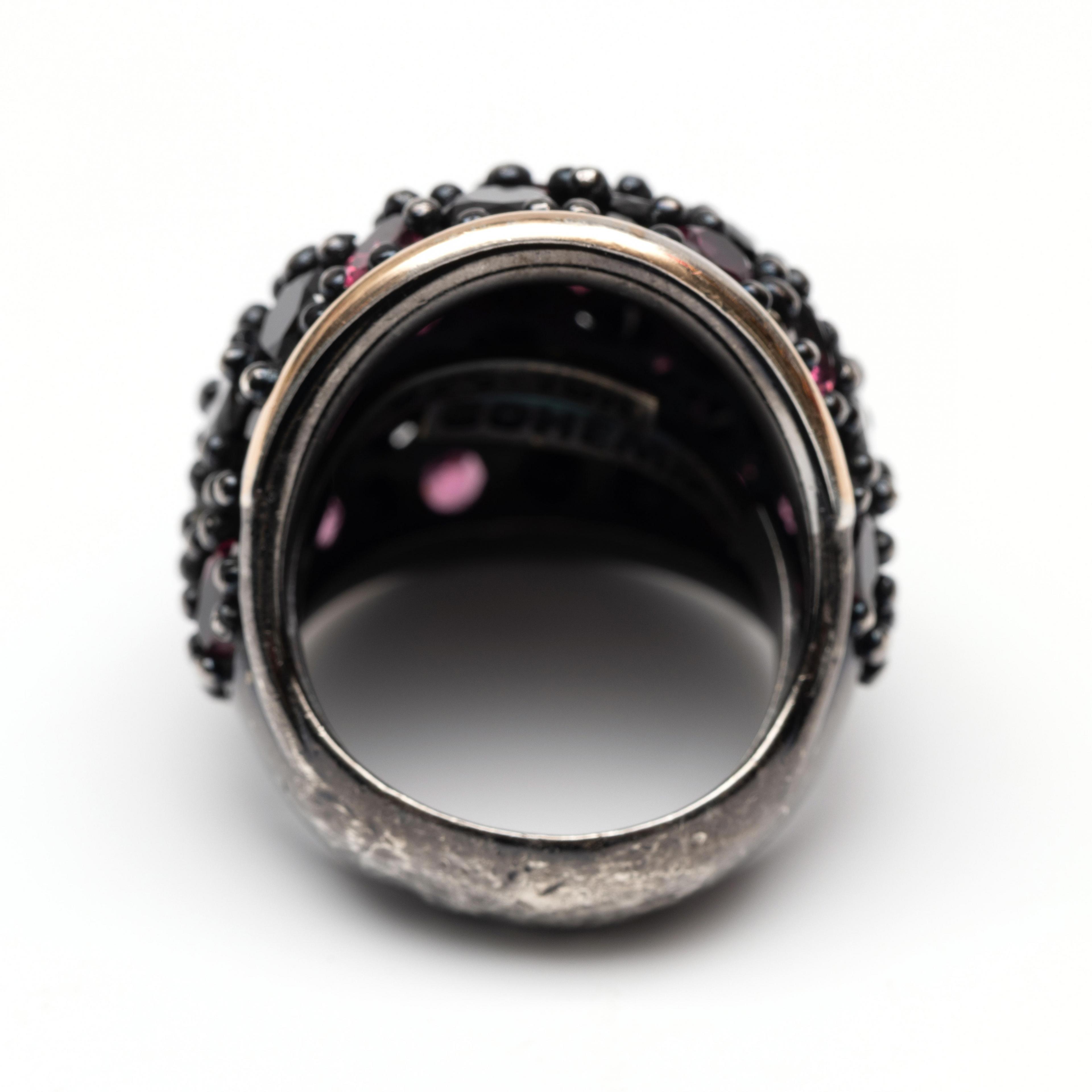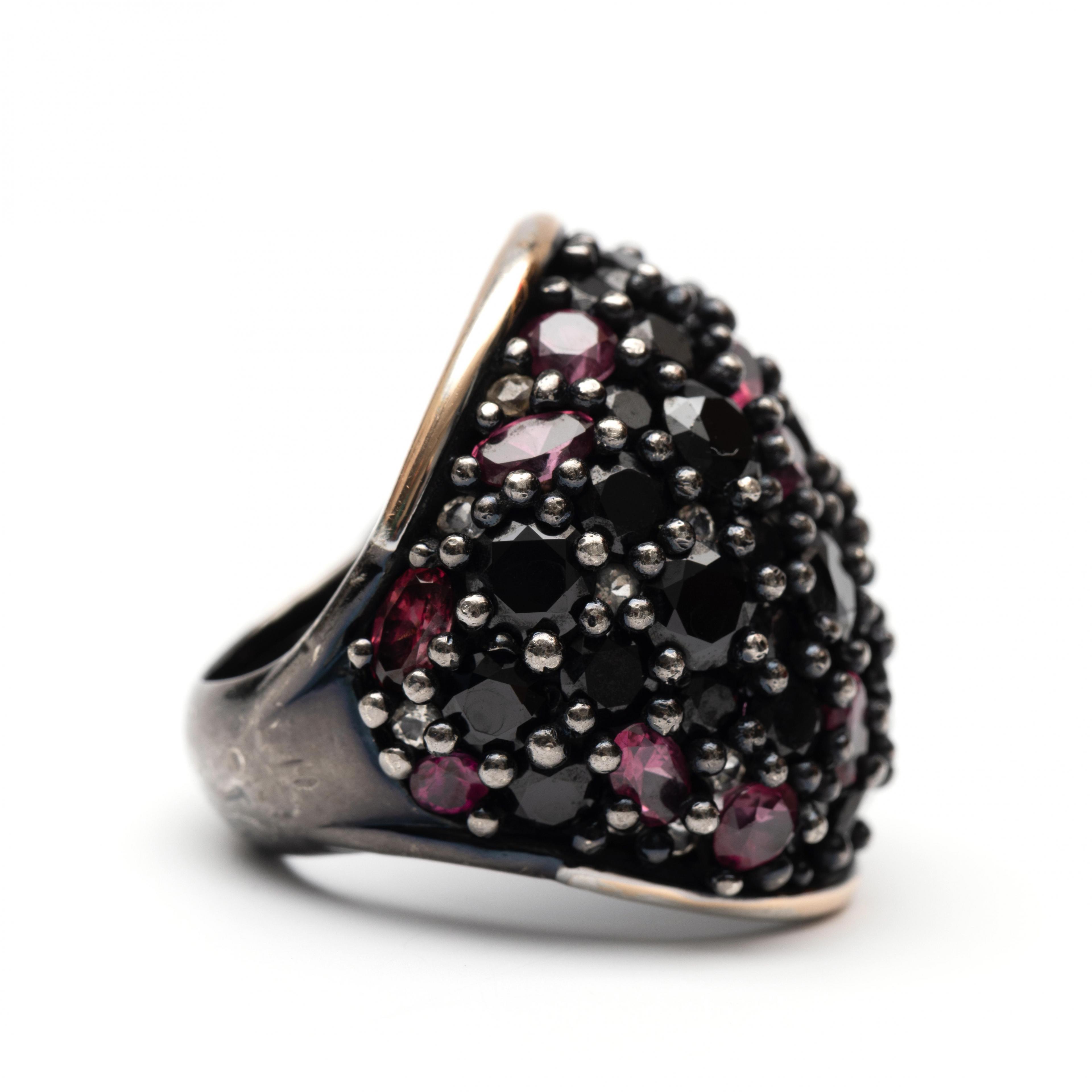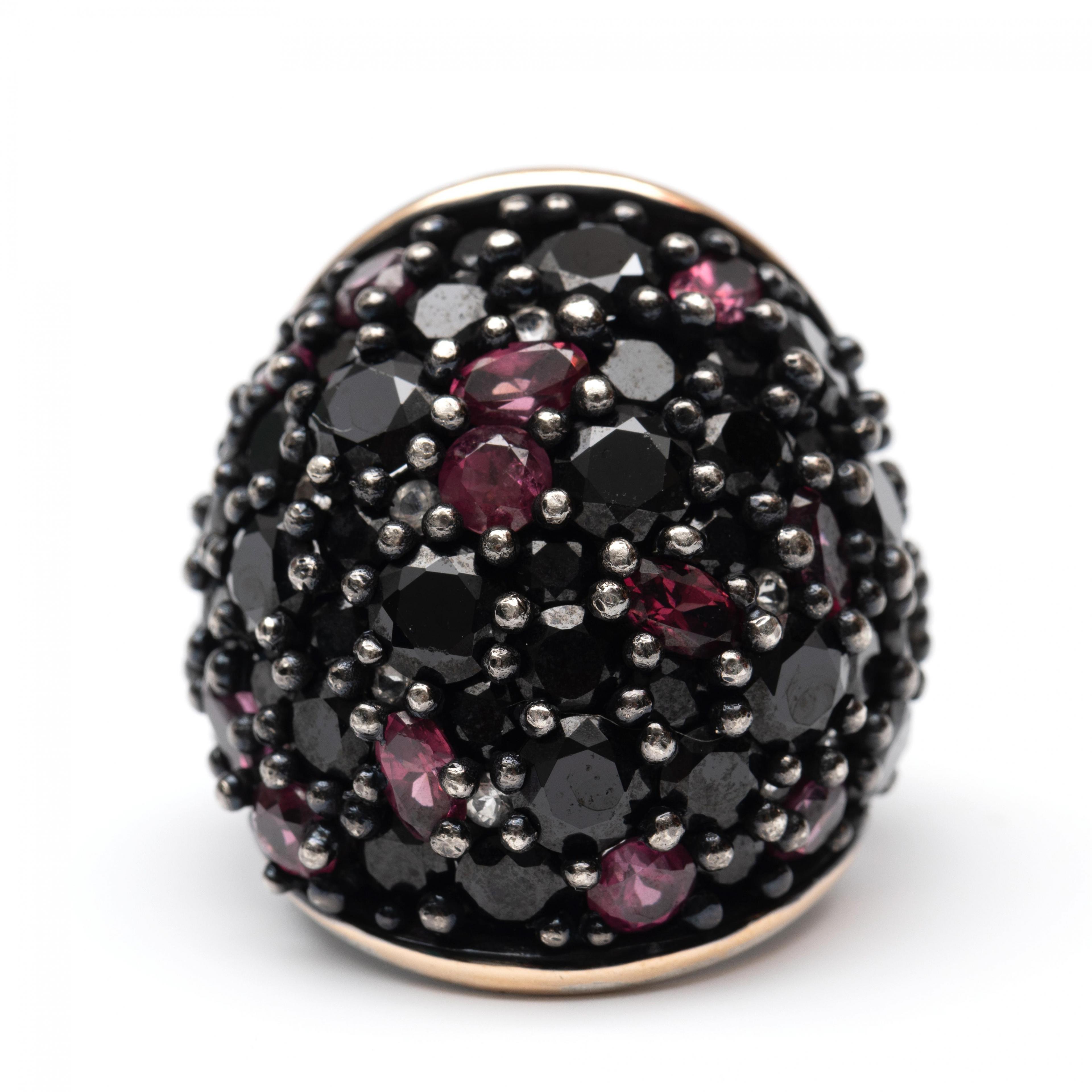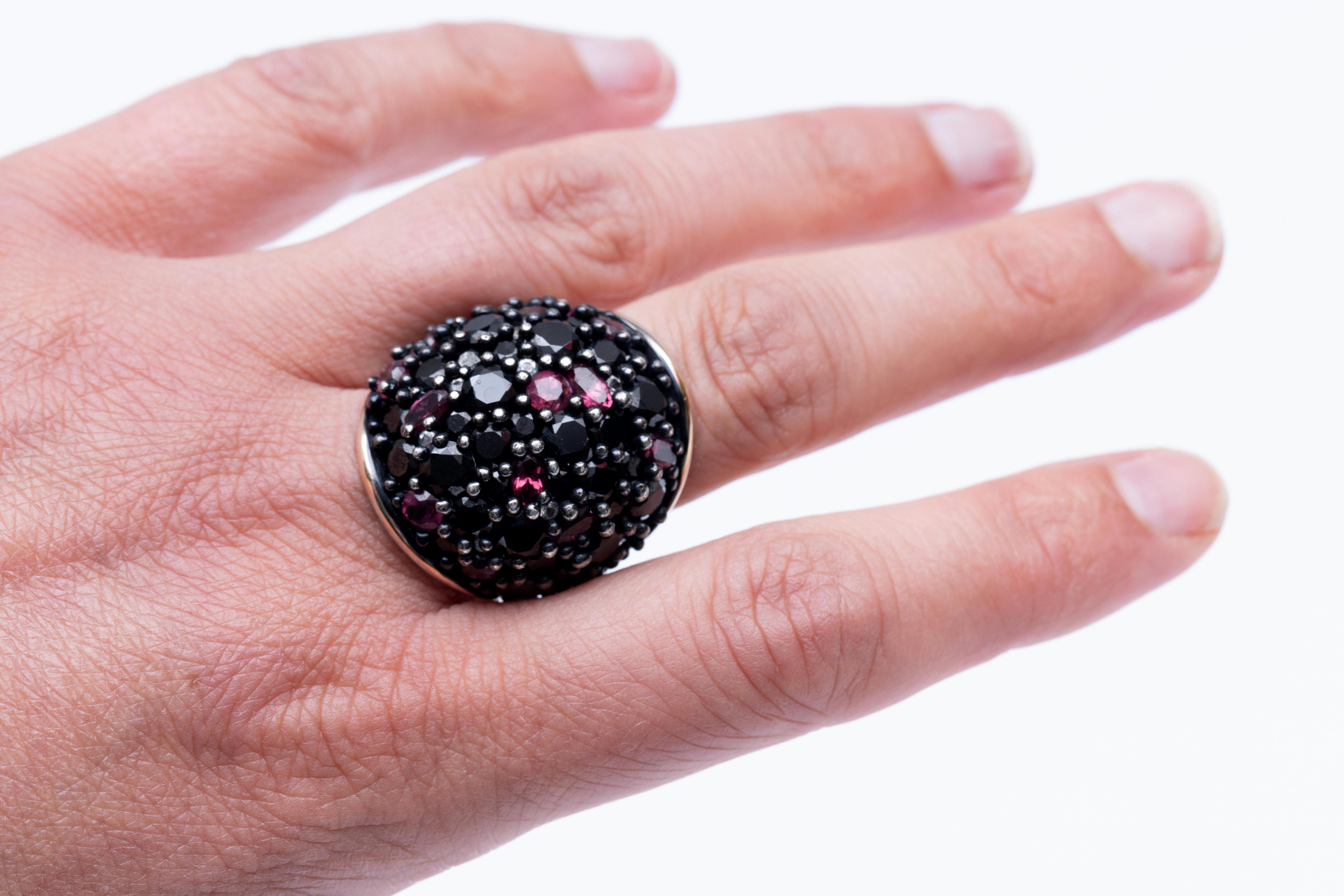 Silver with 18 k. white gold bombé ring. The top is set with faceted onyx, pink tourmaline and imitation diamond
