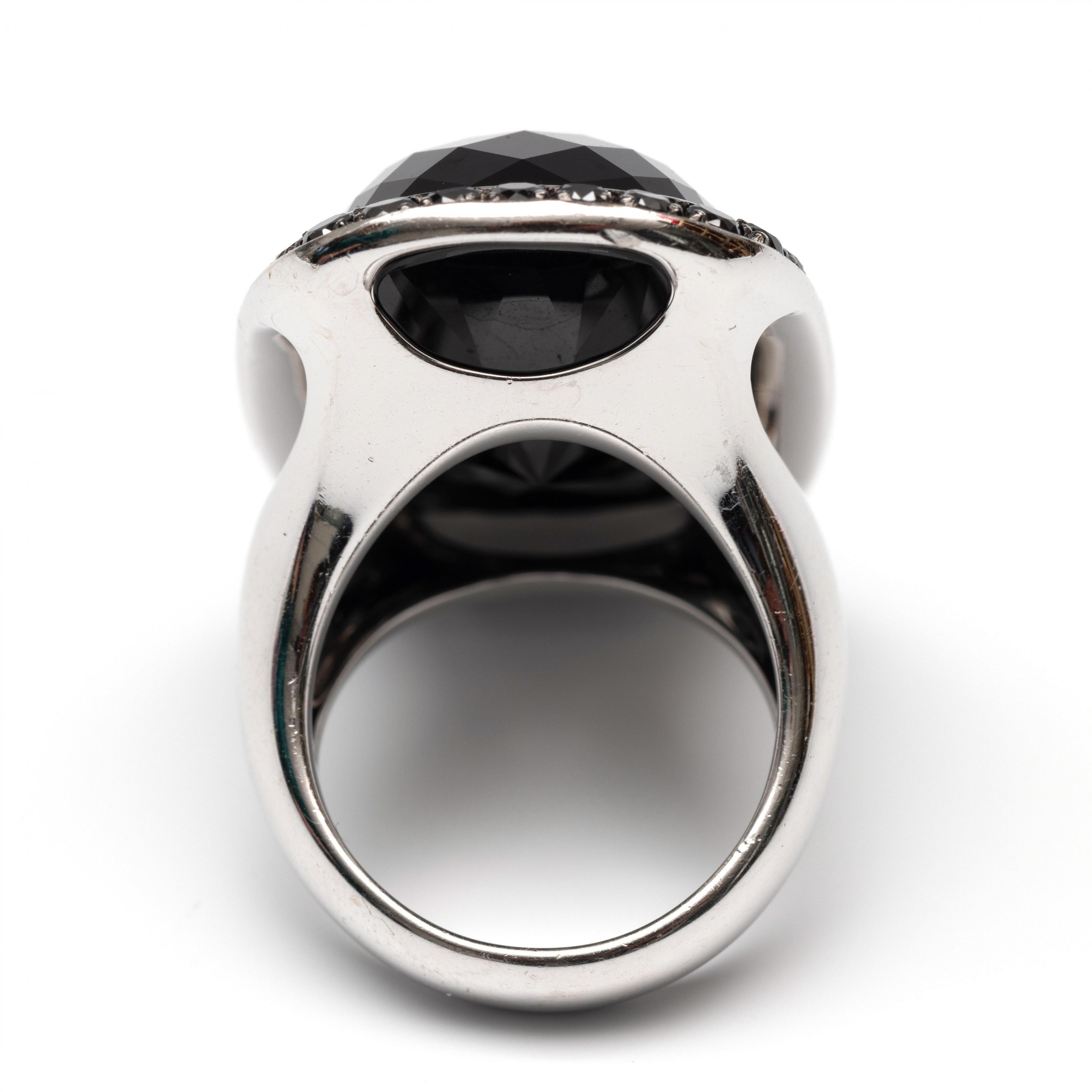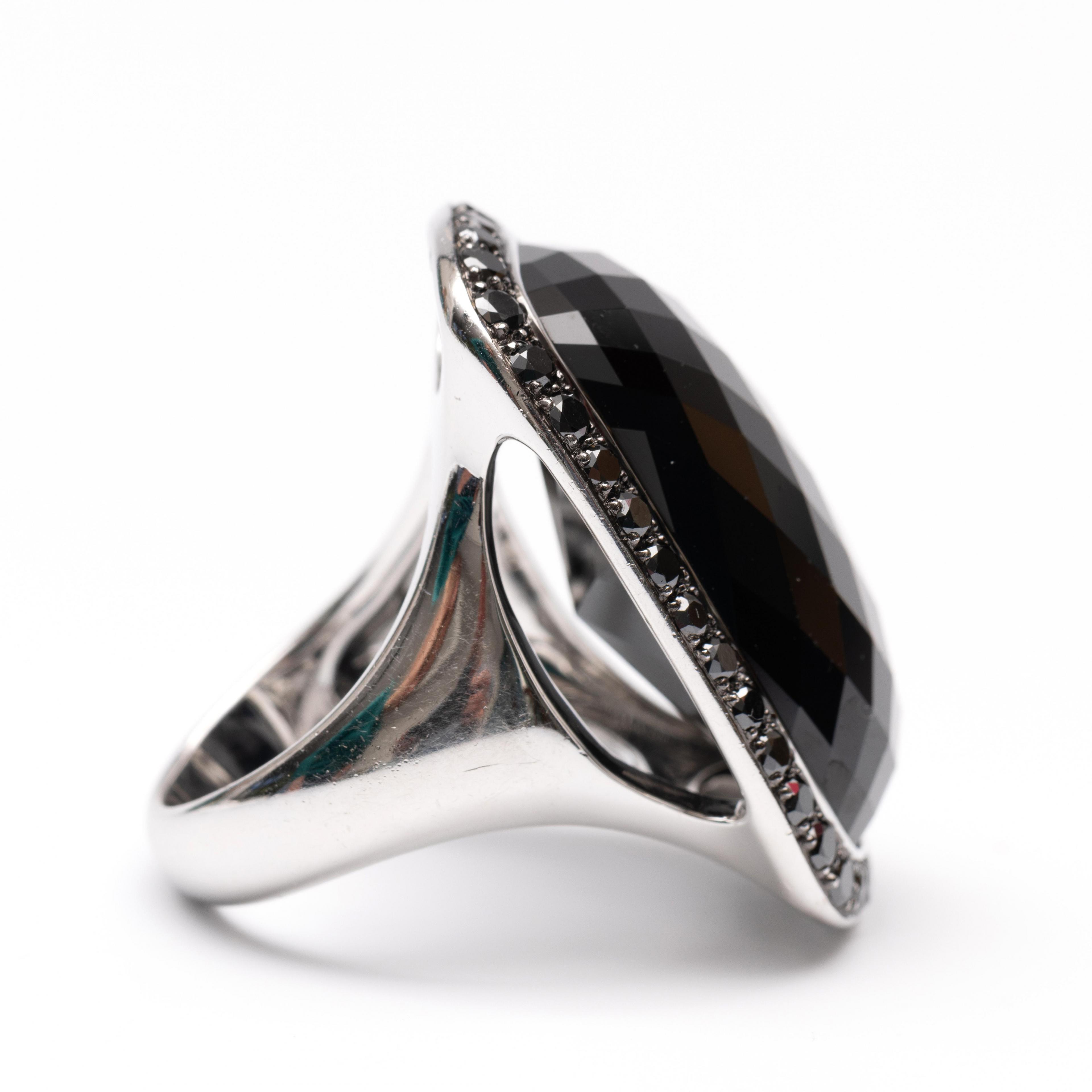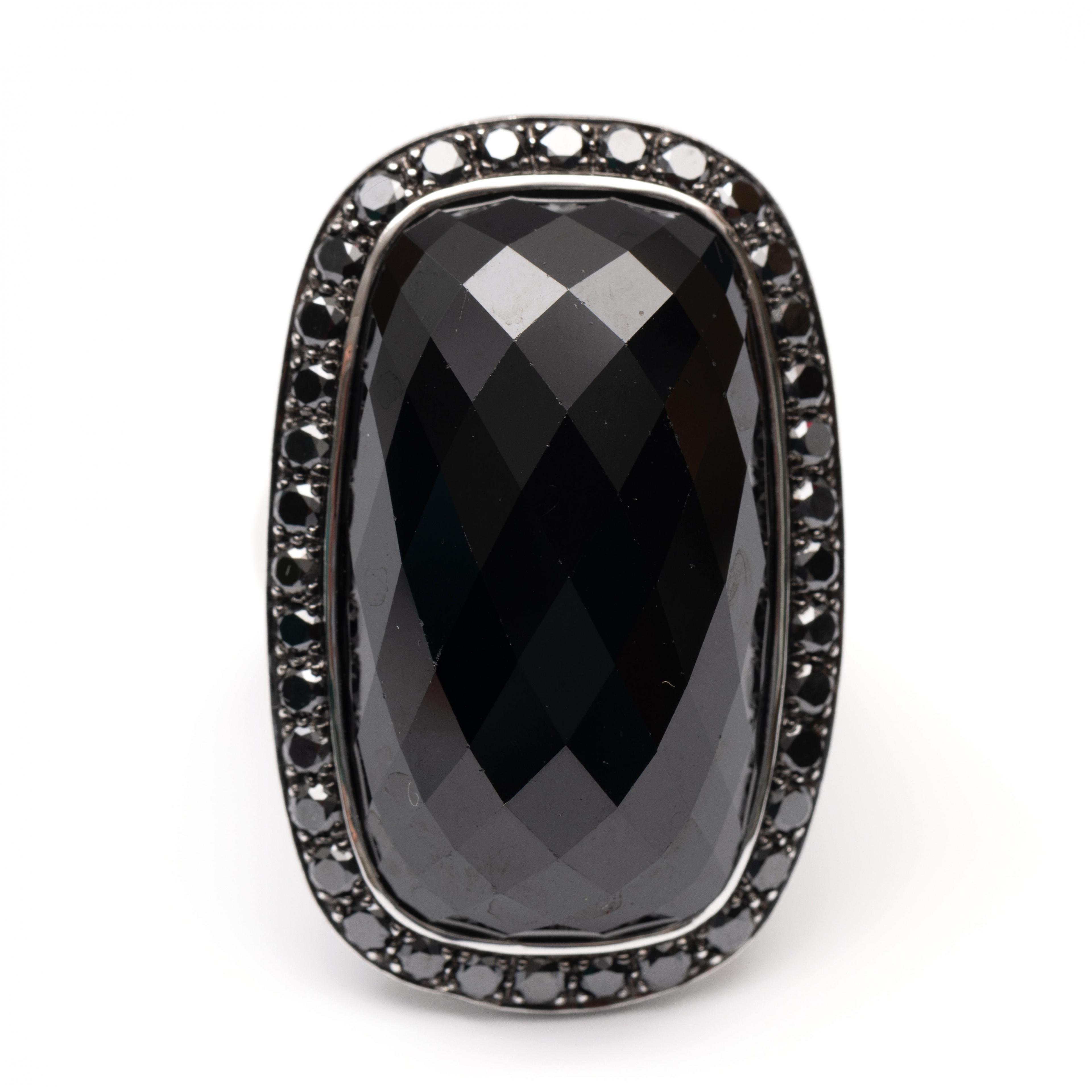 18 k. White gold ring, centrally set with a rectangular checkerboard cut onyx (approx. 29 x 16 mm) in an entourage of black round faceted diamonds with a total weight of approx. 1.00 ct.