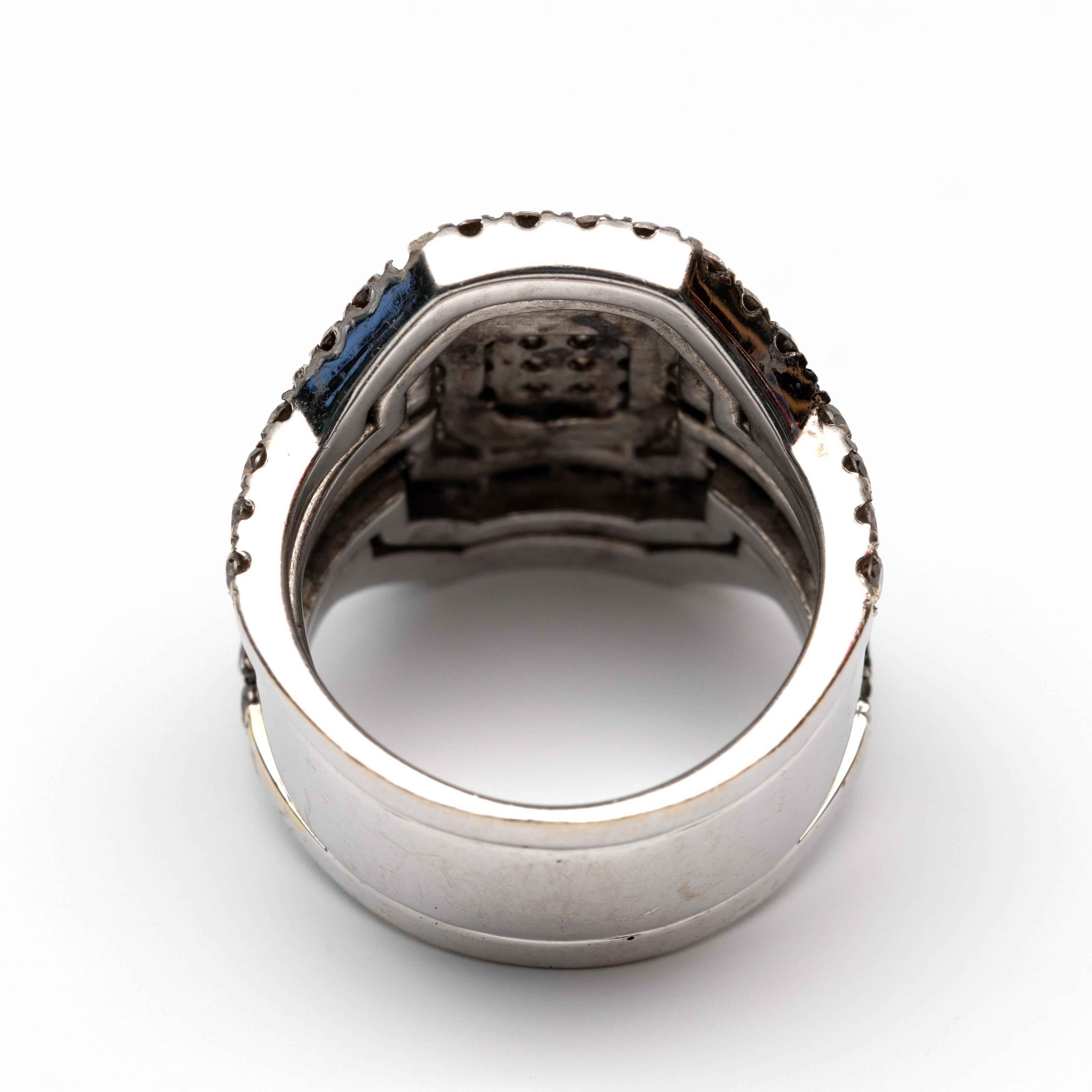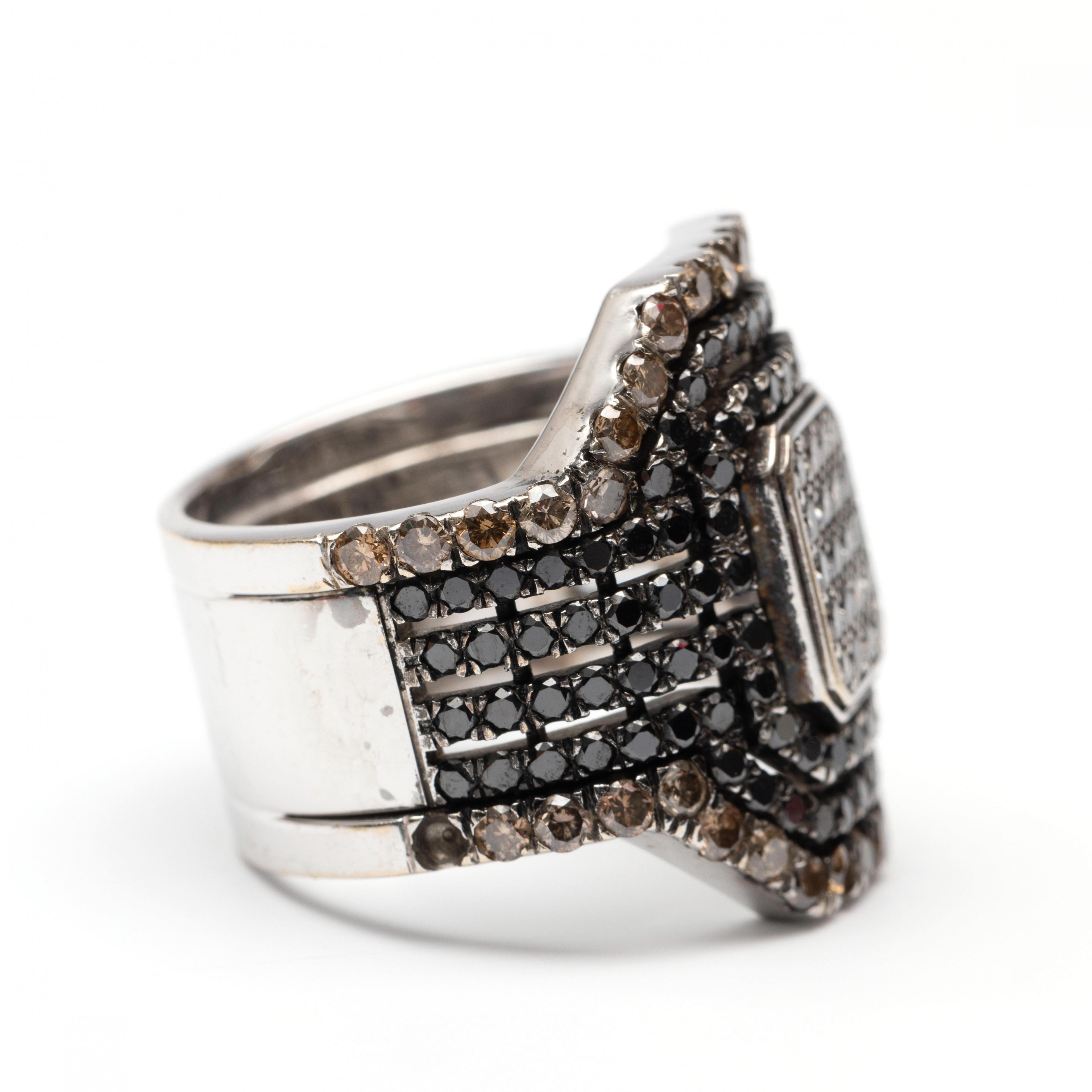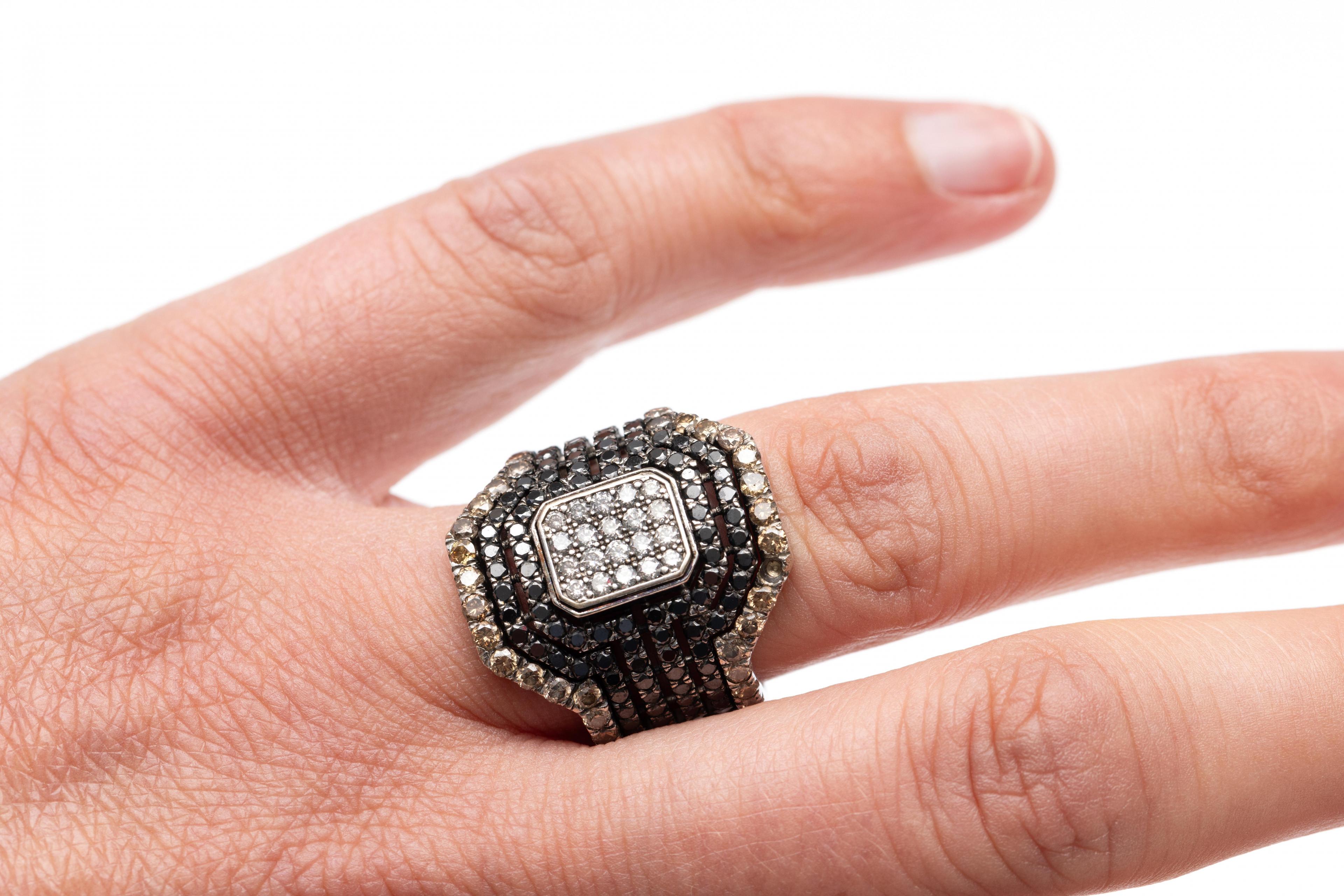 Centraal met achthoekig applique pavé bezet met witte briljant geslepen diamant, waaromheen vier banen bezet met ronde gefacetteerde zwarte diamant, de buitenste banen met briljant geslepen bruine diamant (twee missen). Totaal gewicht diamant ca. 2.40 ct.